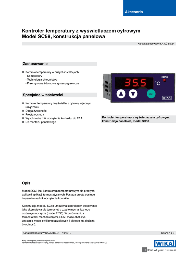 Akcesoria Kontroler temperatury z wyświetlaczem cyfrowym Model SC58, konstrukcja panelowa Karta katalogowa WIKA AC 85.24 Zastosowanie ■■ Kontrola temperatury w dużych instalacjach: - Kompresory - Technologia chłodnictwa - Przemysłowe i domowe systemy grzewcze Specjalne właściwości ■■ Kontroler temperatury i wyświetlacz cyfrowy w jednym urządzeniu ■■ Długa żywotność ■■ Prosta obsługa ■■ Wysoki wskaźnik obciążenia kontaktu, do 12 A ■■ Do montażu panelowego Kontroler temperatury z wyświetlaczem cyfrowym, konstrukcja panelowa, model SC58 Opis Model SC58 jest kontrolerem temperaturowym dla prostych aplikacji aplikacji termostatycznych. Posiada prostą obsługę i wysoki wskaźnik obciążenia kontaktu. Konstrukcja modelu SC58 umożliwia kontrolerowi stosowanie jako alternatywa dla termometru czysto mechanicznego o zdalnym odczycie (model TF58). W porównaniu z termostatami mechanicznymi, SC58 może obsłużyć znacznie więcej cykli przełączających i dlatego ma dłuższą żywotność. Karta katalogowa WIKA AC 85.24 ∙ 10/2012 Karty katalogowe podobnych produktów: Termometry rozszerzalnosciowy, wersja panelowa; modele TF58, TF59; patrz karta katalogowa TM 80.02 Strona 1 z 3 Wersja standardowa Rozmiar nominalny w mm Wymiary przednie: 62 x 28 mm Wymiary montażowe: 58.2 x 25.2 mm Schemat połączeń Model SC58.024 Element sensora Termometr rezystancyjny Pt100 (standard) lub PTC (wybór za pomocą menu oprogramowania) 12 (2.2) A 250 V~ Zakres pomiarowy Pt100: -80 … +400 °C PTC: -50 … +130 °C K1 Dokładność pomiaru ±1 K lub ±0.5 % zakresu pomiarowego (większa wartość ma zastosowanie) Wyświetlana wartość rzeczywista może być liczbą całkowitą lub mieć rozdzielczość 0.5 K lub 0.1 K Wyświetlacz 3-cyfrowy wyświetlacz LED, wysokość 13 mm, czerwony kolor Zasilanie Model SC58.230: AC 230 V, 50/60 Hz, pobór prądu max. 20 mA 12 ... 24 V ~ 12 ... 36 V = F1 Model SC58.230 Model SC58.024: AC 12 ... 24 V, DC 16 ... 36 V, pobór prądu max. 30 mA Wyjście przełączające Przekaźniki, obciążenie rezystancyjne12 A, (obciążenie indukcyjne 2.2 A), 250 V, kontakt przełączający 12 (2.2) A 250 V~ Podłączenia elektryczne Zaciski śrubowe dla przewodu do 1.5 mm2 K1 Obudowa Tworzywo, czarne Waga ok. 200 g Stopień ochrony Panel przedni IP 50 (do montażu panelowego) Zaciski IP 00 F1 230 V ~ Opcja montażu Montaż panelowy z uchywtem montażowym Dopuszczalne warunki otoczenia Temperatura przechowywania: -20 … +70 °C Temperatura pracy: 0 … 50 °C Wilgotność względna: max. 75 %, bez kondensacji Zgodność CE ■■ Dyrektywa EMC 2004/108/EG, EN 61326 emisja (grupa 1, klasa B) i odporność na zakłócenia (aplikacje przemysłowe) ■■ Dyrektywa niskonapięciowa 2006/95/EG, EN 60730-1 i EN 60730-2-9 Strona 2 z 3 Karta katalogowa WIKA AC 85.24 ∙ 10/2012 14054367.01 Wymiary w mm Informacje wymagane do zamówienia Wersja przyrządu 10/2012 PL based on 10/2012 GB Model SC58.230 (AC 230 V) Model SC58.024 (AC 12 ... 24 V lub DC 16 ... 32 V) Kod zamówienia 14054712 14054713 Informacje wymagane do zamówienia Do zamówienia opisanego produktu wystarczające jest podanie kodu zamówienia. © 2012 WIKA Alexander Wiegand SE & Co. KG, wszystkie prawa zastrzeżone. Specyfikacje podane w niniejszym dokumencie przedstawiają stan konstrukcyjny w momencie publikacji. Zastrzegamy sobie prawo do wprowadzenia modyfikacji w specyfikacji i materiałach. Karta katalogowa WIKA AC 85.24 ∙ 10/2012 Strona 3 z 3 WIKA Polska spółka z ograniczoną odpowiedzialnością sp. k. Ul. Łęgska 29/35, 87-800 Włocławek Tel.: (+48) 54 23 01 100 Fax: (+48) 54 23 01 101 E-mail: [email protected] www.wikapolska.pl