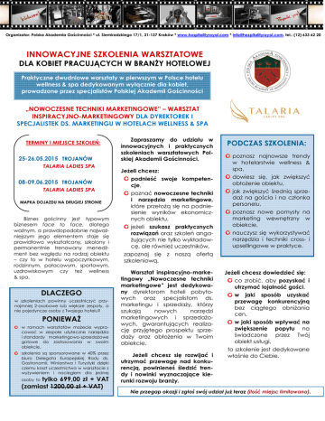 Organizator: Polska Akademia Gościnności * ul. Siemiradzkiego 17/1, 31-137 Kraków * www.hospitalityroyal.com * [email protected], tel.: (12) 633 62 20 INNOWACYJNE SZKOLENIA WARSZTATOWE DLA KOBIET PRACUJĄCYCH W BRANŻY HOTELOWEJ Praktyczne dwudniowe warsztaty w pierwszym w Polsce hotelu wellness & spa dedykowanym wyłącznie dla kobiet, prowadzone przez specjalistów Polskiej Akademii Gościnności „NOWOCZESNE TECHNIKI MARKETINGOWE” – WARSZTAT INSPIRACYJNO-MARKETINGOWY DLA DYREKTOREK I SPECJALISTEK DS. MARKETINGU W HOTELACH WELLNESS & SPA TERMINY I MIEJSCE SZKOLEŃ: 25-26.05.2015 TROJANÓW TALARIA LADIES SPA 08-09.06.2015 TROJANÓW TALARIA LADIES SPA MAPKA DOJAZDU NA DRUGIEJ STRONIE Biznes gościnny jest typowym biznesem face to face, dlatego ważnym, a prawdopodobnie najważniejszym jego elementem staje się prawidłowo wykształcony, szkolony i permanentnie trenowany menedżment bez względu na rodzaj obiektu – czy to w hotelu wypoczynkowym, rodzinnym, pałacowym, sportowym, uzdrowiskowym czy też wellness & spa. DLACZEGO w szkoleniach powinny uczestniczyć przynajmniej 2-osobowe lub większe zespoły, a nie pojedyncze osoby z Twojego hotelu? PONIEWAŻ w ramach warsztatów możecie wypracować w zespole użyteczne narzędzia i standardy marketingowo-sprzedażowe gotowe do zastosowania w swoim obiekcie, szkolenia są sponsorowane w 40% przez biuro Delegata Europejskiej Rady ds. Gastronomii, Winiarstwa i Turystyki dzięki czemu koszt uczestnictwa w warsztacie z wyżywieniem i noclegiem dla jednej tylko 699,00 zł + VAT (zamiast 1200,00 zł + VAT) osoby to Zapraszamy do udziału w innowacyjnych i praktycznych szkoleniach warsztatowych Polskiej Akademii Gościnności. Jeżeli chcesz: podnieść swoje kompetencje, poznać nowoczesne techniki i narzędzia marketingowe, które przełożą się na podniesienie wyników ekonomicznych obiektu, jeżeli szukasz praktycznych rozwiązań oraz szkoleń angażujących nie tylko wykładowcę, ale również uczestników, PODCZAS SZKOLENIA: poznasz najnowsze trendy w hotelarstwie wellness & spa, dowiesz się, jak zwiększyć obłożenie obiektu, jak zwiększyć średnią sprzedaż na gościa i na członka personelu, poznasz nowe pomysły na marketing wewnętrzny w obiekcie, nauczysz się wykorzystywać narzędzia i techniki cross- i upsellingowe w praktyce. zapoznaj się z naszą ofertą szkoleniową. Warsztat inspiracyjno-marketingowy „Nowoczesne techniki marketingowe” jest dedykowany dyrektorom hoteli pobytowych oraz specjalistom ds. marketingu i sprzedaży, którzy szukają nowych narzędzi marketingowych i sprzedażowych, gwarantujących realizację przyjętego prospektu sprzedaży oraz obłożenia w Twoim obiekcie. Jeżeli chcesz się rozwijać i utrzymać przewagę nad konkurencją, powinieneś śledzić trendy i nowinki wyznaczające kierunki rozwoju branży. Jeżeli chcesz dowiedzieć się: co zrobić, aby pozyskać i utrzymać lojalność gości, w jaki sposób uzyskać przewagę konkurencyjną bez ciągłego obniżania cen, w jaki sposób wpływać na zwiększenie popytu na świadczone przez Twój obiekt usługi, to szkolenie jest dedykowane właśnie do Ciebie. Nie przegap okazji i zgłoś swój udział już teraz (ilość miejsc limitowana). Organizator: Polska Akademia Gościnności * ul. Siemiradzkiego 17/1, 31-137 Kraków * www.hospitalityroyal.com * [email protected], tel.: (12) 633 62 20 Szkolenia Polskiej Akademii Gościnności są prowadzone przez praktyków z wieloletnim doświadczeniem w pracy w hotelarstwie indywidualnym w Polsce oraz za granicą. Dwudniowe szkolenia warsztatowe Polskiej Akademii Gościnności obejmują za każdym razem 12 godzin realizowanych w 10-osobowych grupach w systemie wykładowo-warsztatowym. Szkolenia przewidują aktywną formułę zajęciową opartą o ćwiczenia praktyczne, studia przypadków oraz pracę koncepcyjną w zespołach nad konstrukcją praktycznych narzędzi marketingowych i sprzedażowych do wykorzystania w swoim obiekcie. W cenę uczestnictwa wliczone są: 2 dni szkolenia warsztatów, / 12 godzin 1 nocleg w pokoju 2-os. w hotelu Talaria Ladies Spa, PROGRAM SZKOLENIA WARSZTATOWEGO DZIEŃ PIERWSZY DZIEŃ DRUGI (poniedziałek) (wtorek) 10:00-10:30 Rejestracja uczestników 10:30-12:30 Co się sprzedaje? Najnowsze trendy w hotelarstwie pobytowym z uwzględnieniem potrzeb klienta hotelu wellness & spa / Natasza Sallmann 12:30-12:45 Przerwa kawowa 12:45-14:15 Jak zwiększyć obłożenie obiektu? Segmentacja klienta hotelu wellness & spa w praktyce. Case study / Zbigniew Kowalski 14:15-15:15 Lunch zestaw materiałów seminaryjnowarsztatowych, 15:15-17:45 Wellinclusive, czyli pakiet usług w cenie – innowacyjna metoda konstrukcji oferty pobytowej w hotelu wellness & spa. Jak ją oferować i kiedy podejmować ryzyko stosowania wysokiej ceny na rynku. Warsztat / Natasza Sallmann certyfikat kompetencyjny. 19:00-20:00 szkoleniowy pakiet kulinarny (1 śniadanie, 2 lunche wellness, 1 kolacja, seminaryjny serwis kawowy), 07:30-08:30 Śniadanie 08:30-12:30 Jak zwiększyć średnią sprzedaż na gościa i na członka personelu? Warsztat: czynniki wpływające na sprzedaż w hotelu: - metody i narzędzia marketingu wewnętrznego w hotelu wellness & spa, - upselling i cross-selling w hotelu wellness & spa / Natasza Sallmann, Anna Lewit 12:30-12:45 Przerwa kawowa 12:45-14:45 Jak pozyskać lokalność gości? Stały gość ambasadorem marki. Case study / Zbigniew Kowalski 14:45-15:30 Lunch Kolacja TRENERZY / WYKŁADOWCY Natasza Sallmann – hotelarz, doradca K&P, wykładowca, specjalista w zakresie programowania usług i marketingu w hotelach pobytowych wg formuły well-inclusive i standardów zarządzania pobytem gościa. Autorka pierwszej polskiej książki o trendzie wellness „Megatrend wellness & spa w hotelarstwie i usługach wolnego czasu XXI w.” Anna Lewit – dyrektor hotelu, specjalista z zakresu coachingu i zarządzania relacjami. W bieżącym zarządzaniu stosuje zasadę together e
