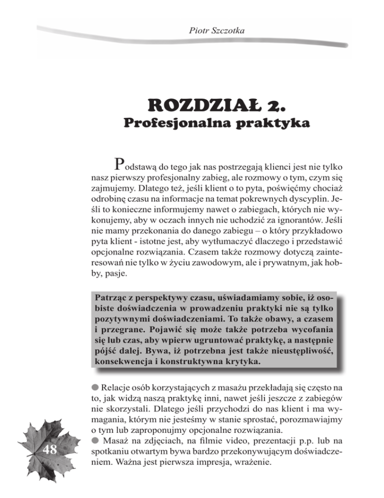Piotr Szczotka ROZDZIAŁ 2. Profesjonalna praktyka P odstawą do tego jak nas postrzegają klienci jest nie tylko nasz pierwszy profesjonalny zabieg, ale rozmowy o tym, czym się zajmujemy. Dlatego też, jeśli klient o to pyta, poświęćmy chociaż odrobinę czasu na informacje na temat pokrewnych dyscyplin. Jeśli to konieczne informujemy nawet o zabiegach, których nie wykonujemy, aby w oczach innych nie uchodzić za ignorantów. Jeśli nie mamy przekonania do danego zabiegu – o który przykładowo pyta klient - istotne jest, aby wytłumaczyć dlaczego i przedstawić opcjonalne rozwiązania. Czasem także rozmowy dotyczą zainteresowań nie tylko w życiu zawodowym, ale i prywatnym, jak hobby, pasje. Patrząc z perspektywy czasu, uświadamiamy sobie, iż osobiste doświadczenia w prowadzeniu praktyki nie są tylko pozytywnymi doświadczeniami. To także obawy, a czasem i przegrane. Pojawić się może także potrzeba wycofania się lub czas, aby wpierw ugruntować praktykę, a następnie pójść dalej. Bywa, iż potrzebna jest także nieustępliwość, konsekwencja i konstruktywna krytyka. 48 l Relacje osób korzystających z masażu przekładają się często na to, jak widzą naszą praktykę inni, nawet jeśli jeszcze z zabiegów nie skorzystali. Dlatego jeśli przychodzi do nas klient i ma wymagania, którym nie jesteśmy w stanie sprostać, porozmawiajmy o tym lub zaproponujmy opcjonalne rozwiązania. l Masaż na zdjęciach, na filmie video, prezentacji p.p. lub na spotkaniu otwartym bywa bardzo przekonywującym doświadczeniem. Ważna jest pierwsza impresja, wrażenie. Profesjonalna praktyka. Masaż, gabinet i pasja życia Pamiętam dobrze sytuację, kiedy zjawiła się na masażu kobieta, utrzymując, że przekonało ją zdjęcie, na którym pracuję z pacjentką ubraną w podkoszulkę. Nowa pacjentka miała problemy z kręgosłupem, na wstępnym masażu zrobiłem co mogłem, ale poprzez ubranie. Z czasem jednak nabrała pewności i odrobinę zaufania, jak się później okazało, jej życiową tragedią były blizny pooparzeniowe. Dziś korzysta z całościowych zabiegów, bez kompleksów, nie tylko akceptując masaż, ale i własne ciało. Promocja zabiegów czy ukierunkowany marketing N a początku drogi - w praktyce zawodowej - dla mnie osobiście wyszukany, specjalistyczny marketing prawie nie istniał. Jeśli to tylko było możliwe starałem się promować masaż, przedstawiać go w różny sposób, zwłaszcza laikom. Były otwarte spotkania i do tych spotkań właśnie ostatnio wracam. Oczywiście 49 Piotr Szczotka to według dzisiejszych standardów także marketing. Zaczyna się od wypowiedzianego świadomie lub nieświadomie w zwyczajnej rozmowie stwierdzenia: zajmuję się masażem lub jestem masażystą i (…). Podobnie jest z podaniem pierwszej wizytówki. Z punktu widzenia rynku usług i wiedzy akademickiej tak to pewnie wygląda. Jednak marketing w tak osobistym kontakcie z klientami, jakim jest masaż lub metody pracy z ciałem, rządzi się nieco innymi zasadami. Najistotniejsze są rzeczowe informacje i odpowiednie postępowanie, bo mimo że pracujemy w sytuacji wolnorynkowej i działalności usługowej, to nasz klient jest przede wszystkim pacjentem przychodzącym po pomoc. A z tym wiążą się różne zależności, od wypracowania poczucia bezpieczeństwa, zapracowania sobie na zaufanie, po konsekwencje wykonywanej praktyki: prawne, administracyjne i konsumenckie. B ez względu na to czy mamy podejście do naszej praktyki jako do części konwencjonalnej medycyny, współczesnej fizjoterapii, czy metod naturalnych - pomijając istniejące podziały - po prostu wykonujemy konkretne usługi dla ludności, a te wymagają przejrzystej sytuacji. Prowadząc przez kilka lat fora internetowe na temat masażu na kilku stronach, portalach, serwisach oraz czynnie uczestnicząc w wielu kongresach i publikując artykuły zauważyłem, iż powtarzają się ciągle pytania - także w stopniu podstawowym - dotyczące prowadzenia profesjonalnych gabinetów, współpracy oraz szeroko rozumianego marketingu usług. W dalszym ciągu nie ma stosownych publikacji na powyższe 50 tematy, dostosowanych do specyfiki zawodów, gdzie w grę wchodzi przede wszystkim czynnik ludzki oraz bezpośredni dotykowy kontakt. Podstawowe zagadnienia przedstawiane w szkołach na lekcjach lub w uczelniach dotyczące: biznesu, przedsiębiorczości, marketingu, wydają się dalekie od realnych potrzeb współcześnie działających gabinetów. Tematyka ta jest także przedsta- Profesjonalna praktyka. Masaż, gabinet i pasja życia wiana przez osoby z branży biznesu, które z kolei niejednokrotnie nie mają pojęcia o zabiegach. J rekomendacja osób trzecich ak się okazuje, mimo olbrzymich nakładów na różnego rodzaju reklamy, internet, fora, pozycjonowanie stron, nośniki video, spora część nowych klientów, to klienci z rekomendacji osób trzecich. Podane sugestie, przekonanie i bezpośrednia rekomendacja osób trzecich jest często momentem przełomowym w podjęciu decyzji o korzystaniu z zabiegów. Faktem jest, iż efekt bywa odwrotny, siła sugestii działa w obie strony. Jednak w tym przypadku skupmy się dalej na tych pacjentach, którzy za sprawą takich rekomendacji na zabieg przybyli. wizytówki Wizytówka powinna zawierać informacje podstawo- we, treściwe, rzetelnie, ale przede wszystkim uczciwie przedstawiać działalność jej właściciela. Opcjonalnie powinna ona informować o zakresie usług i w zależności od reprezentowanej dziedziny przedstawiać uprawnienia. (…) Kilka opcji wizytówek, to kilka otwartych drzwi. S pecjaliści od marketingu uważają, iż marketing bezpo średni zaczyna się od podania pierwszej wizytówki lub od pierwszej rozmowy na temat naszej profesji. Wizytówkę stanowi nasza tradycyjna wizytówka w postaci wydruku w wersji papierowej, jaką znamy od wielu dekad. Wizytówką jest także strona www w internecie lub też coraz częściej stoso