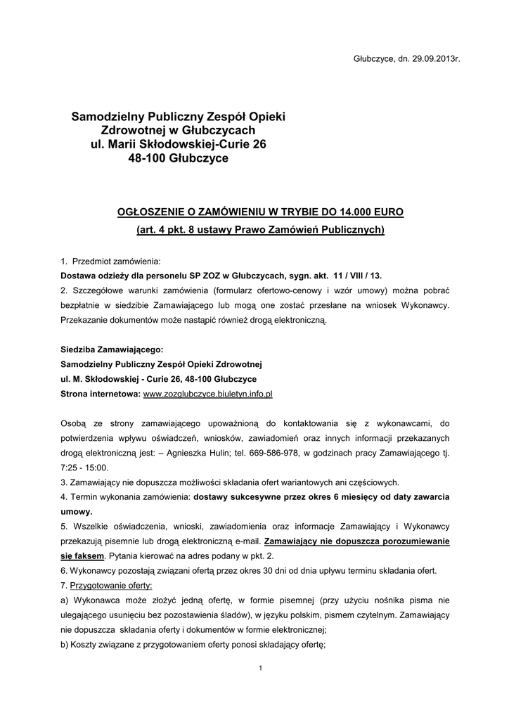 Głubczyce, dn. 29.09.2013r. Samodzielny Publiczny Zespół Opieki Zdrowotnej w Głubczycach ul. Marii Skłodowskiej-Curie 26 48-100 Głubczyce OGŁOSZENIE O ZAMÓWIENIU W TRYBIE DO 14.000 EURO (art. 4 pkt. 8 ustawy Prawo Zamówień Publicznych) 1. Przedmiot zamówienia: Dostawa odzieży dla personelu SP ZOZ w Głubczycach, sygn. akt. 11 / VIII / 13. 2. Szczegółowe warunki zamówienia (formularz ofertowo-cenowy i wzór umowy) można pobrać bezpłatnie w siedzibie Zamawiającego lub mogą one zostać przesłane na wniosek Wykonawcy. Przekazanie dokumentów może nastąpić również drogą elektroniczną. Siedziba Zamawiającego: Samodzielny Publiczny Zespół Opieki Zdrowotnej ul. M. Skłodowskiej - Curie 26, 48-100 Głubczyce Strona internetowa: www.zozglubczyce.biuletyn.info.pl Osobą ze strony zamawiającego upoważnioną do kontaktowania się z wykonawcami, do potwierdzenia wpływu oświadczeń, wniosków, zawiadomień oraz innych informacji przekazanych drogą elektroniczną jest: – Agnieszka Hulin; tel. 669-586-978, w godzinach pracy Zamawiającego tj. 7:25 - 15:00. 3. Zamawiający nie dopuszcza możliwości składania ofert wariantowych ani częściowych. 4. Termin wykonania zamówienia: dostawy sukcesywne przez okres 6 miesięcy od daty zawarcia umowy. 5. Wszelkie oświadczenia, wnioski, zawiadomienia oraz informacje Zamawiający i Wykonawcy przekazują pisemnie lub drogą elektroniczną e-mail. Zamawiający nie dopuszcza porozumiewanie się faksem. Pytania kierować na adres podany w pkt. 2. 6. Wykonawcy pozostają związani ofertą przez okres 30 dni od dnia upływu terminu składania ofert. 7. Przygotowanie oferty: a) Wykonawca może złożyć jedną ofertę, w formie pisemnej (przy użyciu nośnika pisma nie ulegającego usunięciu bez pozostawienia śladów), w języku polskim, pismem czytelnym. Zamawiający nie dopuszcza składania oferty i dokumentów w formie elektronicznej; b) Koszty związane z przygotowaniem oferty ponosi składający ofertę; 1 c) Oferta oraz wszystkie wymagane druki, formularze, oświadczenia składane wraz z ofertą wymagają podpisu osób uprawnionych do reprezentowania firmy w obrocie gospodarczym, zgodnie z aktem rejestracyjnym oraz przepisami prawa; d) Oferta i załączniki podpisane przez upoważnionego przedstawiciela wykonawcy wymagają załączenia właściwego pełnomocnictwa lub umocowania prawnego; e) Dokumenty winny być sporządzone zgodnie z zaleceniami oraz przedstawionymi przez zamawiającego wzorcami (załącznikami), winny zawierać informacje i dane określone w tych dokumentach; f) Poprawki w ofercie muszą być naniesione czytelnie oraz opatrzone podpisem osoby/osób podpisującej ofertę; g) Zaleca się by oferta była zszyta lub spięta. 8. Ofertę należy przesłać / złożyć w nieprzejrzystym opakowaniu / zamkniętej kopercie na adres zamawiającego: Samodzielny Publiczny Zespół Opieki Zdrowotnej ul. M. Skłodowskiej - Curie 26, 48-100 Głubczyce Sekretariat – III piętro do dnia 09.09.2013r. do godz. 11:00. Zaleca się, by oznakowanie oferty było następujące: Dostawa odzieży dla personelu SP ZOZ w Głubczycach, sygn. akt. 11 / VIII / 13. Nie otwierać przed 09.09.2013r. Godz. 11:10. Opatrzyć nazwą i adresem Wykonawcy. Termin i miejsce otwarcia ofert - w siedzibie zamawiającego: Samodzielny Publiczny Zespół Opieki Zdrowotnej ul. M. Skłodowskiej - Curie 26, 48-100 Głubczyce dnia 09.09.2013r. Godz. 11:10. 9. Otwarcie ofert jest jawne i nastąpi bezpośrednio po odczytaniu kwoty, którą Zamawiający zamierza przeznaczyć na sfinansowanie zamówienia. Podczas otwarcia zostaną podane następujące informacje: nazwa i siedziba Wykonawcy, którego oferta jest otwierana, cena, a także termin wykonania zamówienia. 10. Kryteria oceny ofert: cena – 100% najniższa oferowana cena brutto : cena badanej oferty brutto x 100% x 100 pkt 2 11. Wymagane dokumenty, jakie należy dołączyć składając ofertę: a) Aktualny odpis z właściwego rejestru lub centralnej ewidencji i informacji o działalności gospodarczej, jeżeli odrębne przepisy wymagają wpisu do rejestru lub ewidencji (wystawione nie wcześniej niż 6 miesięcy przed upływem terminu składania ofert); b) Wypełniony formularz ofertowo-cenowy (załącznik nr 1); c) dokumenty potwierdzające posiadanie uprawnień/pełnomocnictw osób składających ofertę, o ile fakt ten nie wynika z przedstawionych dokumentów rejestrowych. Udowodnienie posiadania uprawnień do podpisania oferty ciąży na Wykonawcy. Wykaz oświadczeń i dokumentów jakie należy dołączyć do oferty w celu wykazania potwierdzenia, że oferowane dostawy odpowiadają wymaganiom określonym przez zamawiającego: (pozycje 1-5, 7-9) 1. dokumenty (np. świadectwa jakości) potwierdzające: gramaturę, siłę zrywającą, zmiany wymiarów po pierwszym praniu, 2. dokumenty (np. certyfikaty) potwierdzające spełnianie norm: a) PN-P-84525-1998 „Odzież robocza i ubrania robocze” - w zakresie siły zrywającej, wytrzymałości na rozdzieranie, odporności na ścieranie, wartości pH, odporności wybawień na pranie, pot kwaśny i alkaiczny, tarcie suche i tarcie mokre, b) ENV 14237-2002 „Tekstylia w systemie ochrony zdrowia” - w zakresie: siły zrywającej, odporności wybarwień na światło, pranie, suchą obróbkę termiczną, nadtlenek wodoru, tarcie suche i tarcie mokre, pot kwaśny i alkaiczny, c) PN-EN 340:2006 „Odzież ochronna. Wymagania ogólne” w zakresie – zawartości amin rakotwórczych, wartości pH, odporności wybarwień na pot kwaśny i alkaliczny. 3. Próbki/wzory oferowanego asortymentu: a) pozycje nr 1 - 3 w rozmiarze 38, 40, 42 w/g rozmiarów europejskich b) pozycje nr 4 - 5 w rozmiarze 42 w/g rozmiarów europejskich c) pozycja nr 7 w rozmiarze 42 w/g rozmiarów europejskich d) pozycje nr 8 - 9 w rozmiarze 50, 52 w/g rozmiarów europejskich, celem potwierdzenia zgodności zaoferowanego asortymentu z wymogami określonymi w SIWZ. Brak możliwości oceny z