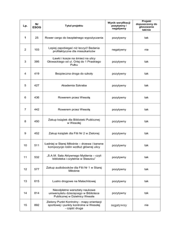 Tytuł projektu Wynik weryfikacji pozytywny / negatywny Projekt dopuszczony do głosowania tak/nie 25 Rower cargo do bezpłatnego wypożyczania pozytywny tak 2 103 Lepiej zapobiegać niż leczyć! Badania profilaktyczne dla mieszkańców negatywny nie 3 395 Ławki i kosze na śmieci na ulicy Głowackiego od ul. Orlej do 1 Praskiego Pułku pozytywny tak 4 419 Bezpieczna droga do szkoły pozytywny tak 5 427 Akademia Szkraba pozytywny tak 6 436 Rowerem przez Wesołą pozytywny tak 7 442 Rowerem przez Wesołą pozytywny tak 8 450 Zakup książek dla Biblioteki Publicznej w Wesołej pozytywny tak 9 452 Zakup książek dla Filii Nr 2 w Zielonej pozytywny tak 10 511 Ładniej w Starej Miłośnie – drzewa i barwne kompozycje roślin wzdłuż głównej ulicy pozytywny tak 11 532 „S.A.M. Sala Aktywnego Myślenia – czyli biblioteka i czytelnia w Staszicu” pozytywny tak 12 577 Zakup audiobooków dla Filii Nr 1 w Starej Miłośnie pozytywny tak 13 615 Lustro drogowe na Malachitowej pozytywny tak 14 814 Nieodpłatne warsztaty naukowe uniwersytetu dziecięcego w Bibliotece Publicznej w Dzielnicy Wesoła pozytywny tak 15 892 Zielony Punkt Kontrolny - mapy orientacji sportowej i punkty kontrolne w Wesołej - część druga negatywny nie Lp. Nr ESOG 1 16 915 Plac Wojska Polskiego dla gniazdujących pozytywny tak 17 920 Jana Pawła II – druga strona rowerowa pozytywny tak 18 923 Gościniec – bezpieczna uliczka lokalna pozytywny tak 19 957 Bezpieczny Kącik Ucznia (BeK@) pozytywny tak 20 1036 Dojazd do Przedszkola Nr 260 – poprawa stanu nawierzchni ulicy pozytywny tak 21 1040 RoLKoSTRADA Wesoła - nauka jazdy i wypożyczalnia sprzętu pozytywny tak 22 1043 Budowa ul. Leszczynowej (odcinek od ul. Piotrusia Pana do końca posesji nr 6 przy ul. Leszczynowej) pozytywny tak 23 1125 Oświetlenie części ulicy Brzozowej pozytywny tak 24 1179 Aktywny senior pozytywny tak 25 1182 Aktywny senior pozytywny tak 26 1187 Aktywny senior pozytywny tak 27 1231 Zakup filmów DVD dla Filii Nr 3 w Woli Grzybowskiej pozytywny tak 28 1280 Budowa kładki nad Kanałem Wawerskim (rejon ul. Ptasiej) pozytywny tak 29 1356 Sport dla wszystkich - 160godzin z rakietą w dłoni- poznaj tajemnice badmintona edycja 2017 pozytywny tak 30 1361 Badmintonowa Maszyna Sportowa dla Zespołu Szkół nr 94 ul. Krótka 1 Warszawa Wesoła pozytywny tak 31 1413 Biblioteka dla seniora – mówiące i powiększone książki negatywny nie 32 1438 Niewidomi są WŚRÓD nas i RAZEM z nami – II edycja. Dotknij Ośrodka Kultury pozytywny tak 33 1448 Doposażenie świetlicy w gry edukacyjne w SP 173 i SP 353 pozytywny tak 34 1464 Budowa dodatkowego miejsca parkingowego przy SP 173 ul. Trakt Brzeski pozytywny tak 35 1623 Życzliwość wobec kobiet w ciąży dla mieszkanek Wesołej pozytywny tak 36 1629 Życzliwość wobec kobiet w ciąży dla mieszkanek Wesołej pozytywny tak 37 1634 Życzliwość wobec kobiet w ciąży dla mieszkanek Wesołej pozytywny tak 38 1679 Wspieranie zrównoważonego rozwoju dziecka z wykorzystaniem metody Dr.Johansena (ISA) pozytywny tak 39 1682 Wspieraj swoje dziecko. Ocenianie kształtujące dla rodziców! - Wesoła pozytywny tak 40 1703 Profilaktyka u dzieci jest inwestycją w zdrowego dorosłego człowieka negatywny nie 41 1723 Profilaktyka u dzieci jest inwestycją w zdrowego dorosłego człowieka negatywny nie 42 1747 Profilaktyka u dzieci jest inwestycją w zdrowego dorosłego człowieka negatywny nie 43 1791 Światło dla Wierzbowej negatywny nie 44 1827 pozytywny tak 45 1850 PILATES pod chmurką dla mieszkańców Wesołej pozytywny tak 46 1947 Parking przy ulicy Kościelnej i ścieżka na cmentarz pozytywny tak 47 1956 Parking rowerowy przy stacji w Wesołej negatywny nie Letnie potańcówki w Wesołej 48 2007 Wspieranie koordynacji ruchów, kondycji i wytrzymałości poprzez zajęcia Breakdance pozytywny tak 49 2009 Udar mózgu? O co Chodzi ? Jak z tym żyć? Nie boimy się! Szkolimy Się! negatywny nie 50 2012 Gra Planszowa integrująca , stymulująca funkcje poznawcze osób po udarach mózgu / z chorobą otępienną negatywny nie 51 2063 Nauka języka angielskiego pozytywny tak 52 2072 Nauka języka niemieckiego pozytywny tak 53 2228 Festyn osiedlowy pozytywny tak 54 2427 Tornado zagrożeń – świadomy rodzic pozytywny tak 55 2431 Alternatywnie aktywnie pozytywny tak 56 2432 Po pierwsze Ja! Po drugie My! Po trzecie Razem! pozytywny tak 57 2518 Oświetlenie ulicy Marmurowej pozytywny tak 58 2524 Oświetlenie placu zabaw na Jeździeckiej pozytywny tak 59 2567 Aktywny senior - gimnastyka pozytywny tak 60 2614 Park dla młodzieży pozytywny tak 61 2615 Park Kultury dla Młodzieży pozytywny tak 62 2616 Młodzieżowy Park Rekreacji pozytywny tak 63 2621 Sprawny senior pozytywny tak 64 2626 Taneczny rok z zumbą pozytywny tak 65 2627 JOGA – na zdrowie pozytywny tak 66 2637 Bezpieczny azyl dla pożytecznych owadów pozytywny tak 67 2638 Chodnik na ul. Konwaliowej – uzupełnienie i wyrównanie nawierzchni pozytywny tak 68 2640 Pas zieleni przy ul. Pogodnej pozytywny tak 69 2641 Dostęp do przychodni na Osiedlu Jodłowa negatywny nie