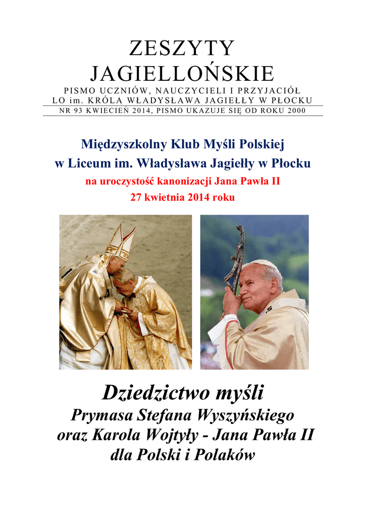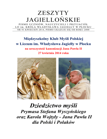 ZESZYTY JAGIELLOŃSKIE PISMO UCZNIÓW, NAUCZYCIELI I PRZYJACIÓŁ LO im. KRÓLA WŁADYSŁAWA JAGIEŁŁY W PŁOCKU NR 93 KWIECIEŃ 2014, PISMO UKAZUJE SIĘ OD ROKU 2000 Międzyszkolny Klub Myśli Polskiej w Liceum im. Władysława Jagiełły w Płocku na uroczystość kanonizacji Jana Pawła II 27 kwietnia 2014 roku Dziedzictwo myśli Prymasa Stefana Wyszyńskiego oraz Karola Wojtyły - Jana Pawła II dla Polski i Polaków Prymas i Papież Dwaj giganci polskiego ducha w XX wieku swoim nauczaniem zwracają uwagę na kwestie, które tracimy z pola widzenia w procesie przemian. Proponujemy namysł nad tekstami Prymasa i Papieża w czterech kluczowych sprawach: jak ocalić polskość, naszą kulturową tożsamość w Europie? jak uzdrowić polską pracę i zagwarantować w niej czas wolny dla refleksji, dla rozwoju duchowego, dla wartości wyższych? jak podnieść moralną kondycję Polaków, jak dostrzec wagę osobistego przykładu w rozwoju moralnym? jak w świecie, który już się niczego nie wstydzi, przywrócić wartość wstydu? Zeszyty Jagiellońskie. Pismo Uczniów, Nauczycieli i Przyjaciół Liceum Ogólnokształcącego im. Króla Władysława Jagiełły w Płocku Redakcja: ul. 3 Maja 4, 09 – 402 Płock; ht t p: /www.j a gi ello n k a.p lo c k.p l ; (024) 364-59-20 [email protected]; Opiekun merytoryczny projektu: Tomasz Zbrzezny. Opiekun zespołu: Wiesław Kopeć, [email protected] Zespół redakcyjny: członkowie Międzyszkolnego Klubu Myśli Polskiej. 2 On uformował przyszłego Papieża Stefan Kardynał Wyszyński Prymas Polski STEFAN KARDYNAŁ WYSZYŃSKI Z rozważań nad kulturą ojczystą PŁOCK – CZERWIŃSK – GRUNWALD – KONSTANCJA – JASNA GÓRA Z dziejów Narodu Milenijnego Stojąc w tej romańskiej Bazylice, sercami korzymy się przed Bogiem w Trójcy Świętej Jedynym, przed Oblubienicą Trójcy Świętej - Maryją, i przed postaciami historycznymi, które przeszły przez naszą ziemię, czyniąc dobrze. Pamiętamy, że podobnie jak w Gnieźnie, Poznaniu, Krakowie i Warszawie, tak i tutaj, w Płocku, stoimy wobec grobów 3 królewskich. Stajemy wobec majestatu Rzeczypospolitej chrześcijańskiej, w obliczu mocy, która zaślubiła w ziemi naszej Kościół i Naród. Współdziałanie chrzczącego Kościoła i chrzczonego Narodu było szczególnie owocne, jak to wykazał w swych historycznych rozważaniach biskup płocki. Polscy biskupi wchodzą do tej Katedry z taką czcią, z jaką wchodzili do Katedry Gnieźnieńskiej, Poznańskiej, Krakowskiej czy Warszawskiej. Patrzymy tu na ślady owocnego i trwałego współdziałania Kościoła i Narodu, żyjącego kulturą chrześcijańską, którą w ziemi polskiej tworzył społem Kościół i Naród ochrzczony. Nasza cześć potęguje się na wspomnienie młodzieńczej postaci syna ziemi mazowieckiej, świętego Stanisława Kostki, którego jubileusz obchodzić będzie w roku przyszłym diecezja płocka, cała Polska, Austria i Rzym. Dzieci najmilsze! Mając serca podniesione ku Ojcu narodów, lepiej rozumiemy polecenie Pana naszego Jezusa Chrystusa, który przed dwoma tysiącami lat powiedział do garstki swych uczniów, Apostołów: „Idźcie i nauczajcie wszystkie narody, chrzcząc je...” (Mt 28,19). Mandat Chrystusowy dotarł i do nas. Biskupi polscy, następcy Apostołów, wiernie ten mandat wykonywali w ziemi naszej, idąc przez nią, nauczając i chrzcząc dzieci Narodu polskiego. Sprawowali „Gody Chrystusowe”, radosne zaślubiny naszego Narodu z Chrystusem, żyjącym w Kościele, działającym i uświęcającym go. Odnawiamy ślady Chociaż kilka rzutów historycznych wydobędziemy z dziesięciowiekowej księgi dziejów ochrzczonego Narodu. Dzisiaj, w dniu 12 listopada, katolicka Polska czci pamięć Pięciu Męczenników, zwanych „Polskimi”. Wystarczy rzucić kilka dat. Przypomną one doniosłe dzieje pierwszych świadków, którzy w ziemi polskiej dawali Chrystusowi świadectwo krwią, wysączoną z ich żył w glebę ojczystą. Jest rok 1003. Według tradycji historycznej, dotychczas nie podważanej, w dalekim Międzyrzeczu oddaje swoje życie pięciu zakonników: dwaj Włosi i trzej Polacy, chcąc dochować wierności Prawdzie, którą wypowiedzieli wobec ludzi krzywdzących ich niesprawiedliwie. Sprowadził ich Bolesław Chrobry i osadził na szlaku, wiodącym od Wrocławia, poprzez Opole i Gorzów, ku Szczecinowi. Ślady ich życia zostały tam zatarte przez nieprzyjazną dłoń. Chcemy te ślady odnowić, dlatego niedawno biskup włocławski wielkodusznie przekazał relikwie męczenników Prawdy biskupowi gorzowskiemu, który z wielką czcią umieścił je w Międzyrzeczu, gdzie według tradycji oddali swe życie za Chrystusa. Wspominamy o tym, bo uważamy, że przez ten akt, tak zdawałoby się niepozorny, iż go prasa nie zanotowała, zostały odnowione ślady, które już przed tysiącem lat stawiał Kościół Boży w swoich męczennikach na ziemiach, po wiekach odzyskanych. Odnawiamy te ślady dzisiaj, aby wszystkim było wiadomo, że jak za czasów Bolesława Chrobrego obecna była na tych ziemiach polska ofiarna krew, wyznająca Chrystusa, tak i dziś - współczesne pokolenie wraca na ślady swych rodaków, przychodząc tu w imię Boże. Koniec X wieku to czasy wyjątkowo błogosławione dla Polski, która w swym pierwszym historycznym księciu Mieszku zaledwie przed kilkudziesięciu laty pochyliła czoło przed źródłem wody chrzcielnej i otworzyła serce Trójcy Świętej. W tych błogosławionych dniach święty Wojciech idzie przez ziemię polską od Pragi czeskiej przez Wrocław i Opole, „bursztynowym szlakiem”, ku Gnieznu. Tam wzmocniony przez króla Bolesława Chrobrego, który miał szczególny talent skupiania przy sobie wielkich ludzi, idzie dalej przez ziemię kujawską, prawdopodobnie szlakiem rzeki Zgłowiączki ku Wiśle, aby przekroczyć granice Polski i wejść w imię Krzyża na ziemię pruską, ku Bałtykowi. Tam skończy swoje życie męczeńską śmiercią. 4 