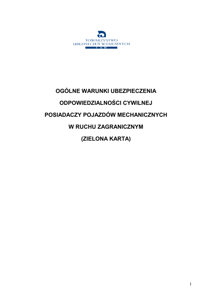 OGÓLNE WARUNKI UBEZPIECZENIA ODPOWIEDZIALNOŚCI CYWILNEJ POSIADACZY POJAZDÓW MECHANICZNYCH W RUCHU ZAGRANICZNYM (ZIELONA KARTA) 1 KARTA INFORMACYJNA *) DO OGÓLNYCH WARUNKÓW UBEZPIECZENIA ODPOWIEDZIALNOŚCI CYWILNEJ POSIADACZY POJAZDOW MECHANICZNYCH W RUCHU ZAGRANICZNYM (ZIELONA KARTA) LP Rodzaj informacji Numer jednostki redakcyjnej wzorca umowy 1. Przesłanki wypłaty odszkodowania i innych świadczeń § 4, § 11, § 15, § 21, § 22, § 23. § 5, § 11, § 20, § 22, § 24. 2. Ograniczenia oraz wyłączenia odpowiedzialności zakładu ubezpieczeń uprawniające do odmowy wypłaty odszkodowania i innych świadczeń lub ich obniżenia *) Informacje, o których mowa w art. 17 ust. 1 ustawy o działalności ubezpieczeniowej i reasekuracyjnej. 2 SPIS TREŚCI POSTANOWIENIA OGÓLNE ......................................................................................................... 4 PRZEDMIOT I ZAKRES UBEZPIECZENIA .................................................................................... 5 WYŁĄCZENIA ODPOWIEDZIALNOŚCI ........................................................................................ 5 ZAWARCIE UMOWY UBEZPIECZENIA ........................................................................................ 5 CZAS TRWANIA ODPOWIEDZIALNOŚCI TOWARZYSTWA ........................................................ 5 SUMA GWARANCYJNA ................................................................................................................ 6 SKŁADKA UBEZPIECZENIOWA ................................................................................................... 7 OBOWIĄZKI TOWARZYSTWA ...................................................................................................... 7 OBOWIĄZKI UBEZPIECZJĄCEGO (UBEZPIECZONEGO) .......................................................... 7 USTALENIE ODPOWIEDZIALNOŚCI ZA SZKODĘ I WYPŁATA ODSZKODOWANIA ................. 9 ROSZCZENIA REGRESOWE ........................................................................................................ 9 ROZPATRYWANIE REKLAMACJI............................................................................................... 10 ROZWIĄZYWANIE SPORÓW ...................................................................................................... 10 POSTANOWIENIA KOŃCOWE.................................................................................................... 11 3 OGÓLNE WARUNKI UBEZPIECZENIA ODPOWIEDZIALNOŚCI CYWILNEJ POSIADACZY POJAZDÓW MECHANICZNYCH W RUCHU ZAGRANICZNYM (ZIELONA KARTA) POSTANOWIENIA OGÓLNE §1 1. Ogólne warunki ubezpieczenia odpowiedzialności cywilnej posiadaczy pojazdów mechanicznych w ruchu zagranicznym (Zielona Karta) stosuje się do umów ubezpieczenia zawieranych przez Towarzystwo Ubezpieczeń Wzajemnych „TUW” zwane dalej „Towarzystwem”, z podmiotami będącymi jego członkami, zwanymi dalej „Ubezpieczającymi”. 2. Ubezpieczający może zawrzeć umowę ubezpieczenia na własną rzecz lub na rachunek osoby trzeciej. W przypadku zawarcia umowy ubezpieczenia na rachunek osoby trzeciej, postanowienia OWU dotyczące Ubezpieczającego odnoszą się do osoby trzeciej, z wyjątkiem obowiązku zapłaty składki ubezpieczeniowej. §2 1. Towarzystwo zawiera umowy ubezpieczenia na podstawie niniejszych OWU wyłącznie z posiadaczami pojazdów mechanicznych posiadającymi umowę obowiązkowego ubezpieczenia odpowiedzialności cywilnej posiadaczy pojazdów mechanicznych zawartą z Towarzystwem. 2. Towarzystwo nie zawiera umów ubezpieczenia z posiadaczami pojazdów mechanicznych, które są używane do przewożenia towarów niebezpiecznych w rozumieniu Europejskiej Konwencji o międzynarodowym przewozie towarów niebezpiecznych (ADR). §3 Określenia użyte w OWU oznaczają: 1) Biuro Narodowe - organizacja zakładów ubezpieczeń na terytorium danego państwa, które prowadzą działalność ubezpieczeniową w zakresie ubezpieczenia odpowiedzialności cywilnej posiadaczy pojazdów mechanicznych, 2) klient – Ubezpieczający, Ubezpieczony lub Uprawniony z umowy ubezpieczenia, 3) państwo miejsca zdarzenia – państwo, na terytorium którego została wyrządzona szkoda objęta ubezpieczeniem, 4) pojazd mechaniczny - pojazd samochodowy, ciągnik rolniczy, motorower, przyczepa i pojazd wolnobieżny określone w przepisach ustawy – Prawo o ruchu drogowym, zarejestrowany w Rzeczypospolitej Polskiej, 5) Regulamin Wewnętrzny Rady Biur – dokument regulujący wzajemne stosunki między Biurami Narodowymi państw, będących członkami systemu Zielonej Karty, 6) reklamacja – wystąpienie skierowane do Towarzystwa przez jego Klienta, w którym Klient zgłasza zastrzeżenia dotyczące usług świadczonych przez Towarzystwo, 7) Zielona Karta – międzynarodowy certyfikat ubezpieczenia odpowiedzialności cywilnej posiadaczy pojazdów mechanicznych, wystawiony w imieniu biura narodowego. 4 PRZEDMIOT I ZAKRES UBEZPIECZENIA §4 Ochroną ubezpieczeniową objęta jest odpowiedzialność cywilna posiadacza lub kierującego pojazdem mechanicznym za szkody wyrządzone osobom trzecim powstałe w związku z ruchem tego pojazdu poza granicami Rzeczypospolitej Polskiej, na terytorium państw wymienionych w Zielonej Karcie. WYŁĄCZENIA ODPOWIEDZIALNOŚCI §5 1. Towarzystwo jest wolne od odpowiedzialności, jeżeli Ubezpieczający, Ubezpieczony, osoba za którą Ubezpieczający lub Ubezpieczony ponosi odpowiedzialność lub z którą pozostaje we wspólnym gospodarstwie domowym, wyrządziła szkodę umyślnie lub wskutek rażącego niedbalstwa, także wówczas, gdy zapłata odszkodowania odpowiadałaby w danych okolicznościach względom słuszności – chyba, że prawo miejsca zdarzenia stanowi inaczej. 2. Towarzystwo nie odpowiada za szkody wyłączone z ochrony ubezpieczeniowej w przepisach dotyczących obowiązkowego ubezpieczenia odpowiedzialności cywilnej posiadaczy pojazdów mechanicznych obowiązujących w państwie miejs