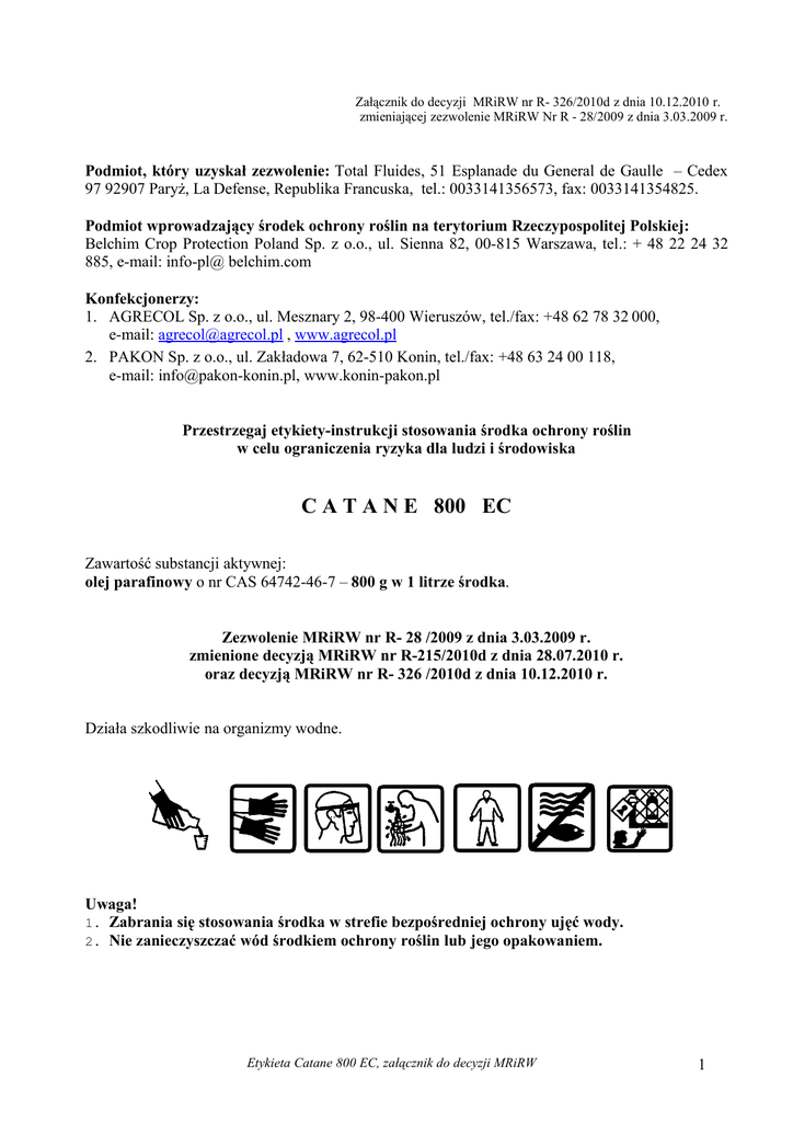 Załącznik do decyzji MRiRW nr R- 326/2010d z dnia 10.12.2010 r. zmieniającej zezwolenie MRiRW Nr R - 28/2009 z dnia 3.03.2009 r. Podmiot, który uzyskał zezwolenie: Total Fluides, 51 Esplanade du General de Gaulle – Cedex 97 92907 Paryż, La Defense, Republika Francuska, tel.: 0033141356573, fax: 0033141354825. Podmiot wprowadzający środek ochrony roślin na terytorium Rzeczypospolitej Polskiej: Belchim Crop Protection Poland Sp. z o.o., ul. Sienna 82, 00-815 Warszawa, tel.: + 48 22 24 32 885, e-mail: info-pl@ belchim.com Konfekcjonerzy: 1. AGRECOL Sp. z o.o., ul. Mesznary 2, 98-400 Wieruszów, tel./fax: +48 62 78 32 000, e-mail: [email protected] , www.agrecol.pl 2. PAKON Sp. z o.o., ul. Zakładowa 7, 62-510 Konin, tel./fax: +48 63 24 00 118, e-mail: [email protected], www.konin-pakon.pl Przestrzegaj etykiety-instrukcji stosowania środka ochrony roślin w celu ograniczenia ryzyka dla ludzi i środowiska C A T A N E 800 EC Zawartość substancji aktywnej: olej parafinowy o nr CAS 64742-46-7 – 800 g w 1 litrze środka. Zezwolenie MRiRW nr R- 28 /2009 z dnia 3.03.2009 r. zmienione decyzją MRiRW nr R-215/2010d z dnia 28.07.2010 r. oraz decyzją MRiRW nr R- 326 /2010d z dnia 10.12.2010 r. Działa szkodliwie na organizmy wodne. Uwaga! 1. Zabrania się stosowania środka w strefie bezpośredniej ochrony ujęć wody. 2. Nie zanieczyszczać wód środkiem ochrony roślin lub jego opakowaniem. Etykieta Catane 800 EC, załącznik do decyzji MRiRW 1 I OPIS DZIAŁANIA CATANE 800 EC jest środkiem owadobójczym w formie koncentratu do sporządzania emulsji wodnej, o działaniu kontaktowym przeznaczony do ochrony drzew owocowych przed niektórymi szkodnikami. Na roślinie działa powierzchniowo. II ZAKRES STOSOWANIA, TERMINY I DAWKI ROŚLINY SADOWNICZE 1. DRZEWA ZIARNKOWE przędziorek owocowiec Opryskiwać w okresie bezlistnym przed ruszeniem wegetacji. Zalecane stężenie: 2% (2 l środka w 100 litrach wody). 2. ŚLIWA misecznik śliwowy Zalecane stężenie: 2% (2 l środka w 100 litrach wody). Opryskiwać w okresie pękania pąków (łuski oddzielone, widoczny jasnozielony pąk). Zalecana ilość cieczy użytkowej 500-1000 l/ha w zależności od wielkości drzew. UWAGI: 1. Ograniczyć stosowanie środka do jednego zabiegu, dalsze konieczne zabiegi wykonać środkami z innych grup chemicznych. 2.Opryskiwać rośliny tak, aby ciecz spływała z pni i gałęzi. 3.Środek stosować w temperaturze powyżej 0oC, podczas bezwietrznej i bezdeszczowej pogody. III OKRES KARENCJI okres od dnia ostatniego zabiegu do dnia zbioru i przeznaczenia do konsumpcji NIE DOTYCZY IV OKRES PREWENCJI DLA LUDZI, ZWIERZĄT I PSZCZÓŁ okres zapobiegający zatruciu NIE DOTYCZY V SPORZĄDZANIE CIECZY UŻYTKOWEJ Przed przystąpieniem do sporządzenia cieczy użytkowej dokładnie ustalić potrzebną jej ilość. Zawartością opakowania przed użyciem wstrząsnąć. Odmierzoną ilość środka wlać do zbiornika opryskiwacza napełnionego częściowo wodą (z włączonym mieszadłem) i uzupełnić wodą do potrzebnej ilości. Po wlaniu środka do zbiornika opryskiwacza nie wyposażonego w mieszadło hydrauliczne ciecz mechanicznie wymieszać. Opróżnione opakowania przepłukać trzykrotnie wodą, a popłuczyny wlać do zbiornika opryskiwacza z cieczą użytkową. Po pracy aparaturę dokładnie wymyć. Etykieta Catane 800 EC, załącznik do decyzji MRiRW 2 VI PRZECHOWYWANIE Przechowywać pojemnik szczelnie zamknięty. Przechowywać z dala od źródeł ciepła. Przechowywać pojemnik szczelnie zamknięty w temperaturze nie niższej niż 0°C i nie wyższej niż 30°C. Chronić przed dziećmi. Nie przechowywać razem z żywnością, napojami i paszami dla zwierząt. VII WARUNKI BEZPIECZNEGO STOSOWANIA ŚRODKA − − − − Nie jeść i nie pić oraz nie palić tytoniu podczas stosowania produktu. Nosić odpowiednią odzież ochronną. W razie połknięcia niezwłocznie zasięgnij porady lekarza - pokaż opakowanie lub etykietę. Resztki cieczy użytkowej rozcieńczyć wodą i wypryskać na powierzchni poprzednio opryskiwanej. Wodę użytą do mycia aparatury wypryskać na powierzchni uprzednio opryskiwanej, stosując te same środki ochrony osobistej. − Opróżnione opakowania traktować jako odpady komunalne. − Zabrania się spalania opakowań po środku ochrony roślin we własnym zakresie. UWAGA! ZABRANIA SIĘ WYKORZYSTYWANIA OPRÓŻNIONYCH ŚRODKACH OCHRONY ROŚLIN DO INNYCH CELOW, TRAKTOWANIA ICH JAKO SUROWCE WTÓRNE. OPAKOWAŃ PO W TYM TAKŻE VIII ANTIDOTUM BRAK, STOSOWAĆ LECZENIE OBJAWOWE IX POMOC MEDYCZNA W zaistniałych sytuacjach, kiedy wymagana jest lub konieczna inna pomoc medyczna niż ujęta w ostrzeżeniach skontaktować się z najbliższym ośrodkiem toksykologicznym: Gdańsk – (58) 682 04 04 Kraków – (12) 411 99 99 Lublin – (81) 740 89 83 Łódź – (42) 657 99 00 Poznań – (61) 847 69 46 Rzeszów – (17) 866 40 25 Sosnowiec – (32) 266 11 45 Tarnów - (14) 631 54 09 Warszawa – (22) 619 66 54 Wrocław – (71) 343 30 08 Okres ważności - 2 lata Data produkcji - ........ Zawartość netto - ........ Nr partii - ........ Etykieta Catane 800 EC, załącznik do decyzji MRiRW 3