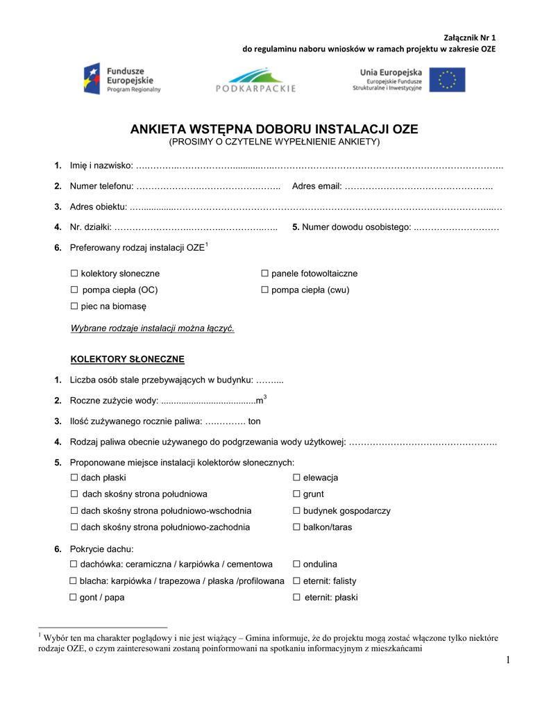 Załącznik Nr 1 do regulaminu naboru wniosków w ramach projektu w zakresie OZE ANKIETA WSTĘPNA DOBORU INSTALACJI OZE (PROSIMY O CZYTELNE WYPEŁNIENIE ANKIETY) 1. Imię i nazwisko: ….………..………………...........…..………………………………………………………………….. 2. Numer telefonu: ………………….……………….…….. Adres email: ………………………………………….. 3. Adres obiektu: .…..............………………………………………….……………………………….………………...… 4. Nr. działki: ……………………..………..…………..….. 6. Preferowany rodzaj instalacji OZE 5. Numer dowodu osobistego: ..……………………… 1 □ kolektory słoneczne □ pompa ciepła (OC) □ piec na biomasę □ panele fotowoltaiczne □ pompa ciepła (cwu) Wybrane rodzaje instalacji można łączyć. KOLEKTORY SŁONECZNE 1. Liczba osób stale przebywających w budynku: …….... 2. Roczne zużycie wody: ......................................m 3 3. Ilość zużywanego rocznie paliwa: ….………. ton 4. Rodzaj paliwa obecnie używanego do podgrzewania wody użytkowej: ………………………………………….. 5. Proponowane miejsce instalacji kolektorów słonecznych: □ dach płaski □ dach skośny strona południowa □ dach skośny strona południowo-wschodnia □ dach skośny strona południowo-zachodnia □ elewacja □ grunt □ budynek gospodarczy □ balkon/taras 6. Pokrycie dachu: □ dachówka: ceramiczna / karpiówka / cementowa □ ondulina □ blacha: karpiówka / trapezowa / płaska /profilowana □ eternit: falisty □ gont / papa □ eternit: płaski 1 Wybór ten ma charakter poglądowy i nie jest wiążący – Gmina informuje, że do projektu mogą zostać włączone tylko niektóre rodzaje OZE, o czym zainteresowani zostaną poinformowani na spotkaniu informacyjnym z mieszkańcami 1 Załącznik Nr 1 do regulaminu naboru wniosków w ramach projektu w zakresie OZE 7. Planowane miejsce na podgrzewacz solarny: □ kotłowania, □ pomieszczenie gospodarcze □ ocieplone poddasze □ pomieszczenie mieszkalne 8. Wymiary pomieszczenia na podgrzewacz solarny: szerokość ….…. długość….…. wysokość…….. 9. Szerokość drzwi pomieszczenia przygotowanego na podgrzewacz solarny:………,….. m 10. Czy w pomieszczeniu, gdzie będzie znajdował się zbiornik c.w.u. doprowadzony jest prąd? □ Tak □ Nie 11. Czy w pomieszczeniu, gdzie będzie znajdował się zbiornik c.w.u., jest możliwość podłączenia się do ciepłej i zimnej wody użytkowej? □ Tak □ Nie – podać szacunkową odległość………..……m 12. Czy obecnie na instalacji jest zamontowany reduktor ciśnienia? □ tak □ nie 13. Czy istnieje instalacja odgromowa w budynku? □ tak □ nie 14. Istniejące źródło ciepła dla podgrzania ciepłej wody użytkowej: □ kocioł gazowy 1-funkcyjny z wolnostojącym zasobnikiem □ kocioł gazowy 1-funkcyjny ze zintegrowanym zasobnikiem □ kocioł na paliwo stałe węgiel □ kocioł olejowy □ kocioł gazowy 2-funkcyjny □ kocioł gazowy gaz ziemny / płynny □ kocioł na paliwo stałe opalany biomasą □ przepływowy podgrzewacz wody □ pojemnościowy podgrzewacz wody PANELE FOTOWOLTAICZNE 2 1. Moc umowna (przyłączeniowa) ………. Zużycie energii elektrycznej w gospodarstwie domowym na podstawie rachunków za energię elektryczną 2015 r. Wyszczególnienie 3 Zużycie w okresach rozliczeniowych w 2015 r. Zużycie rzeczywiste [kWh] Zużycie prognozowane [kWh] Styczeń Luty Marzec 2 Moc umowna wynika z podpisanej umowy z operatorem systemu dystrybucyjnego oraz jest wyrażona w [kW]. Często występuje w fakturach za energię elektryczną pod pozycją „moc umowna” lub w pozycji „ilość” przy opłacie sieciowej stałej lub przy opłacie przejściowej 3 Zużycie proszę podać na poszczególne okresy obliczeniowe (miesięczne, dwumiesięczne, kwartalne, roczne) 2 Kwiecień Maj Czerwiec Lipiec Sierpień Wrzesień Październik Listopad Grudzień Razem w roku 2. Proponowane miejsce instalacji paneli fotowoltaicznych □ dach płaski □ dach skośny strona południowa □ dach skośny strona południowo-wschodnia □ dach skośny strona południowo-zachodnia □ elewacja □ grunt □ budynek gospodarczy □ balkon/taras 3. Pokrycie dachu: □ dachówka: ceramiczna / karpiówka / cementowa □ ondulina □ blacha: karpiówka / trapezowa / płaska /profilowana □ eternit: falisty □ gont / papa □ eternit: płaski POMPA CIEPŁA 2 1. Powierzchnia / kubatura domu: .……..m / ….……m 3 2. Moc istniejącego kotła: ……………………….…... kW 3. Ilość zużywanego rocznie paliwa: ….………. ton 4. Liczba osób stale przebywających w budynku:…….... 5. Roczne zużycie wody: ......................................m 3 6. Rodzaj paliwa obecnie używanego do podgrzewania wody użytkowej: ………………………………………….. 7. Rodzaj paliwa obecnie używanego do ogrzewania domu: ……………………………………………………….…. 3 KOCIOŁ NA BIOMASĘ 2 1. Powierzchnia / kubatura domu: .……..m / ….……m 3 2. Ilość zużywanego rocznie paliwa: ….………. ton 3. Moc istniejącego kotła: ……………………….…... kW 4. Rodzaj paliwa obecnie używanego do podgrzewania wody użytkowej: ………………………………………….. 5. Rodzaj paliwa obecnie używanego do ogrzewania domu: ……………………………………………………….…. 6. Wymiary kotłowni lub miejsca przeznaczonego na kocioł: szerokość….…. długość….…. wysokość…….. 7. Czy kocioł grzeje ciepłą wodę użytkową? □ tak □ nie …………………………..…………………………………………….. DATA I CZYTELNY PODPIS BENEFICJENTA Niniejszym wyrażam zgodę na przetwarzanie danych osobowych zawartych w niniejszym protoko