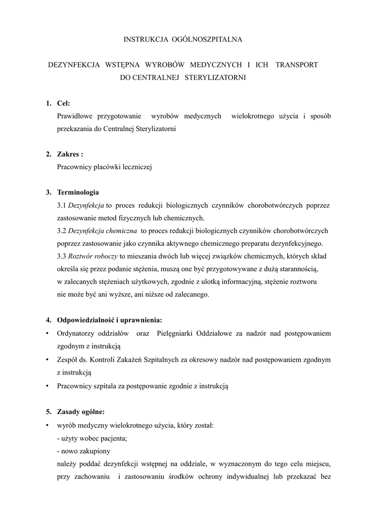 INSTRUKCJA OGÓLNOSZPITALNA DEZYNFEKCJA WSTĘPNA WYROBÓW MEDYCZNYCH I ICH TRANSPORT DO CENTRALNEJ STERYLIZATORNI 1. Cel: Prawidłowe przygotowanie wyrobów medycznych wielokrotnego użycia i sposób przekazania do Centralnej Sterylizatorni 2. Zakres : Pracownicy placówki leczniczej 3. Terminologia 3.1 Dezynfekcja to proces redukcji biologicznych czynników chorobotwórczych poprzez zastosowanie metod fizycznych lub chemicznych. 3.2 Dezynfekcja chemiczna to proces redukcji biologicznych czynników chorobotwórczych poprzez zastosowanie jako czynnika aktywnego chemicznego preparatu dezynfekcyjnego. 3.3 Roztwór roboczy to mieszania dwóch lub więcej związków chemicznych, których skład określa się przez podanie stężenia, muszą one być przygotowywane z dużą starannością, w zalecanych stężeniach użytkowych, zgodnie z ulotką informacyjną, stężenie roztworu nie może być ani wyższe, ani niższe od zalecanego. 4. Odpowiedzialność i uprawnienia: • Ordynatorzy oddziałów oraz Pielęgniarki Oddziałowe za nadzór nad postępowaniem zgodnym z instrukcją • Zespół ds. Kontroli Zakażeń Szpitalnych za okresowy nadzór nad postępowaniem zgodnym z instrukcją • Pracownicy szpitala za postępowanie zgodnie z instrukcją 5. Zasady ogólne: • wyrób medyczny wielokrotnego użycia, który został: - użyty wobec pacjenta; - nowo zakupiony należy poddać dezynfekcji wstępnej na oddziale, w wyznaczonym do tego celu miejscu, przy zachowaniu i zastosowaniu środków ochrony indywidualnej lub przekazać bez dezynfekcji wstępnej do maximum 2 godzin od momentu użycia. Uwaga: Można zastosować do narzędzi preparaty enzymatyczne w postaci piany zapewniające wilgotne środowisko do czasu przekazania ich do Centralnej Sterylizatorni. 6. Opis postępowania: • dezynfekcje wstępną przeprowadza się przy użyciu dostępnych preparatów dezynfekcyjnych, zgodnie z wytycznymi producenta. • dezynfekcje przeprowadzamy w przeznaczonej do tego wanience dezynfekcyjnej. Wanienka powinna zawierać oznaczenie: datę i godzinę sporządzenia roztworu, dane osoby przygotowującej roztwór roboczy, stężenie, i nazwę preparatu dezynfekcyjnego. • narzędzia otwarte, pozbawione ostrzy, całkowicie zanurzone w środku dezynfekującym , wyroby modułowe zdemontowane • po dezynfekcji wstępnej odlać roztwór dezynfekcyjny i pozostawić narzędzia w środowisku wilgotnym w szczelnej wanience dezynfekcyjnej . • pojemniki ze skażonym sprzętem składowane i transportowane wózkiem akumulatorowym do Centralnej Sterylizatorni, w taki sposób aby podczas ich transportu nie doszło do wywrócenia pojemników, mechanicznego uszkodzenia wyrobów medycznych, ekspozycji zawodowej pracowników transportu • w strefie skażonej Centralnej Sterylizatorni pracownik działu przejmuje przekazany sprzęt wszystkie czynności wykonuje zgodnie z obowiązującymi przepisami BHP oraz epidemiologicznymi.