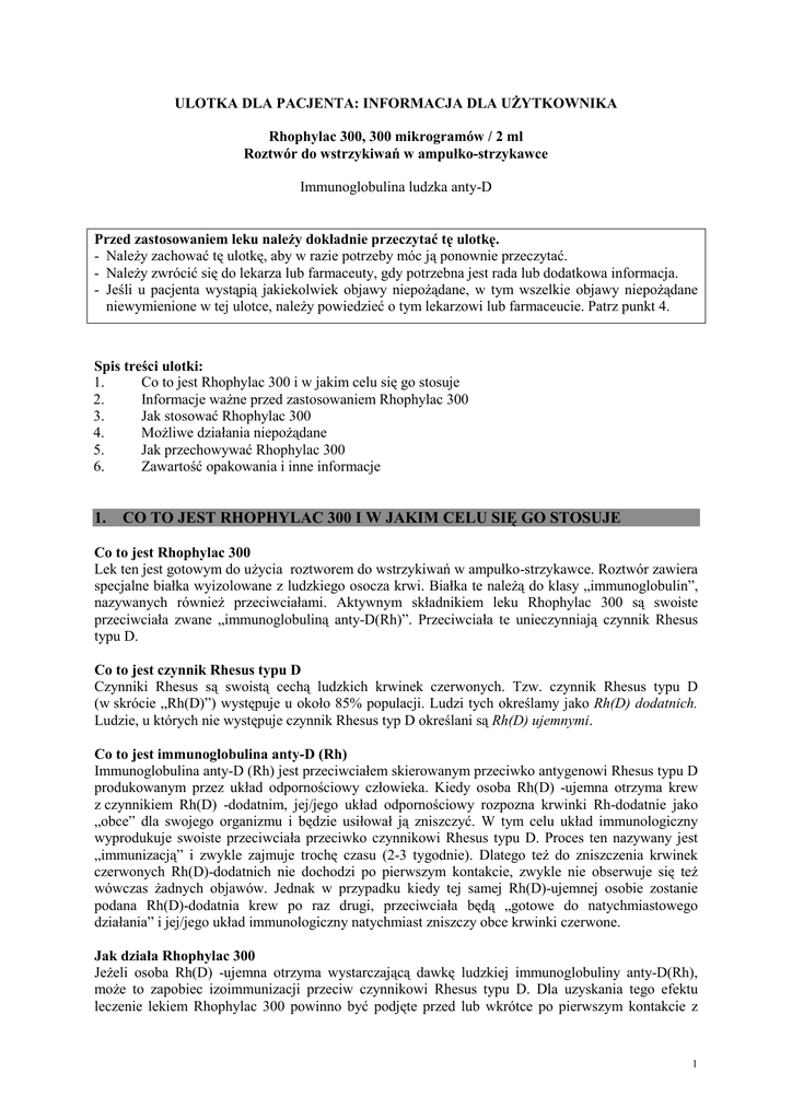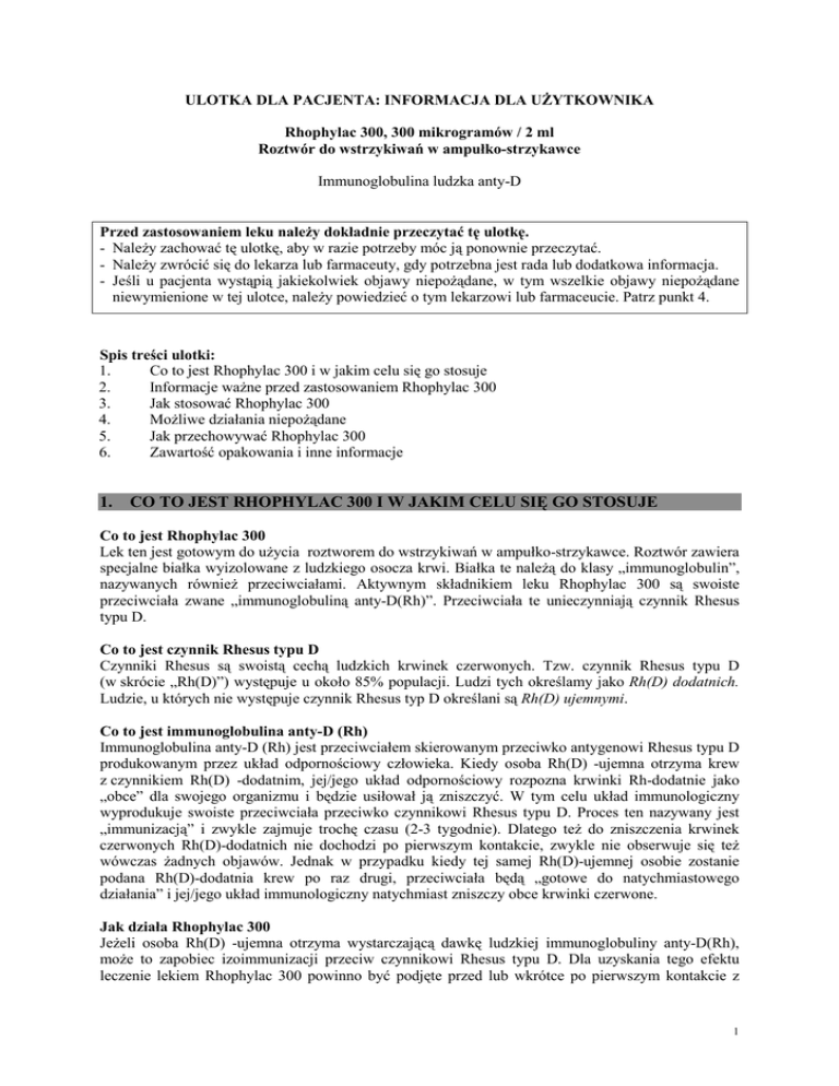 ULOTKA DLA PACJENTA: INFORMACJA DLA UŻYTKOWNIKA Rhophylac 300, 300 mikrogramów / 2 ml Roztwór do wstrzykiwań w ampułko-strzykawce Immunoglobulina ludzka anty-D Przed zastosowaniem leku należy dokładnie przeczytać tę ulotkę. - Należy zachować tę ulotkę, aby w razie potrzeby móc ją ponownie przeczytać. - Należy zwrócić się do lekarza lub farmaceuty, gdy potrzebna jest rada lub dodatkowa informacja. - Jeśli u pacjenta wystąpią jakiekolwiek objawy niepożądane, w tym wszelkie objawy niepożądane niewymienione w tej ulotce, należy powiedzieć o tym lekarzowi lub farmaceucie. Patrz punkt 4. Spis treści ulotki: 1. Co to jest Rhophylac 300 i w jakim celu się go stosuje 2. Informacje ważne przed zastosowaniem Rhophylac 300 3. Jak stosować Rhophylac 300 4. Możliwe działania niepożądane 5. Jak przechowywać Rhophylac 300 6. Zawartość opakowania i inne informacje 1. CO TO JEST RHOPHYLAC 300 I W JAKIM CELU SIĘ GO STOSUJE Co to jest Rhophylac 300 Lek ten jest gotowym do użycia roztworem do wstrzykiwań w ampułko-strzykawce. Roztwór zawiera specjalne białka wyizolowane z ludzkiego osocza krwi. Białka te należą do klasy „immunoglobulin”, nazywanych również przeciwciałami. Aktywnym składnikiem leku Rhophylac 300 są swoiste przeciwciała zwane „immunoglobuliną anty-D(Rh)”. Przeciwciała te unieczynniają czynnik Rhesus typu D. Co to jest czynnik Rhesus typu D Czynniki Rhesus są swoistą cechą ludzkich krwinek czerwonych. Tzw. czynnik Rhesus typu D (w skrócie „Rh(D)”) występuje u około 85% populacji. Ludzi tych określamy jako Rh(D) dodatnich. Ludzie, u których nie występuje czynnik Rhesus typ D określani są Rh(D) ujemnymi. Co to jest immunoglobulina anty-D (Rh) Immunoglobulina anty-D (Rh) jest przeciwciałem skierowanym przeciwko antygenowi Rhesus typu D produkowanym przez układ odpornościowy człowieka. Kiedy osoba Rh(D) -ujemna otrzyma krew z czynnikiem Rh(D) -dodatnim, jej/jego układ odpornościowy rozpozna krwinki Rh-dodatnie jako „obce” dla swojego organizmu i będzie usiłował ją zniszczyć. W tym celu układ immunologiczny wyprodukuje swoiste przeciwciała przeciwko czynnikowi Rhesus typu D. Proces ten nazywany jest „immunizacją” i zwykle zajmuje trochę czasu (2-3 tygodnie). Dlatego też do zniszczenia krwinek czerwonych Rh(D)-dodatnich nie dochodzi po pierwszym kontakcie, zwykle nie obserwuje się też wówczas żadnych objawów. Jednak w przypadku kiedy tej samej Rh(D)-ujemnej osobie zostanie podana Rh(D)-dodatnia krew po raz drugi, przeciwciała będą „gotowe do natychmiastowego działania” i jej/jego układ immunologiczny natychmiast zniszczy obce krwinki czerwone. Jak działa Rhophylac 300 Jeżeli osoba Rh(D) -ujemna otrzyma wystarczającą dawkę ludzkiej immunoglobuliny anty-D(Rh), może to zapobiec izoimmunizacji przeciw czynnikowi Rhesus typu D. Dla uzyskania tego efektu leczenie lekiem Rhophylac 300 powinno być podjęte przed lub wkrótce po pierwszym kontakcie z 1 czerwonymi krwinkami Rh(D) -dodatnimi. Immunoglobuliny anty-D(Rh) zawarte w tym leku zniszczą natychmiast obce krwinki czerwone Rh(D) -dodatnie. W efekcie układ immunologiczny pacjenta nie będzie stymulowany do wytworzenia własnych przeciwciał. W jakim celu stosuje się Rhophylac 300 Lek ten jest stosowany w dwóch różnych sytuacjach: A) U Rh(D)- ujemnych, ciężarnych kobiet, które noszą Rh(D) -dodatnie dziecko W tej wyjątkowej sytuacji może dojść do immunizacji przez krwinki czerwone dziecka, które przenikają do układu krwionośnego matki. Jeżeli do tego dochodzi podczas pierwszej ciąży, zazwyczaj nie doprowadza to do uszkodzenia płodu i dziecko rodzi się w pełni zdrowe. Jednak w przypadku drugiej ciąży, kiedy płód jest Rh(D)-dodatni, przeciwciała matki mogą uszkodzić krwinki czerwone dziecka podczas ciąży. Może to doprowadzić u dziecka do poważnych komplikacji, a nawet do jego śmierci. Lek ten jest stosowany także jeżeli ciężarna kobieta jest Rh(D) ujemna a nie można stwierdzić czy jej dziecko będzie Rh(D) dodatnie. Ciężarna Rh(D)-ujemna kobieta powinna otrzymać immunoglobuliny anty-D(Rh) w następujących przypadkach: • w ciąży lub bezpośrednio po porodzie dziecka Rh(D) -dodatniego; • po poronieniu dziecka Rh(D) -dodatniego (poronienie, poronienie zagrażające lub aborcja); • gdy w czasie ciąży dojdzie do ciężkich komplikacji (ciąża pozamaciczna lub zaśniad groniasty); • w przypadku podejrzenia, że krwinki czerwone dziecka przeniknęły do krążenia krwi matki (krwotok przezłożyskowy będący wynikiem krwotoku przedporodowego). Może do tego dojść na przykład w przypadku, kiedy podczas ciąży występują krwawienia z dróg rodnych; • kiedy lekarz prowadzący uzna, że istnieje potrzeba wykonania badań w kierunku wad rozwojowych płodu (amniopunkcja, biopsja kosmówki); • kiedy lekarz lub położna muszą wykonać zabieg położniczy w trakcie porodu (np. obrót zewnętrzny dziecka lub inne zabiegowe działania położnicze); • kiedy w wyniku wypadku doszło do uszkodzenia żołądka lub jelit matki (uraz brzucha). B) 2. U osób dorosłych, dzieci i młodzieży (0-18 lat) Rh(D)-ujemnych, którym przypadkowo podano infuzje (transfuzje) krwi Rh-dodatniej (transfuzja źle dobranej krwi). Dotyczy to także innych preparatów krwi zawierających krwinki czerwone Rh(D)-dodatnie INFORMACJE WAŻNE PRZED ZASTOSOWANIEM RHOPHYLAC 300 Należy przeczytać tę część z uwagą. Podane informacje powinny być wzięte pod uwagę przez pacjenta i lekarza przed zastosowaniem tego leku. Kiedy nie stosować Rhophylac 300 jeśli pacjent ma uczulenie (nadwrażliwość) na immunoglobuliny ludzkie lub inne składniki tego leku (wymienione w punkcie 6 tej ulotki). Przed zastosowaniem leku należy poinformować lekarza lub pielęgniarkę o wszystkich przypadkach wystąpienia objawów złej tolerancji innych leków . • • Nie wolno podawać leku w iniekcjach domięśniowych w pr