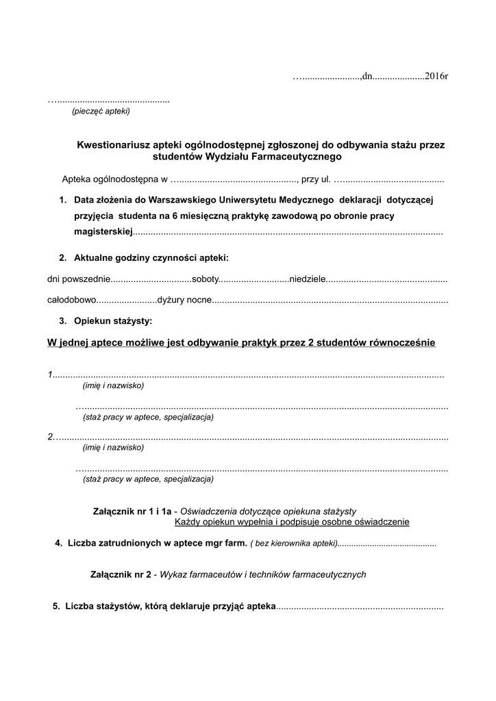 ….......................,dn.....................2016r …............................................. (pieczęć apteki) Kwestionariusz apteki ogólnodostępnej zgłoszonej do odbywania stażu przez studentów Wydziału Farmaceutycznego Apteka ogólnodostępna w ….............................................., przy ul. …........................................ 1. Data złożenia do Warszawskiego Uniwersytetu Medycznego deklaracji dotyczącej przyjęcia studenta na 6 miesięczną praktykę zawodową po obronie pracy magisterskiej.......................................................................................................................... 2. Aktualne godziny czynności apteki: dni powszednie................................soboty............................niedziele................................................ całodobowo........................dyżury nocne............................................................................................. 3. Opiekun stażysty: W jednej aptece możliwe jest odbywanie praktyk przez 2 studentów równocześnie 1.......................................................................................................................................................... (imię i nazwisko) …............................................................................................................................................... (staż pracy w aptece, specjalizacja) 2…........................................................................................................................................................ (imię i nazwisko) …............................................................................................................................................... (staż pracy w aptece, specjalizacja) Załącznik nr 1 i 1a - Oświadczenia dotyczące opiekuna stażysty Każdy opiekun wypełnia i podpisuje osobne oświadczenie 4. Liczba zatrudnionych w aptece mgr farm. ( bez kierownika apteki)........................................... Załącznik nr 2 - Wykaz farmaceutów i techników farmaceutycznych 5. Liczba stażystów, którą deklaruje przyjąć apteka.................................................................. 6. Dostępność dla stażysty aktualnych przepisów prawa farmaceutycznego i literatury fachowej . ●Ustawa Prawo farmaceutyczne wraz z rozporządzeniami (proszę podać numer dziennika ustaw)............................................................................................................................................................... ●Ustawa o przeciwdziałaniu narkomanii wraz z rozporządzeniami. (proszę podać numer dziennika ustaw)................................................................................................................................................................ ●Ustawa o refundacji leków (proszę podać numer dziennika ustaw)…………………………………………… ●Przepisy dot. recept lekarskich (proszę wymienić)……………………………………………………………….. ……………………………………………………………………………………………………………………………… ●Farmakopea Polska wydanie.......................................................................................................................... ●Urzędowy wykaz produktów dopuszczonych do obrotu na terytorium Rzeczypospolitej rok........................... Literatura fachowa ● Leki Współczesnej Terapii (rok wydania)….......... ●Pharmindex …................................ ●Receptura prof. Jachowicz …........ ●Ćwiczenia z receptury.................... inne............................................................................................................................................ 7. Prowadzenie obrotu środkami odurzającymi grupy I-N i II-P: TAK NIE - należy wskazać numer i datę wydania decyzji WIF zwalniającej aptekę z prowadzenia obrotu środkami odurzającymi grupy I-N i psychotropowymi grupy II-P) ….................................................................................................................................................................... ..... ………………………………………………………………………………………………………………….. Środki odurzające i substancje psychotropowe przechowywanie w magazynie produktów leczniczych * Uwagi inne miejsce * drzwi obite blachą * dwa zamki o skomplikowanych mechanizmach * Sejf / metalowa kaseta ** przytwierdzona do ściany / do podłogi ** ewidencjonowanie Książka kontroli zarejestrowana w WIF * lub wersja elektroniczna książki * wydruki przychodu i rozchodu (co 2 tygodnie) * Substancje psychotropowe grupy III-P i IV-P ewidencjonowanie comiesięczne wydruki przychodu i rozchodu * przechowywanie Wydzielona szafka lub szuflada zamykana na klucz w ekspedycji / w magazynie ** * proszę oznaczyć tak lub nie ** właściwe podkreślić 8. Ilość sporządzonych leków recepturowych w roku 2015….........……………………………… w tym leków wymagających sporządzania w warunkach aseptycznych…………………………. w tym leków ocznych……………………………………………………………………………………….. Wyposażenie izby recepturowej : komora z nawiewem laminarnym powietrza TAK / NIE rok produkcji loży z nawiewem laminarnym......................................................................................................... data ostatniego badania skuteczności działania filtra HEPA …........................................................................... okresowy przegląd techniczny komory wykonany przez …................................................................................ ……………………………………………………………………………………