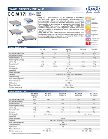 WAGI PRECYZYJNE WLC 17 OIML data wyd. 14-12-2016 ISO 9001 CERTIFIED Wagi WLC przeznaczone są do szybkiego i dokładnego wyznaczania masy w warunkach laboratoryjnych i przemysłowych. Mogą być również używane w miejscach pozbawionych dostępu do zasilania sieciowego (230V) gdyż standardowo są wyposażone w wewnętrzny akumulator oraz złącze RS 232. Wszystkie typy wag (szalka: 195×195, 300×300 i 400×500 mm) posiadają szalkę wykonaną ze stali nierdzewnej oraz podświetlany wyświetlacz LCD gwarantujący dobrą czytelność wyniku. Wagi WLC A2 mają także możliwość ważenia ładunków poza pomostem wagowym (tzw. ważenie podszalkowe), gdzie ładunek podwieszony jest pod wagą. Jest to alternatywa dla ładunków o niestandardowych gabarytach i kształtach. Liczenie sztuk Odchyłki procentowe Doważanie Ważenie zwierząt Sumowanie ważeń Zatrzask max. wskazania Pomiar w Newtonach Dane techniczne: Obciążenie maksymalne Obciążenie minimalne Działka odczytowa [d] Działka legalizacyjna [e] Zakres tary Powtarzalność * Liniowość Wymiar szalki Klasa OIML Sygnał wyjściowy Zasilanie Stopień ochrony Czas stabilizacji pomiaru Temperatura pracy Wyświetlacz Masa netto / brutto Wymiary opakowania WLC 1/A2 WLC 2/A2 - - 1 kg 2 kg - - WLC 6/A2 WLC 20/A2 WLC 10/A2 - - 6 kg 10 kg 20 kg 5g - - 0,1 g 0,1 g 0,01 g 0,01 g 0,1 g - - 1g - - -1 kg -2 kg -6 kg -10 kg -20 kg 0,01 g 0,01 g 0,1 g 0,1 g 0,1 g ±0,03 g ±0,03 g ±0,2 g ±0,3 g ±0,3 g - - - - 195 × 195 mm II RS 232 100 ÷ 240 V AC 50 ÷ 60 Hz / 12 V DC + akumulator IP 43 3s +15° ÷ +30 °C LCD 2,8 kg / 4,3 kg 440 × 280 × 190 mm * - Powtarzalność interpretowana jako odchylenie standardowe Dane techniczne: WLC 12/F1/R WLC 12/F1/K WLC 30/F1/R WLC 30/F1/K WLC 60/C2/R WLC 60/C2/K WLC 120/C2/R WLC 120/C2/K - - - - 6 kg 12 kg 30 kg 60 kg 120 kg 5g - - - - 0,1 g 0,2 g 0,5 g 1g 2g WLC 6/F1/R WLC 6/F1/K Obciążenie maksymalne Obciążenie minimalne Działka odczytowa [d] Działka legalizacyjna [e] Zakres tary Powtarzalność * Liniowość Wymiar szalki Klasa OIML Sygnał wyjściowy Zasilanie Czas stabilizacji pomiaru Temperatura pracy Wyświetlacz Masa netto / brutto Wymiary opakowania 1g - - - - -6 kg -12 kg -30 kg -60 kg -120 kg 0,1 g 0,2 g 0,5 g 1g 2g ±0,2 g ±0,6 g ±1,5 g ±2 g II 300 × 300 mm - * - Powtarzalność interpretowana jako odchylenie standardowe ±6 g 400 × 500 mm - - - RS 232 100 ÷ 240 V AC 50 ÷ 60 Hz / 12 V DC + akumulator 3s +15° ÷ +30 °C LCD 5,2 kg / 6 kg 12,5 kg / 15 kg 570 × 390 × 170 mm 720 × 580 × 220 mm Wymiary: wersja A2 ~206 195 wersja C2/R ~97 87÷103 195 154 208 350x425 Ø36 ~333 427 87÷103 wersja C2/K Ø36 502 502 350 x 425 402 402 wersja F1/K R2 1 300 179 300 70 ± 3 70 ± 3 wersja F1/R <- ~1m -> 1 R2 300 145 300 Wyposażenie dodatkowe: Drukarka EPSON TM-U220D, TM-U220B, TM-U220A Stelaż do ważenia ładunków pod wagą Dodatkowy wyświetlacz LCD Zestaw do wyznaczania gęstości ciał stałych i cieczy Zewnętrzny zasilacz akumulatorowy z ładowarką Walizka do wagi Program komputerowy POMIAR-WIN, RAD-KEY • 26-600 Radom ul. Bracka 28 • tel. +48 48 3848800 • fax. +48 48 3850010 • www.radwag.pl • e-mail:[email protected]