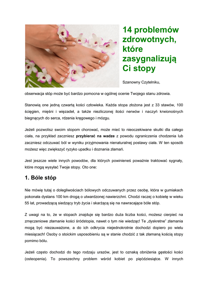 14 problemów zdrowotnych, które zasygnalizują Ci stopy Szanowny Czytelniku, obserwacja stóp może być bardzo pomocna w ogólnej ocenie Twojego stanu zdrowia. Stanowią one jedną czwartą kości człowieka. Każda stopa złożona jest z 33 stawów, 100 ścięgien, mięśni i więzadeł, a także niezliczonej ilości nerwów i naczyń krwionośnych biegnących do serca, rdzenia kręgowego i mózgu. Jeżeli pozwolisz swoim stopom chorować, może mieć to nieoczekiwane skutki dla całego ciała, na przykład zaczniesz przybierać na wadze z powodu ograniczenia chodzenia lub zaczniesz odczuwać ból w wyniku przyjmowania nienaturalnej postawy ciała. W ten sposób możesz więc zwiększyć ryzyko upadku i doznania złamań. Jest jeszcze wiele innych powodów, dla których powinieneś poważnie traktować sygnały, które mogą wysyłać Twoje stopy. Oto one: 1. Bóle stóp Nie mówię tutaj o dolegliwościach bólowych odczuwanych przez osobę, która w gumiakach pokonała dystans 100 km drogą o utwardzonej nawierzchni. Chodzi raczej o kobietę w wieku 55 lat, prowadzącą siedzący tryb życia i skarżącą się na nawracające bóle stóp. Z uwagi na to, że w stopach znajduje się bardzo duża liczba kości, możesz cierpieć na zmęczeniowe złamanie kości śródstopia, nawet o tym nie wiedząc! Te „dyskretne” złamania mogą być niezauważone, a do ich odkrycia niejednokrotnie dochodzi dopiero po wielu miesiącach! Osoby o stoickim usposobieniu są w stanie chodzić z tak złamaną kością stopy pomimo bólu. Jeżeli często dochodzi do tego rodzaju urazów, jest to oznaką obniżenia gęstości kości (osteopenia). To powszechny problem wśród kobiet po pięćdziesiątce. W innych przypadkach powtarzające się złamania świadczą o niedoborze witaminy D, problemie z przyswajaniem wapnia lub o anoreksji. 2. Zanikanie włosków na palcach Do zaniku włosków dochodzi w wyniku złego krążenia krwi, spowodowanego najczęściej chorobą naczyń. Arterioskleroza (stwardnienie ścian tętnic) uniemożliwia prawidłowy dopływ krwi do kończyn. Ciało skupia się na zaopatrzeniu w krew kluczowych narządów. Zapewne rozumiesz: włoski na stopach nie są priorytetem. Inne oznaki, które również sygnalizują problemy z krążeniem: – gdy przykładasz palce do grzbietu stopy, nie wyczuwasz tętna, – kiedy stoisz, Twoja stopa staje się szkarłatnoczerwona i błyszcząca, a gdy ją uniesiesz, szybko staje się biała. Zazwyczaj osoby wiedzą o występujących u nich zaburzeniach układu sercowonaczyniowego, aczkolwiek nie dostrzegają ich skutków. Oczywistym i niezbędnym krokiem, który w takiej sytuacji należy podjąć, jest rozpoczęcie właściwego leczenia choroby. Jeśli chodzi o włoski na Twoich palcach u stóp, zaczną one powoli odrastać, gdy rozpoczniesz leczenie, aczkolwiek nie jest to najistotniejsze. 3. Sucha, łuszcząca się skóra Nawet, jeśli Twoja cera oraz skóra Twoich dłoni są w idealnym stanie, nie zapominaj o pielęgnacji skóry stóp. Grzybica i infekcje grzybicze nie są przywilejem mistrzów olimpijskich. Suche i podrażnione stopy są podatne na powstawanie pęcherzy. Gdy dochodzi do pęknięcia pęcherzy lub gdy skóra zaczyna się łuszczyć, wówczas zwykle wdaje się infekcja. Grzybica rozwija się najczęściej w przestrzeni między palcami nóg, a na skutek drapania może rozprzestrzenić się na inne części ciała takie jak pachy i krocze. Łagodne przypadki są łatwe do wyleczenia. Wystarczy, że będziesz często mył stopy, zwracając szczególną uwagę na dokładne osuszanie ich ręcznikiem. Poza tym mocz nogi w zimnej wodzie z dodatkiem sody oczyszczonej i wody utlenionej, które zabijają grzyby. Aby utrzymać stopy w suchości, używaj talku do skarpet i butów. Jeżeli w ciągu dwóch tygodni nie przyniesie to żadnej poprawy, poproś lekarza, aby przepisał Ci leki przeciwgrzybicze do stosowania doustnego bądź miejscowego. 4. Paznokcie wygięte na kształt łyżeczki Odkształcenie płytki paznokci często spowodowane jest znacznymi niedoborami żelaza (anemia). Krew zawiera wówczas małą ilość hemoglobiny, czyli bogatego w żelazo białka zawartego w erytrocytach, które jest ważne w transporcie tlenu w organizmie. Do niedoboru żelaza dochodzi najczęściej w przypadku wewnętrznych krwotoków (np. choroba wrzodowa) oraz obfitych miesiączek. Jeżeli cierpisz na anemię, możesz zauważyć również, że Twoje stopy często są zimne, paznokcie łamliwe, a płytka paznokciowa – zarówno u stóp jak i rąk – bardzo blada. Anemii często towarzyszą zawroty, bóle głowy, silne zmęczenie i krótki oddech. Badanie morfologii krwi pozwala rozpoznać anemię. Zazwyczaj wystarczy zmiana diety oraz kuracja żelazem i witaminą C w formie suplementów. Pamiętaj, że witamina C ułatwia wchłanianie żelaza. 5. Palce pałeczkowate Jeżeli końce palców u Twoich stóp są nienaturalnie powiększone, a paznokcie wyglądem zaczynają przypominać wypukłe szkiełka od zegarka, mamy do czynienia z chorobą o nazwie palce Hipokratesa, od nazwiska tego, który opisał to zjawisko około dwóch tysięcy lat temu. Najczęstszą przyczyną pałeczkowatości palców są choroby płuc, w tym rak płuc, choroby serca lub zaburzenia żołądkowo-jelitowe takie jak choroba Leśniowskiego-Crohna. W chorobie tej niektóre palce mogą również przybierać kształt pałeczek dobosza. 6. Skurcze stóp Ten gwałtowny skurcz mięśnia dopada Cię nagle jak uderzenie pioruna. Zazwyczaj występuje podczas intensywnego wysiłku fizycznego lub gdy jesteś odwodniony. Jednak gdy skurcze często się powtarzają, jest to oznaką niedoboru wapnia, potasu i magnezu w Twoim organizmie. Spożywaj zatem więcej warzyw, pij wodę mineralną bogatą w minerały i przed snem dobrze rozciągnij stopy. 7. Zimne stopy To kobiety najczęściej cierpią na syndrom „zimnych stóp” – ku rozpaczy współmałżonków. U kobiet po czterdziestce zimne