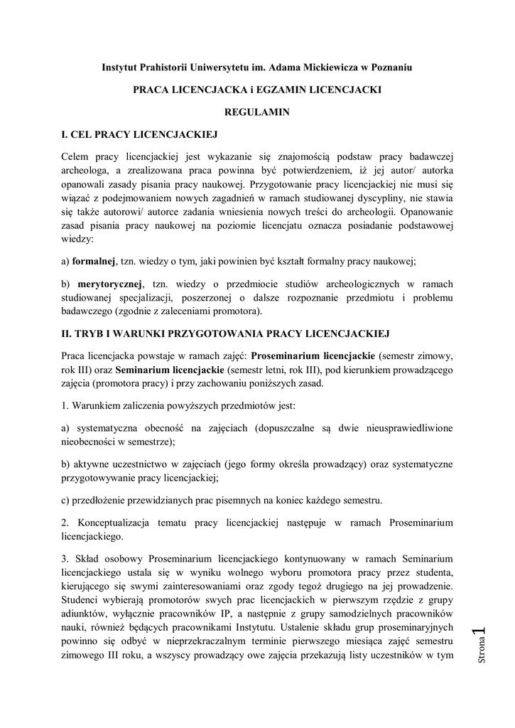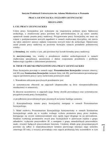 Instytut Prahistorii Uniwersytetu im. Adama Mickiewicza w Poznaniu PRACA LICENCJACKA i EGZAMIN LICENCJACKI REGULAMIN I. CEL PRACY LICENCJACKIEJ Celem pracy licencjackiej jest wykazanie się znajomością podstaw pracy badawczej archeologa, a zrealizowana praca powinna być potwierdzeniem, iż jej autor/ autorka opanowali zasady pisania pracy naukowej. Przygotowanie pracy licencjackiej nie musi się wiązać z podejmowaniem nowych zagadnień w ramach studiowanej dyscypliny, nie stawia się także autorowi/ autorce zadania wniesienia nowych treści do archeologii. Opanowanie zasad pisania pracy naukowej na poziomie licencjatu oznacza posiadanie podstawowej wiedzy: a) formalnej, tzn. wiedzy o tym, jaki powinien być kształt formalny pracy naukowej; b) merytorycznej, tzn. wiedzy o przedmiocie studiów archeologicznych w ramach studiowanej specjalizacji, poszerzonej o dalsze rozpoznanie przedmiotu i problemu badawczego (zgodnie z zaleceniami promotora). II. TRYB I WARUNKI PRZYGOTOWANIA PRACY LICENCJACKIEJ Praca licencjacka powstaje w ramach zajęć: Proseminarium licencjackie (semestr zimowy, rok III) oraz Seminarium licencjackie (semestr letni, rok III), pod kierunkiem prowadzącego zajęcia (promotora pracy) i przy zachowaniu poniższych zasad. 1. Warunkiem zaliczenia powyższych przedmiotów jest: a) systematyczna obecność na zajęciach (dopuszczalne są dwie nieusprawiedliwione nieobecności w semestrze); b) aktywne uczestnictwo w zajęciach (jego formy określa prowadzący) oraz systematyczne przygotowywanie pracy licencjackiej; c) przedłożenie przewidzianych prac pisemnych na koniec każdego semestru. Strona 3. Skład osobowy Proseminarium licencjackiego kontynuowany w ramach Seminarium licencjackiego ustala się w wyniku wolnego wyboru promotora pracy przez studenta, kierującego się swymi zainteresowaniami oraz zgody tegoż drugiego na jej prowadzenie. Studenci wybierają promotorów swych prac licencjackich w pierwszym rzędzie z grupy adiunktów, wyłącznie pracowników IP, a następnie z grupy samodzielnych pracowników nauki, również będących pracownikami Instytutu. Ustalenie składu grup proseminaryjnych powinno się odbyć w nieprzekraczalnym terminie pierwszego miesiąca zajęć semestru zimowego III roku, a wszyscy prowadzący owe zajęcia przekazują listy uczestników w tym 1 2. Konceptualizacja tematu pracy licencjackiej następuje w ramach Proseminarium licencjackiego. czasie na ręce dyrektora ds. dydaktycznych IP. Liczba uczestników danego proseminarium (a następnie seminarium) nie może przekroczyć 8 osób. 4. Warunkiem zaliczenia przedmiotu Proseminarium licencjackie (6 pkt. ECTS) jest złożenie do końca trwania zajęć, zaakceptowanego przez prowadzącego, pisemnego konspektu pracy licencjackiej oraz wstępu do niej. Ostateczna wersja konspektu musi zawierać: projektowany tytuł pracy licencjackiej, jasne sformułowanie przedmiotu i problemu(ów) pracy, określenie układu pracy wraz z opisem jej części, omówienie podstaw źródłowych pracy (literatura, źródła empiryczne, ikonograficzne, teksty i inskrypcje starożytne), podstawową bibliografię. 5. Brak zaliczenia Proseminarium licencjackiego uniemożliwia kontynuację studiów w semestrze letnim na III roku, to jest uczestnictwo w Seminarium licencjackim. 6. W trakcie Seminarium licencjackiego student/ studentka, w oparciu o wcześniej przygotowany konspekt pracy oraz wstęp do niej, przystępują do systematycznego pisania kolejnych części pracy licencjackiej. Zmiana zakreślonego w konspekcie tematu pracy jest możliwa wyłącznie w wyjątkowych sytuacjach, w ciągu pierwszego miesiąca zajęć. Wszystkie realizowane tematy prac licencjackich promotorzy przekazują w formie ich ostatecznie ustalonych tytułów, w wersji polsko- i anglojęzycznej, na ręce dyrektora ds. dydaktycznych IP, najpóźniej w maju danego roku. Są one akceptowane przez Radę Instytutu i przekazywane do akceptacji Rady Wydziału Historycznego. 7. Zaliczenie przedmiotu Seminarium licencjackie (20 pkt. ECTS) następuje po przyjęciu gotowej pracy i jej ocenie, co umożliwia przystąpienie do egzaminu licencjackiego. W miarę możliwości zaleca się aby pisanie prac zakończyć do 30 czerwca. III. WARUNKI PRZYJĘCIA PRACY LICENCJACKIEJ Aby praca licencjacka mogła zostać przyjęta, spełnione powinny być następujące kryteria: 1. Kryteria związane z trybem i warunkami przygotowania pracy licencjackiej (por. wyżej część II). Strona 3. Kryteria poprawności językowej: a) poprawność ortograficzna; b) poprawność gramatyczna; 2 2. Kryteria edytorskie: a) objętość pracy (praca powinna mieć nie mniej niż 30 stron tekstu bez tabel i ilustracji); b) forma maszynopisu (czcionka 12 pkt., odstęp 1,5; około 1800-2000 znaków wraz ze spacjami na stronie); c) praca oprawiona bądź zbindowana; d) dwa egzemplarze pracy (tekst sczytany) plus jej zapis elektroniczny na opisanej płycie CD (tekst zwarty, format pdf); e) podpisane oświadczenie o samodzielnym napisaniu pracy oraz zgodności wersji elektronicznej z drukowaną, umieszczone na pierwszej, po tytułowej, stronie pracy (patrz zał. nr 1. Oświadczenie). c) poprawność stylistyczna. 4. Kryteria formalne: a) poprawnie i według jednakowych zasad sporządzona bibliografia; b) poprawnie sporządzone przypisy (w obu przypadkach należy przyjąć konsekwentnie jeden, z wielu możliwych stylów zapisu, ten który zaleci promotor pracy); c) opisane tabele, ilustracje i wykresy (numeracja, tytuł, informacja o źródle, z którego pochodzą). 5. Kryteria związane z układem i redakcją pracy: a) układ pracy - praca powinna składać się z następujących części: - tytułu jasno określającego temat pracy (możliwy jest tytuł metaforyczny ale wówczas uzupełniony podtytułem objaśniającym konkretniej temat pracy), - części wprowadzającej, w której winny być określone i omówione - cel pracy przez wskazanie przedmiotu (obiekt zainteresowań, analiz