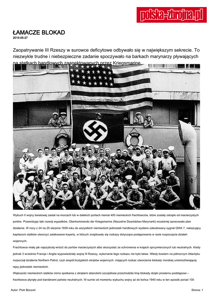 ŁAMACZE BLOKAD 2015-05-27 Zaopatrywanie III Rzeszy w surowce deficytowe odbywało się w największym sekrecie. To niezwykle trudne i niebezpieczne zadanie spoczywało na barkach marynarzy pływających na statkach handlowych zaanektowanych przez Kriegsmarine. Wybuch II wojny światowej zastał na morzach lub w dalekich portach niemal 400 niemieckich frachtowców, które zostały odcięte od macierzystych portów. Przewidując taki rozwój wypadków, Oberkommando der Kriegsmarine (Naczelne Dowództwo Marynarki) wcześniej opracowało plan działania. W nocy z 24 na 25 sierpnia 1939 roku do wszystkich niemieckich jednostek handlowych wysłano zakodowany sygnał QWA 7, nakazujący kapitanom statków otworzyć zalakowane koperty, w których znajdowały się rozkazy dotyczące postępowania w razie rozpoczęcia działań wojennych. Frachtowce miały jak najszybciej wrócić do portów macierzystych albo skorzystać ze schronienia w krajach sprzymierzonych lub neutralnych. Kiedy jednak 3 września Francja i Anglia wypowiedziały wojnę III Rzeszy, wykonanie tego rozkazu nie było łatwe. Wtedy bowiem na północnym Atlantyku rozpoczął działania Northern Patrol, czyli zespół brytyjskich okrętów wojennych, mających rozkaz utworzenia blokady morskiej uniemożliwiającej rejsy jednostek niemieckich. Większość niemieckich statków mimo spotkania z okrętami alianckimi szczęśliwie przechodziła linię blokady dzięki prostemu podstępowi – frachtowce płynęły pod banderami państw neutralnych. W sumie od momentu wybuchu wojny aż do końca 1940 roku w ten sposób ponad 100 Autor: Piotr Boczoń Strona: 1 niemieckich jednostek przedarło się do portów niemieckich. Statki te wracały albo z pustymi ładowniami, albo z towarami, z którymi wypłynęły. Część jednostek handlowych znalazła schronienie w portach japońskich. Niektóre Niemcy sprzedali za bezcen Japończykom, ale resztę postanowili wykorzystać do transportu surowców deficytowych, niezbędnych dla gospodarki niemieckiej, z portów dalekowschodnich do tych będących pod kontrolą niemiecką. Statki przewoziły więc w ładowniach: platynę, molibden, wanad czy wolfram, a czasami również towary, które w czasie wojny w Niemczech uznawano za dobra luksusowe. „Elsa Essberger”, na przykład, który wypłynął w kierunku Europy w styczniu 1942 roku, miał na pokładzie 48 t rudy tungstenu, 266 t opon, 4059 t kauczuku, 5,5 t cyny, 17 t oleju drzewnego, 334 t oleju kokosowego, 990 t olejków ziemnych, 124 t kawy, 106 t herbaty, 89 t konopi, 65 t jajek w proszku i 7,5 t gałki muszkatołowej. W sumie statek przewoził prawie 6800 t ładunku. Aby zapobiec przejęciu tak cennego towaru przez aliantów, na frachtowcach zakładano ładunki wybuchowe. Kapitan miał je odpalić, gdyby uznał, że nie ma możliwości uniknięcia przejęcia jego statku przez okręty przeciwnika. Na jednostkach handlowych montowano też zamaskowane działka przeciwlotnicze, które miały służyć do obrony przed samolotami przeciwnika. Przetarty szlak „Emden” (niektóre źródła podają, że frachtowiec nosił nazwę „Ermland”) był pierwszym łamaczem blokad (Blockadenbrecher). W ostatnich dniach sierpnia 1939 roku zgodnie z rozkazem dopłynął do okupowanej przez armię japońską wyspy Formoza. Po blisko rocznym pobycie w portach japońskich 28 grudnia 1940 roku wyruszył w rejs do Niemiec z dość szczególnym zadaniem. Na jego pokład podczas rejsu okrętowano jeńców brytyjskich – marynarzy z zatopionych bądź wziętych w pryz przez niemieckie korsarskie okręty nawodne z brytyjskich statków handlowych. Wśród nich było sześciu polskich marynarzy – członków załogi M/s „Batory”, którzy jako pasażerowie płynęli na jednym z zatopionych przez niemieckie krążowniki pomocnicze brytyjskich statków handlowych. Po blisko 100-dniowym rejsie statek dotarł do okupowanego przez wojska niemieckie portu Bordeaux. Udana akcja wywołała euforię w niemieckim dowództwie, które wydało rozkaz, aby jeszcze tego samego roku jego śladem podążyły kolejne statki, tym razem jednak już przewożące surowce niezbędne dla gospodarki III Rzeszy. Wkrótce do portów przeznaczenia wyruszyło siedem niemieckich jednostek oraz dwie włoskie. Tym razem Niemcy i ich sojusznicy nie mieli już tyle szczęścia. Alianci dwa statki przechwycili i zatopili. Jeden zaś został posłany na dno przez... niemiecki U-Boot U-333. Nie był to odosobniony przypadek. Podobny los spotkał frachtowiec „Doggerbank”. Była to strata tym poważniejsza dla Niemców, że na jego pokładzie byli członkowie załóg łamacza blokady „Uckermark” i krążownika pomocniczego „Thor”, które w wyniku przypadkowej eksplozji zostały zniszczone 30 listopada 1942 roku w porcie w Jokohamie. Frachtowiec wypłynął z Batavii 15 stycznia 1943 roku i bez przeszkód pokonał Pacyfik. Dowództwo niemieckie, w obawie przed możliwością zatopienia jednostki przez własne okręty podwodne, wydało rozkaz, aby te nie atakowały samotnych frachtowców w rejonie, gdzie miał się pojawić „Doggerbank”. Nie wiadomo, czy rozkaz został wysłany za późno, czy U-43 go nie odebrał. Wieczorem 3 marca frachtowiec został trafiony trzema torpedami i błyskawicznie zatonął. Do jedynej ocalałej szalupy dotarło 15 marynarzy, w tym kapitan. Po kliku dniach dryfowania w czasie sztormu łódź się wywróciła i ośmiu rozbitków przypłaciło to życiem. Pozostali stracili nadzieję na ratunek i popełnili samobójstwo (jeden z marynarzy miał przy sobie broń). I tak z 365 osób na pokładzie uratował się tylko jeden marynarz – Fritz Kuert. Na cztery dni przed odnalezieniem przez hiszpański statek handlowy zmarł jego ostatni pozostający przy życiu towarzysz z szalupy. Niemiecki marynarz dryfował po oceanie 26 dni. Zakamuflowana jednostka Najbardziej intrygująca historia to zatrzymanie przez okręty amerykańskie frachtowca „Odenwald”. Zani