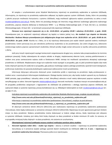 Informacja o rejestracji na przedmioty wybieralne (podstawowe i kierunkowe) W związku z uruchomieniem przez Wydział Mechaniczny rejestracji na przedmioty wybieralne w systemie USOSweb, informujemy, że rejestracja na przedmioty wybieralne odbywać się będzie poprzez system USOSweb. Osoby, które nie posiadają z jakichś przyczyn możliwości korzystania z systemu USOSweb, mają możliwość zgłoszenia wyboru przedmiotu na adres e‐mail: [email protected]. Osoby, które nie posiadają dostępu do Internetu mogą dokonać osobistego zgłoszenia wybranego przedmiotu, poprzez złożenie deklaracji w Dziekanacie WME – u p. Mikołaja Sobierajskiego (pok. 17 bud. 62) lub u p. Jarosława Wiśniewskiego (pok. 15 bud. 62) – w terminach oznaczonych dla rejestracji USOSweb. Pierwsza tura rejestracji rozpocznie się w dn. 14.03.2012r. od godziny 05:00 i zakończy 25.03.2012r. o godz. 24:00. Przewidywane jest, że większość rejestracji odbywać się będzie w trakcie jednej tury. Na studiach I‐go stopnia na kierunku Mechanika i Budowa Maszyn przewidywana jest obligatoryjna druga tura wyborów od dn. 28.03.2012r. od godz. 05:00 do dn. 09.04.2012r. do godz. 24:00. Wynika to z faktu, że w tej rejestracji dokonywany jest wybór dwóch spośród siedmiu możliwych przedmiotów. Celem pierwszej tury jest określenie preferencji studentów co do przedmiotów. Zaś celem drugiej tury, dokonanie ostatecznego wyboru poprzez uprawnionych studentów, których prośby mogły zostać odrzucone w wyniku odrzucenia przedmiotu z oferty. Jeśli przy innych rejestracjach wystąpi konieczność zorganizowania drugiej tury, zostania taka przeprowadzona (w terminie podanym powyżej). Osoby zobowiązane do wzięcia udziału w drugiej, nieplanowanej obecnie turze, zostaną poinformowane e‐ mailem oraz przez zamieszczenie wykazu osób w Dziekanacie WME. Istnieje też możliwość sprawdzenia akceptacji wybranego przedmiotu w USOSweb. Nieplanowana druga tura wyborów może wystąpić w przypadku, gdy na jakiś przedmiot będzie zbyt mała liczba chętnych (poniżej 25 osób) lub w przypadku, gdy podczas możliwego wyboru jednego przedmiotu spośród trzech dostępnych, preferencje studentów nie pozwolą bezkolizyjnie zaplanować jednocześnie trzech przedmiotów. Informacje dotyczące odrzucenia złożonych przez studentów próśb o rejestrację na przedmiot, będą przekazywane e‐ mailem wraz z ewentualnymi informacjami dodatkowymi. Dlatego bardzo istotne jest, aby każdy student upewnił się czy Dziekanat WME posiada, jego prawidłowy i aktualny adres e‐mail. Weryfikacji adresów e‐mail należy dokonywać poprzez wysłanie e‐maila weryfikującego na adres: kierunek logistyka [email protected]; kierunek mechanika i budowa maszyn [email protected]. W przypadku problemów związanych z logowaniem do USOSweb lub problemów z obsługą rejestracji poprzez USOSweb, lub wykryciem błędu w systemie rejestracji, proszę kontaktować się z p. Mikołajem Sobierajskim (e‐mail: [email protected]; tel.: 22‐683‐77‐27). Instrukcja rejestracji na przedmioty wybieralne dla studentów Wydziału Mechanicznego, znajduje się pod adresem: http://www.wme.wat.edu.pl/download/Instrukcja_rejestracji_na_przedmioty_wybieralne.pdf Informacja o rejestracji na przedmioty wybieralne (podstawowe i kierunkowe), znajduje się pod adresem: http://www.wme.wat.edu.pl/download/Informacja_o_rejestracji_na_przedmioty_wybieralne.pdf W obecnym semestrze letnim 2011/12 (2011/12L) jest realizowana rejestracja na przedmioty wybieralne podstawowe i kierunkowe, które będą realizowane w semestrze zimowym 2012/13 (2012/13Z). Rejestracja nie jest ograniczona górnym limitem miejsc na dany przedmiot. Wyboru przedmiotów można dokonywać w trakcie całego okresu, kiedy rejestracja jest aktywna w systemie USOSweb. Ustalony jest dolny limit liczby chętnych na dany przedmiot w liczbie minimum 25 osób. Co oznacza, że w przypadku mniejszej liczby chętnych na dany przedmiot, nie zostanie on uruchomiony. Obowiązkowej rejestracji podlegają wszyscy studenci realizujący poniższe plany studiów: 1. Kierunek logistyka nabór 2011 – studia I‐go stopnia – obecny 2 semestr studiów – rejestracja na przedmiot wybieralny kierunkowy w 3 semestrze (wybór jednego spośród dwóch możliwych) (w USOSweb: LOG I st. 3 sem. – rejestracja na przedmiot wybieralny kierunkowy). Planowana jedna tura rejestracyjna. 2. Kierunek mechanika i budowa maszyn nabór 2011 – studia I‐go stopnia – obecny 2 semestr studiów – rejestracja na przedmiot wybieralny podstawowy w 3 semestrze (wybór jednego spośród dwóch mozliwych) (w USOSweb: MiBM I st. 3 sem – rejestracja na przedmiot wybieralny podstawowy). Planowana jedna tura rejestracyjna. 3. Kierunek mechanika i budowa maszyn nabór 2011 – studia I‐go stopnia – obecny 2 semestr studiów – rejestracja na przedmioty wybieralny kierunkowe w 3 semestrze (wybór dwóch spośród siedmiu możliwych) (w USOSweb: MiBM I st. 3 sem – rejestracja na przedmioty wybieralne podstawowe). Planowane są dwie tury rejestracyjne. 4. Kierunek logistyka nabór luty 2012 – studia II‐go stopnia – obecny 1 semestr studiów – rejestracja na przedmiot wybieralny podstawowy w 2 semestrze (wybór jednego spośród dwóch możliwych) (w USOSweb: LOG II st. 2 sem. – rejestracja na przedmiot wybieralny podstawowy). Planowana jedna tura rejestracyjna. 5. Kierunek logistyka nabór luty 2012 – studia II‐go stopnia – obecny 1 semestr studiów – rejestracja na przedmiot wybieralny kierunkowy Nr 1, w 2 semestrze (wybór jednego spośród dwóch możliwych) (w USOSweb: LOG II st. 2 sem. – rejestracja na przedmiot wybieralny kierunkowy Nr 1). Planowana jedna tura rejestracyjna. 6. Kierunek logistyka nabór luty 2012 – studia II‐go stopnia – obecny 1 semestr studiów – rejestracja na przedmiot wybieralny kierunkowy Nr 2, w 2 semestrze (wybór jednego spośród dwóch możliwych) (w USOSweb: LO