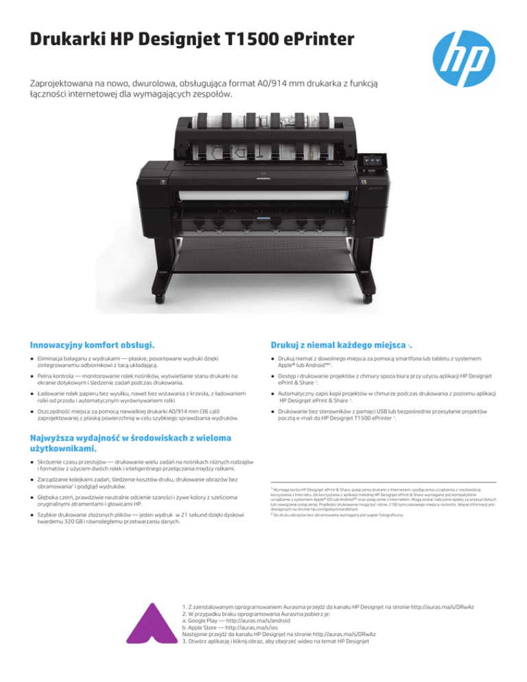 Drukarki HP Designjet T1500 ePrinter Zaprojektowana na nowo, dwurolowa, obsługująca format A0/914 mm drukarka z funkcją łączności internetowej dla wymagających zespołów. Innowacyjny komfort obsługi. Drukuj z niemal każdego miejsca . ● Eliminacja bałaganu z wydrukami — płaskie, posortowane wydruki dzięki zintegrowanemu odbiornikowi z tacą układającą. ● Drukuj niemal z dowolnego miejsca za pomocą smartfona lub tabletu z systemem Apple® lub Android™1. ● Pełna kontrola — monitorowanie rolek nośników, wyświetlanie stanu drukarki na ekranie dotykowym i śledzenie zadań podczas drukowania. ● Dostęp i drukowanie projektów z chmury spoza biura przy użyciu aplikacji HP Designjet ePrint & Share 1. ● Ładowanie rolek papieru bez wysiłku, nawet bez wstawania z krzesła, z ładowaniem rolki od przodu i automatycznym wyrównywaniem rolki. ● Automatyczny zapis kopii projektów w chmurze podczas drukowania z poziomu aplikacji HP Designjet ePrint & Share 1. ● Oszczędność miejsca za pomocą niewielkiej drukarki A0/914 mm (36 cali) zaprojektowanej z płaską powierzchnią w celu szybkiego sprawdzania wydruków. ● Drukowanie bez sterowników z pamięci USB lub bezpośrednie przesyłanie projektów pocztą e-mail do HP Designjet T1500 ePrinter 1. 1 Najwyższa wydajność w środowiskach z wieloma użytkownikami. ● Skrócenie czasu przestojów — drukowanie wielu zadań na nośnikach różnych rodzajów i formatów z użyciem dwóch rolek i inteligentnego przełączania między rolkami. ● Zarządzanie kolejkami zadań, śledzenie kosztów druku, drukowanie obrazów bez obramowania2 i podgląd wydruków. ● Głęboka czerń, prawdziwie neutralne odcienie szarości i żywe kolory z sześcioma oryginalnymi atramentami i głowicami HP. ● Szybkie drukowanie złożonych plików — jeden wydruk w 21 sekund dzięki dyskowi twardemu 320 GB i równoległemu przetwarzaniu danych. 1 Wymaga konta HP Designjet ePrint & Share, połączenia drukarki z Internetem i podłączenia urządzenia z możliwością korzystania z Internetu. Do korzystania z aplikacji mobilnej HP Designjet ePrint & Share wymagane jest kompatybilne urządzenie z systemem Apple® iOS lub Android™ oraz połączenie z Internetem. Mogą zostać naliczone opłaty za przesył danych lub nawiązanie połączenia. Prędkości drukowania mogą być różne. 2 GB tymczasowego miejsca na konto. Więcej informacji jest dostępnych na stronie hp.com/go/eprintandshare. 2 Do druku obrazów bez obramowania wymagany jest papier fotograficzny. 1. Z zainstalowanym oprogramowaniem Aurasma przejdź do kanału HP Designjet na stronie http://auras.ma/s/DRwAz 2. W przypadku braku oprogramowania Aurasma pobierz je: a. Google Play — http://auras.ma/s/android b. Apple Store — http://auras.ma/s/ios Następnie przejdź do kanału HP Designjet na stronie http://auras.ma/s/DRwAz 3. Otwórz aplikację i kliknij obraz, aby obejrzeć wideo na temat HP Designjet Drukarki HP Designjet T1500 ePrinter Dane techniczne Drukowanie Zawartość opakowania Rysunki liniowe 21 s/str., 120 wydruków A1 na godzinę, 60 wydruków A0 na godzinę Rozdzielczość druku Maks. rozdzielczość optymalizowana 2400x1200 dpi z rozdzielczości wejściowej 1200x1200 dpi z optymalizacją dla wybranego papieru fotograficznego Marginesy (górny x dolny x lewy x prawy) Rolka: 5 x 5 x 5 x 5 mm (bez marginesu na papierze fotograficznym) Arkusz: 5 x 22 x 5 x 5 mm Technologia Technologia termiczna HP Inkjet Typy atramentów Barwnikowe (C, G, M, pK, Y); pigmentowe (mK) Kolory atramentu 6 (błękitny, szary, purpurowy, czarny matowy, czarny fotograficzny, żółty) Objętość kropli atramentu 6 pl (C, M, Y, G, pK); 9 pl (mK) Pojemność Wkład atramentowy HP 727: błękitny, szary, purpurowy, czarny matowy, czarny fotograficzny, żółty (130 ml); czarny matowy (69 ml); błękitny, szary, purpurowy, czarny fotograficzny, żółty (40 ml) Ilość dysz głowicy drukującej 9632 Głowice drukujące 1 (błękitny, szary, purpurowy, czarny matowy, czarny fotograficzny, żółty) Dokładność linii +/- 0.1% Informacje o precyzji linii: +/- 0,1% podanej długości wektora lub +/- 0,2 mm (większa z tych wartości) przy 23°C (73°F) i wilgotności względnej 50-60%, na nośniku matowym HP A0/E w trybie najwyższej lub normalnej jakości, z wykorzystaniem oryginalnych atramentów HP Minimalna grubość linii 0,02 mm (adresowalne przez HP-GL/2) Gwarantowana min szerokość wiersza 0,07 mm (ISO/IEC 13660:2001(E)) Maksymalna długość nośnika 91 m Maksymalna waga nośnika 11,9 kg Maks. gęstość optyczna 6 L* min/2,15 D Nośnik Wejście: podawanie dwóch rolek z automatycznym ładowaniem; inteligentne przełączanie między rolkami; podawanie arkuszy; Wyjście: wbudowany odbiornik z tacą układającą (od A4 do A0, maksymalna pojemność 50 A1-size); kosz; automatyczna obcinarka Obsługa Papier typu bond i powlekany (bond, powlekany, powlekany o wysokiej gramaturze, papier o bardzo wysokiej gramaturze oraz matowy, kolorowy), papier techniczny (kalka kreślarska, papier bond półprzezroczysty, welinowy), folia (przezroczysta, matowa, poliestrowa), papier fotograficzny (satynowany, błyszczący, półbłyszczący, matowy, o wysokim połysku), nośnik podświetlany, nośnik samoprzylepny (two-view cling, papier do użytku w pomieszczeniach, polipropylenowy, winylowy) Typy Waga od 60 do 328 g/m² Format od 210x279 do 914x1219 mm Grubość Do 0,5 mm (do 0,6 mm przy druku do tacy odbiorczej w trybie ręcznym) Pamięć Standardowo 64 GB pamięci (wirtualnej) przy 1 GB pamięci RAM Dysk twardy Standardowo 320 GB Sieci i łączność Interfejs Gigabit Ethernet (1000Base-T) (obejmuje wbudowany serwer druku Jetdirect) Interfejsy (standard) Języki drukowania (standard) CR356A HP Designjet T1500 ePrinter 914 mm (36 cali); głowica drukująca; wkłady atramentowe; taca układająca; podstawa drukarki; osie na role papieru; skrócona instrukcja obsługi; plakat instalacyjn