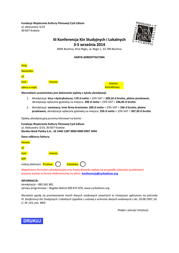 Fundacja Wspierania Kultury Filmowej Cyrk Edison ul. Aleksandry 3/19 30-837 Kraków III Konferencja Kin Studyjnych i Lokalnych 3-5 września 2014 MDK Bochnia, Kino Regis, ul. Regis 1, 32-700 Bochnia KARTA AKREDYTACYJNA Imię: Nazwisko: ul: kod: miasto: telefon kontaktowy: adres e-mail: Warunkiem uczestnictwa jest dokonanie wpłaty z tytułu akredytacji: 1. Akredytacje: kina i dystrybutorzy: 170 zł netto + 23% VAT = 209,10 zł brutto, płatne przelewem, akredytacje opłacone gotówką na miejscu: 200 zł netto + 23% VAT = 246,00 zł brutto 2. Akredytacje: wystawcy, inne firmy branżowe: 200 zł netto + 23% VAT = 246 zł brutto, płatne przelewem, akredytacje opłacone gotówką na miejscu: 250 zł netto + 23% VAT = 307,50 zł brutto Opłatę akredytacyjną prosimy kierować na konto : Fundacja Wspierania Kultury Filmowej Cyrk Edison ul. Aleksandry 3/19, 30-837 Kraków Nordea Bank Polska S.A.: 16 1440 1387 0000 0000 0997 3494 Dane odbiorcy faktury: Nazwa: ul: kod: miasto: NIP: rodzaj płatności: Przelew: Gotówka: Wypełniony formularz akredytacyjny oraz kopię dowodu wpłaty (w przypadku płatności przelewem) prosimy wysłać w formie elektronicznej na adres: [email protected] INFORMACJE: akredytacja – 882 041 881 sprawy programowe – Bogdan Balicki 600 875 878, www.cyrkedison.org Wyrażam zgodę na przetwarzanie moich danych osobowych zawartych w niniejszym zgłoszeniu na potrzeby III. Konferencji Kin Studyjnych i Lokalnych (zgodnie z ustawą o ochronie danych osobowych z dn. 29.08.1997, Dz. U. Nr 133, poz. 883) Podpis i pieczęć instytucji DRUKUJ
