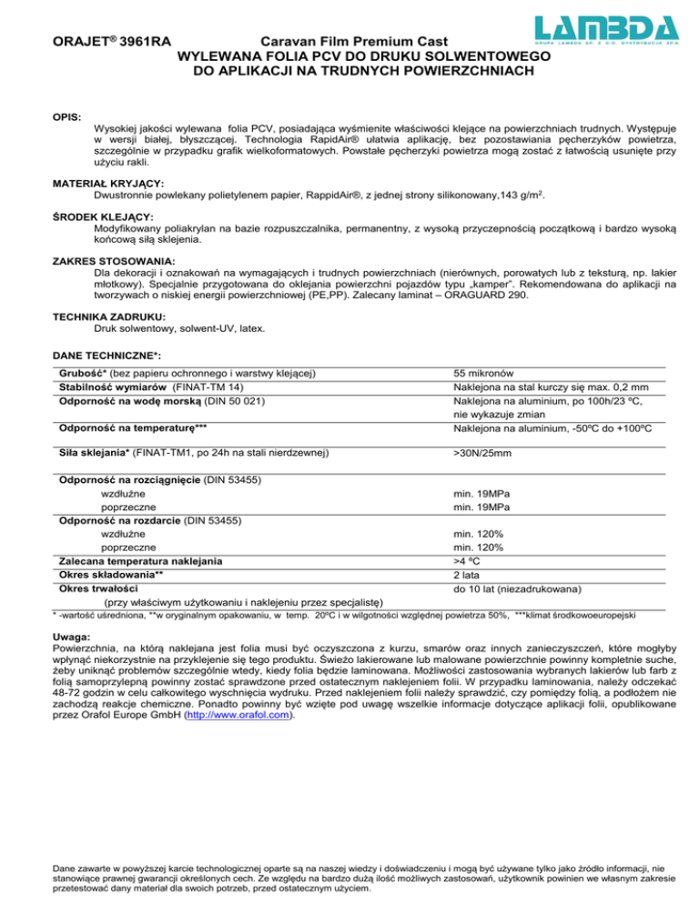 ORAJET® 3961RA Caravan Film Premium Cast WYLEWANA FOLIA PCV DO DRUKU SOLWENTOWEGO DO APLIKACJI NA TRUDNYCH POWIERZCHNIACH OPIS: Wysokiej jakości wylewana folia PCV, posiadająca wyśmienite właściwości klejące na powierzchniach trudnych. Występuje w wersji białej, błyszczącej. Technologia RapidAir® ułatwia aplikację, bez pozostawiania pęcherzyków powietrza, szczególnie w przypadku grafik wielkoformatowych. Powstałe pęcherzyki powietrza mogą zostać z łatwością usunięte przy użyciu rakli. MATERIAŁ KRYJĄCY: Dwustronnie powlekany polietylenem papier, RappidAir®, z jednej strony silikonowany,143 g/m2. ŚRODEK KLEJĄCY: Modyfikowany poliakrylan na bazie rozpuszczalnika, permanentny, z wysoką przyczepnością początkową i bardzo wysoką końcową siłą sklejenia. ZAKRES STOSOWANIA: Dla dekoracji i oznakowań na wymagających i trudnych powierzchniach (nierównych, porowatych lub z teksturą, np. lakier młotkowy). Specjalnie przygotowana do oklejania powierzchni pojazdów typu „kamper”. Rekomendowana do aplikacji na tworzywach o niskiej energii powierzchniowej (PE,PP). Zalecany laminat – ORAGUARD 290. TECHNIKA ZADRUKU: Druk solwentowy, solwent-UV, latex. DANE TECHNICZNE*: Grubość* (bez papieru ochronnego i warstwy klejącej) Stabilność wymiarów (FINAT-TM 14) Odporność na wodę morską (DIN 50 021) Odporność na temperaturę*** 55 mikronów Naklejona na stal kurczy się max. 0,2 mm Naklejona na aluminium, po 100h/23 ºC, nie wykazuje zmian Naklejona na aluminium, -50ºC do +100ºC Siła sklejania* (FINAT-TM1, po 24h na stali nierdzewnej) >30N/25mm Odporność na rozciągnięcie (DIN 53455) wzdłużne poprzeczne Odporność na rozdarcie (DIN 53455) wzdłużne poprzeczne Zalecana temperatura naklejania Okres składowania** Okres trwałości (przy właściwym użytkowaniu i naklejeniu przez specjalistę) min. 19MPa min. 19MPa min. 120% min. 120% >4 ºC 2 lata do 10 lat (niezadrukowana) * -wartość uśredniona, **w oryginalnym opakowaniu, w temp. 20ºC i w wilgotności względnej powietrza 50%, ***klimat środkowoeuropejski Uwaga: Powierzchnia, na którą naklejana jest folia musi być oczyszczona z kurzu, smarów oraz innych zanieczyszczeń, które mogłyby wpłynąć niekorzystnie na przyklejenie się tego produktu. Świeżo lakierowane lub malowane powierzchnie powinny kompletnie suche, żeby uniknąć problemów szczególnie wtedy, kiedy folia będzie laminowana. Możliwości zastosowania wybranych lakierów lub farb z folią samoprzylepną powinny zostać sprawdzone przed ostatecznym naklejeniem folii. W przypadku laminowania, należy odczekać 48-72 godzin w celu całkowitego wyschnięcia wydruku. Przed naklejeniem folii należy sprawdzić, czy pomiędzy folią, a podłożem nie zachodzą reakcje chemiczne. Ponadto powinny być wzięte pod uwagę wszelkie informacje dotyczące aplikacji folii, opublikowane przez Orafol Europe GmbH (http://www.orafol.com). Dane zawarte w powyższej karcie technologicznej oparte są na naszej wiedzy i doświadczeniu i mogą być używane tylko jako źródło informacji, nie stanowiące prawnej gwarancji określonych cech. Ze względu na bardzo dużą ilość możliwych zastosowań, użytkownik powinien we własnym zakresie przetestować dany materiał dla swoich potrzeb, przed ostatecznym użyciem.
