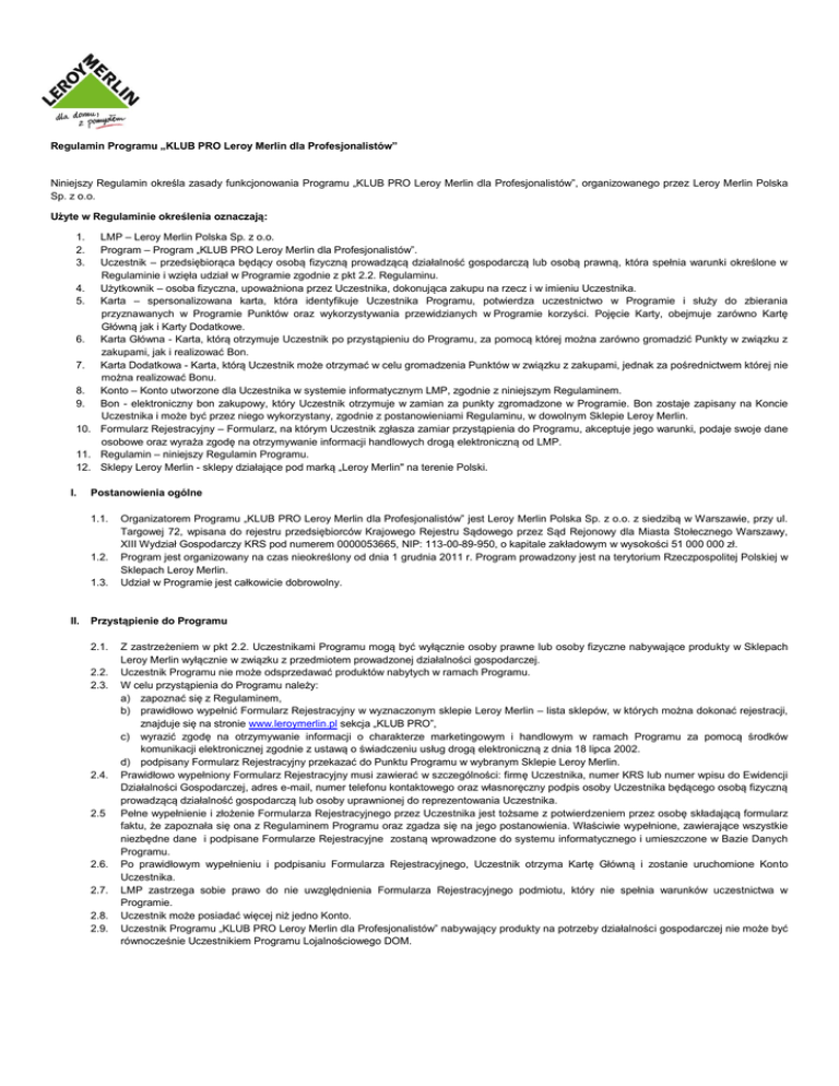 Regulamin Programu „KLUB PRO Leroy Merlin dla Profesjonalistów” Niniejszy Regulamin określa zasady funkcjonowania Programu „KLUB PRO Leroy Merlin dla Profesjonalistów”, organizowanego przez Leroy Merlin Polska Sp. z o.o. Użyte w Regulaminie określenia oznaczają: LMP – Leroy Merlin Polska Sp. z o.o. Program – Program „KLUB PRO Leroy Merlin dla Profesjonalistów”. Uczestnik – przedsiębiorąca będący osobą fizyczną prowadzącą działalność gospodarczą lub osobą prawną, która spełnia warunki określone w Regulaminie i wzięła udział w Programie zgodnie z pkt 2.2. Regulaminu. 4. Użytkownik – osoba fizyczna, upoważniona przez Uczestnika, dokonująca zakupu na rzecz i w imieniu Uczestnika. 5. Karta – spersonalizowana karta, która identyfikuje Uczestnika Programu, potwierdza uczestnictwo w Programie i służy do zbierania przyznawanych w Programie Punktów oraz wykorzystywania przewidzianych w Programie korzyści. Pojęcie Karty, obejmuje zarówno Kartę Główną jak i Karty Dodatkowe. 6. Karta Główna - Karta, którą otrzymuje Uczestnik po przystąpieniu do Programu, za pomocą której można zarówno gromadzić Punkty w związku z zakupami, jak i realizować Bon. 7. Karta Dodatkowa - Karta, którą Uczestnik może otrzymać w celu gromadzenia Punktów w związku z zakupami, jednak za pośrednictwem której nie można realizować Bonu. 8. Konto – Konto utworzone dla Uczestnika w systemie informatycznym LMP, zgodnie z niniejszym Regulaminem. 9. Bon - elektroniczny bon zakupowy, który Uczestnik otrzymuje w zamian za punkty zgromadzone w Programie. Bon zostaje zapisany na Koncie Uczestnika i może być przez niego wykorzystany, zgodnie z postanowieniami Regulaminu, w dowolnym Sklepie Leroy Merlin. 10. Formularz Rejestracyjny – Formularz, na którym Uczestnik zgłasza zamiar przystąpienia do Programu, akceptuje jego warunki, podaje swoje dane osobowe oraz wyraża zgodę na otrzymywanie informacji handlowych drogą elektroniczną od LMP. 11. Regulamin – niniejszy Regulamin Programu. 12. Sklepy Leroy Merlin - sklepy działające pod marką „Leroy Merlin" na terenie Polski. 1. 2. 3. I. Postanowienia ogólne 1.1. 1.2. 1.3. II. Organizatorem Programu „KLUB PRO Leroy Merlin dla Profesjonalistów” jest Leroy Merlin Polska Sp. z o.o. z siedzibą w Warszawie, przy ul. Targowej 72, wpisana do rejestru przedsiębiorców Krajowego Rejestru Sądowego przez Sąd Rejonowy dla Miasta Stołecznego Warszawy, XIII Wydział Gospodarczy KRS pod numerem 0000053665, NIP: 113-00-89-950, o kapitale zakładowym w wysokości 51 000 000 zł. Program jest organizowany na czas nieokreślony od dnia 1 grudnia 2011 r. Program prowadzony jest na terytorium Rzeczpospolitej Polskiej w Sklepach Leroy Merlin. Udział w Programie jest całkowicie dobrowolny. Przystąpienie do Programu 2.1. 2.2. 2.3. 2.4. 2.5 2.6. 2.7. 2.8. 2.9. Z zastrzeżeniem w pkt 2.2. Uczestnikami Programu mogą być wyłącznie osoby prawne lub osoby fizyczne nabywające produkty w Sklepach Leroy Merlin wyłącznie w związku z przedmiotem prowadzonej działalności gospodarczej. Uczestnik Programu nie może odsprzedawać produktów nabytych w ramach Programu. W celu przystąpienia do Programu należy: a) zapoznać się z Regulaminem, b) prawidłowo wypełnić Formularz Rejestracyjny w wyznaczonym sklepie Leroy Merlin – lista sklepów, w których można dokonać rejestracji, znajduje się na stronie www.leroymerlin.pl sekcja „KLUB PRO”, c) wyrazić zgodę na otrzymywanie informacji o charakterze marketingowym i handlowym w ramach Programu za pomocą środków komunikacji elektronicznej zgodnie z ustawą o świadczeniu usług drogą elektroniczną z dnia 18 lipca 2002. d) podpisany Formularz Rejestracyjny przekazać do Punktu Programu w wybranym Sklepie Leroy Merlin. Prawidłowo wypełniony Formularz Rejestracyjny musi zawierać w szczególności: firmę Uczestnika, numer KRS lub numer wpisu do Ewidencji Działalności Gospodarczej, adres e-mail, numer telefonu kontaktowego oraz własnoręczny podpis osoby Uczestnika będącego osobą fizyczną prowadzącą działalność gospodarczą lub osoby uprawnionej do reprezentowania Uczestnika. Pełne wypełnienie i złożenie Formularza Rejestracyjnego przez Uczestnika jest tożsame z potwierdzeniem przez osobę składającą formularz faktu, że zapoznała się ona z Regulaminem Programu oraz zgadza się na jego postanowienia. Właściwie wypełnione, zawierające wszystkie niezbędne dane i podpisane Formularze Rejestracyjne zostaną wprowadzone do systemu informatycznego i umieszczone w Bazie Danych Programu. Po prawidłowym wypełnieniu i podpisaniu Formularza Rejestracyjnego, Uczestnik otrzyma Kartę Główną i zostanie uruchomione Konto Uczestnika. LMP zastrzega sobie prawo do nie uwzględnienia Formularza Rejestracyjnego podmiotu, który nie spełnia warunków uczestnictwa w Programie. Uczestnik może posiadać więcej niż jedno Konto. Uczestnik Programu „KLUB PRO Leroy Merlin dla Profesjonalistów” nabywający produkty na potrzeby działalności gospodarczej nie może być równocześnie Uczestnikiem Programu Lojalnościowego DOM. III. Karty 3.1. 3.2. 3.3. 3.4. 3.5. 3.6. Karta jest identyfikowana przez unikalny kod EAN (unikalny numer 13-cyfrowy), umieszczony na Karcie oraz spersonalizowana nazwą firmy Uczestnika. Każda Karta zarejestrowana jest w systemie informatycznym Organizatora jako Karta przypisana do danego Konta Uczestnika. Karta Programu nie jest kartą kredytową, bankomatową, ani płatniczą. Karta Programu nie jest zbywalna i pozostaje własnością LMP. Do jednego Konta Uczestnika może być przypisanych maksymalnie jedna Karta Główna i 9 Kart Dodatkowych, z których każda jest oznaczona innym numerem EAN. Domniemywa się, że osoba okazująca Kartę jest Uczestnikiem Programu albo osobą upoważnioną przez Uczestnika Programu do posługiwania się daną Kartą (Użytkownik). LMP nie ponosi odpowiedzialności za posłu