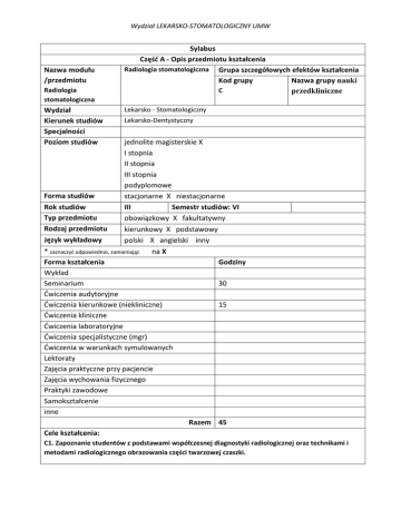Wydział LEKARSKO-STOMATOLOGICZNY UMW Nazwa modułu /przedmiotu Radiologia stomatologiczna Wydział Kierunek studiów Specjalności Poziom studiów Forma studiów Rok studiów Typ przedmiotu Rodzaj przedmiotu Sylabus Część A - Opis przedmiotu kształcenia Radiologia stomatologiczna Grupa szczegółowych efektów kształcenia Kod grupy Nazwa grupy nauki C przedkliniczne Lekarsko - Stomatologiczny Lekarsko-Dentystyczny jednolite magisterskie X I stopnia II stopnia III stopnia podyplomowe stacjonarne X niestacjonarne III Semestr studiów: VI obowiązkowy X fakultatywny kierunkowy X podstawowy Język wykładowy polski X angielski inny * zaznaczyć odpowiednio, zamieniając na X Forma kształcenia Godziny Wykład Seminarium 30 Ćwiczenia audytoryjne Ćwiczenia kierunkowe (niekliniczne) 15 Ćwiczenia kliniczne Ćwiczenia laboratoryjne Ćwiczenia specjalistyczne (mgr) Ćwiczenia w warunkach symulowanych Lektoraty Zajęcia praktyczne przy pacjencie Zajęcia wychowania fizycznego Praktyki zawodowe Samokształcenie inne Razem 45 Cele kształcenia: C1. Zapoznanie studentów z podstawami współczesnej diagnostyki radiologicznej oraz technikami i metodami radiologicznego obrazowania części twarzowej czaszki. Wydział LEKARSKO-STOMATOLOGICZNY UMW C3. Nauka interpretacji obrazów radiologicznych z zakresu chirurgii stomatologicznej. C4. Zapoznanie studentów z wiedzą na temat ochrony radiologicznej i bezpieczeństwa badań radiologicznych. Macierz efektów kształcenia dla modułu/przedmiotu w odniesieniu do metod weryfikacji zamierzonych efektów kształcenia oraz formy realizacji zajęć: Numer efektu kształcenia przedmioto wego Numer efektu kształcenia kierunkowe go W 01 (F.W21.) W 02 B.W9. W 03 (F.W21.) W 04 (F.W21.) W 05 B.W.9 U 01 U 02 U 03 U 04 U 05 K01 K02 Metody weryfikacji osiągnięcia zamierzonych efektów kształcenia Forma zajęć dydaktycznych (formujące i podsumowujące) ** wpisz symbol zna zasady diagnostyki radiologicznej zna zasady ochrony radiologicznej test, odpowiedź ustna SE, CN test, odpowiedź ustna SE, CN zna anatomię radiologiczną z zakresu twarzoczaszki zna schemat opisu zdjęć radiologicznych zna techniki i metody radiologicznego obrazowania części twarzowej czaszki test, odpowiedź ustna SE, CN test, odpowiedź ustna SE, CN test, odpowiedź ustna SE, CN F.(U.14) formułuje problemy test, odpowiedź ustna badawcze związane z jego pracą SE, CN E.U5 F.U15. E.U5 F.U15. E.U5 F.U15. E.U5 F.U15. Interpretuje pantomograficzne zdjęcia test, odpowiedź ustna SE, CN Student, który zaliczy moduł/przedmiot wie/umie/potrafi interpretuje radiologiczne zdjęcia wewnątrzrustne odpowiedź ustna SE, CN interpretuje obrazy CT SE, CN interpretuje zdjęcia zewnątrzustne zgryzowe SE, CN praca w grupie polegająca na wspólnym interpretowaniu obrazów radiologicznych podlegająca bezpośredniej obserwacji asystenta demonstruje umiejętności interpretowanie obrazów interpretacji obrazów radiologicznych podlegająca radiologicznych przed innymi bezpośredniej obserwacji studentami asystenta SE, CN Współpracuje w grupie podczas nauki interpretacji obrazów radiologicznych SE, CN Wydział LEKARSKO-STOMATOLOGICZNY UMW ** WY - wykład; SE - seminarium; CA - ćwiczenia audytoryjne; CN - ćwiczenia kierunkowe (niekliniczne); CK - ćwiczenia kliniczne; CL -ćwiczenia laboratoryjne; CM – ćwiczenia specjalistyczne (mgr); CS - ćwiczenia w warunkach symulowanych; LE - lektoraty; zajęcia praktyczne przy pacjencie - PP; WF - zajęcia wychowania fizycznego (obowiązkowe); PZ- praktyki zawodowe; SK samokształcenie Proszę oznaczyć krzyżykami w skali 1-3 jak powyższe efekty lokują państwa zajęcia w działach: przekaz wiedzy, umiejętności czy kształtowanie postaw np.: Wiedza + + + Umiejętności + + Postawy + Nakład pracy studenta (bilans punktów ECTS): 2 ECTS = 60 h Forma nakładu pracy studenta Obciążenie studenta (h) (udział w zajęciach, aktywność, przygotowanie 60 sprawdzenie, itp.) 1. Godziny kontaktowe 35 2. Czas pracy własnej studenta 25 Sumaryczne obciążenie pracy studenta 60 Punkty ECTS za moduł/przedmiotu 2 Uwagi----------------------------------------. Treść zajęć: (proszę wpisać hasłowo tematykę poszczególnych zajęć z podziałem na formę zajęć dydaktycznych, pamiętając, aby przekładała się ona na zamierzone efekty kształcenia) Wykłady: nie dotyczy Seminaria: 1. Promienie Rtg. Aparatura diagnostyczna . Czynniki wpływające na obraz rentgenowski. Wady zdjęć Rtg. Rodzaje i technika wykonywania zdjęć wewnątrzustnych. Projekcje. Radiografia cyfrowa. Różnice między metodą konwencjonalną a cyfrową. Ochrona radiologiczna. 2. Anatomia radiologiczna. Schemat opisu wewnątrzustnych zdjęć Rtg. Zdjęcia pantomograficzne, anatomia radiologiczna. Rentgenodiagnostyka schorzeń tkanek twardych zęba i przyzębia brzeżnego. Rentgenodiagnostyka endodontyczna. Zmiany zębopochodne w tkankach okołowierzchołkowych i kości wyrostka zębodołowego. 3. Radiologia stomatologiczna wieku rozwojowego. Wady dotyczące zębów. Diagnostyka radiologiczna zębów zatrzymanych i dodatkowych. Diagnostyka radiologiczna pozostałości korzeniowych. Tomografia komputerowa- zasady wykonywania i interpretacja radiologiczna. Technika 3D, Ćwiczenia: opisywanie zdjęć Rtg zgodnie z tematyką seminariów Inne Literatura podstawowa: 1. Łasiński W.: „Anatomia głowy dla stomatologów” PZWL Warszawa 1993. 2. Różyło K. I. Kalinowska „Radiologia stomatologiczna” PZWL 2007 3. Whaites E., red. K. Różyło „Podstawy radiodiagnostyki stomatologicznej” Sanmedica 1994 Wydział LEKARSKO-STOMATOLOGICZNY UMW Literatura uzupełniająca: 1. Sonnabend/Benz, red. Śliwiński T. „Radiologia stomatologiczna”, Urban & Partner 1995 2. .Dominiak M., Zapała J.; Gedrange T. : Podstawy chirurgii stomatologicznej, II wydanie, Elsevier, Wrocław 2013. 3. Kryst L.: Chirurgia szczękowo-twarzowa”, PZWL, Wydanie V, Warszawa 1993. Wymagania dotyczące pomocy 