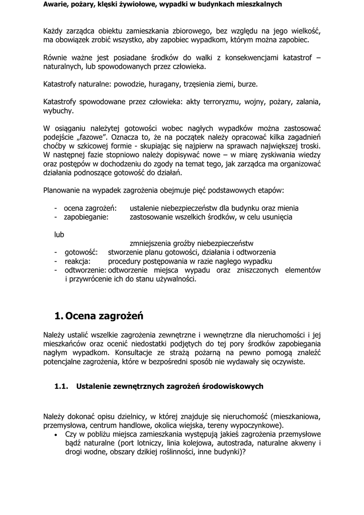 Awarie, pożary, klęski żywiołowe, wypadki w budynkach mieszkalnych Każdy zarządca obiektu zamieszkania zbiorowego, bez względu na jego wielkość, ma obowiązek zrobić wszystko, aby zapobiec wypadkom, którym można zapobiec. Równie ważne jest posiadane środków do walki z konsekwencjami katastrof – naturalnych, lub spowodowanych przez człowieka. Katastrofy naturalne: powodzie, huragany, trzęsienia ziemi, burze. Katastrofy spowodowane przez człowieka: akty terroryzmu, wojny, pożary, zalania, wybuchy. W osiąganiu należytej gotowości wobec nagłych wypadków można zastosować podejście „fazowe”. Oznacza to, że na początek należy opracować kilka zagadnień choćby w szkicowej formie - skupiając się najpierw na sprawach największej troski. W następnej fazie stopniowo należy dopisywać nowe – w miarę zyskiwania wiedzy oraz postępów w dochodzeniu do zgody na temat tego, jak zarządca ma organizować działania podnoszące gotowość do działań. Planowanie na wypadek zagrożenia obejmuje pięć podstawowych etapów: - ocena zagrożeń: - zapobieganie: ustalenie niebezpieczeństw dla budynku oraz mienia zastosowanie wszelkich środków, w celu usunięcia lub - zmniejszenia groźby niebezpieczeństw gotowość: stworzenie planu gotowości, działania i odtworzenia reakcja: procedury postępowania w razie nagłego wypadku odtworzenie: odtworzenie miejsca wypadu oraz zniszczonych elementów i przywrócenie ich do stanu używalności. 1. Ocena zagrożeń Należy ustalić wszelkie zagrożenia zewnętrzne i wewnętrzne dla nieruchomości i jej mieszkańców oraz ocenić niedostatki podjętych do tej pory środków zapobiegania nagłym wypadkom. Konsultacje ze strażą pożarną na pewno pomogą znaleźć potencjalne zagrożenia, które w bezpośredni sposób nie wydawały się oczywiste. 1.1. Ustalenie zewnętrznych zagrożeń środowiskowych Należy dokonać opisu dzielnicy, w której znajduje się nieruchomość (mieszkaniowa, przemysłowa, centrum handlowe, okolica wiejska, tereny wypoczynkowe). Czy w pobliżu miejsca zamieszkania występują jakieś zagrożenia przemysłowe bądź naturalne (port lotniczy, linia kolejowa, autostrada, naturalne akweny i drogi wodne, obszary dzikiej roślinności, inne budynki)? Awarie, pożary, klęski żywiołowe, wypadki w budynkach mieszkalnych Jakie jest bezpośrednie otoczenie i ogrodzenie budynku (mury i bramy, granice naturalne: rzeki, jeziora, brzeg morski; ciemne zaułki, występy, miejsca zapewniające ukrycie). Czy otoczenie daje gwarancję bezpieczeństwa (regularne patrolowanie, skuteczne oświetlenie, zabezpieczenie wejścia)? Czy zanieczyszczenia fabryczne, komunikacyjne i środowiskowe (kurz, gazy) stanowią problem? Jakie jest bezpieczeństwo przeciwpożarowe i przeciwpowodziowe budynku; czy w pobliżu znajdują się źródła potencjalnych zagrożeń naturalnych (lasy, parki, rzeki) bądź też wytworzonych przez człowieka (np. fabryka petrochemiczna)? Czy w ostatnich pięciu latach zdarzył się jakiś większy wypadek bądź katastrofa (groźba zamachu bombowego i sam zamach, zakłócenie porządku publicznego, rozruchy, wojny, katastrofy naturalne: powódź, trzęsienie ziemi, pożar, burza piaskowa; akty wandalizmu)? 1.2. Ustalenie wewnętrznych zagrożeń środowiskowych 1.3. Jakie materiały tworzą konstrukcję budynku? Czy konstrukcja zewnętrzna i struktury wewnętrzne budynku są ognioodporne? Czy istnieją ognioodporne ściany oddzielające części budynku, i ognioodporne drzwi? Czy w jakichś miejscach dozwolone jest palenie? Czy w nieruchomości przechowuje się materiały łatwopalne (np. odczynniki w laboratoriach, paliwa itp.)? Ocena istniejących środków zapobiegawczych Czy budynek posiada system wykrywania dymu, ognia, wody? Czy jest zainstalowany automatyczny system gaszenia ognia? Jakiego rodzaju podręczne środki gaśnicze są dostępne (gaśnice wodne, pianowe, CO2, węże gaśnicze itp.)? Czy przeglądy systemów wykrywania i / albo gaszenia ognia dokonywane są regularnie? Czy budynek jest wyposażony w odgromniki? Czy przy podejmowaniu potencjalnie niebezpiecznych prac, takich jak wymiana okablowania albo renowacja wnętrz bądź na zewnątrz budynku zachowywane są specjalne środki ostrożności? Czy system alarmowy w budynku (jeśli istnieje) ma połączenie ze strażą i policją? Czy nieruchomość posiada sporządzony na piśmie plan gotowości i działania? Oto elementy, które powinien on zawierać: opis procedur alarmowych; zarys działania w nagłych wypadkach; lista materiałów potrzebnych w nagłych wypadkach; priorytety odtworzenia; fachowcy w dziedzinie konserwacji; lista ochotników spośród użytkowników; inne. Czy mieszkańcy, użytkownicy są przeszkoleni w zakresie procedur działania (osoba odpowiedzialna, regularne szkolenia, próbne ewakuacje)? Awarie, pożary, klęski żywiołowe, wypadki w budynkach mieszkalnych 2. Zapobieganie Po dokonaniu oceny zagrożeń należy podjąć wszelkie kroki, niezbędne do zapewnienia bezpieczeństwa dla nieruchomości. Należy przy tym działać w porozumieniu ze służbami alarmowymi (straż pożarna, policja, szpital). 2.1. Przeciwpożarowe systemy alarmowe Wszystkie części budynku powinny być objęte systemem wykrywania ognia i dymu, alarmującym jednocześnie mieszkańców i lokalny oddział straży pożarnej. Urządzenia do wykrywania dymu pozwalają wcześnie odebrać ostrzeżenie o powstającym pożarze, stwarzając możliwość stłumienia go ręcznie. W całym budynku powinny też być rozmieszczone obsługiwane ręcznie aparaty alarmowe, przy pomocy których mieszkańcy mogliby w potrzebie alarmować o pojawieniu się dymu lub ognia. 2.2. Ręczne systemy gaśnicze Jeżeli w budynku nie ma automatycznego systemu gaśniczego, powinny w nim być zainstalowane: węże na szpulach bądź stojakach – tak rozmieszczone, aby każde miejsce w budynku znajdowało się nie dalej niż 6 metrów od końcówki w pełn
