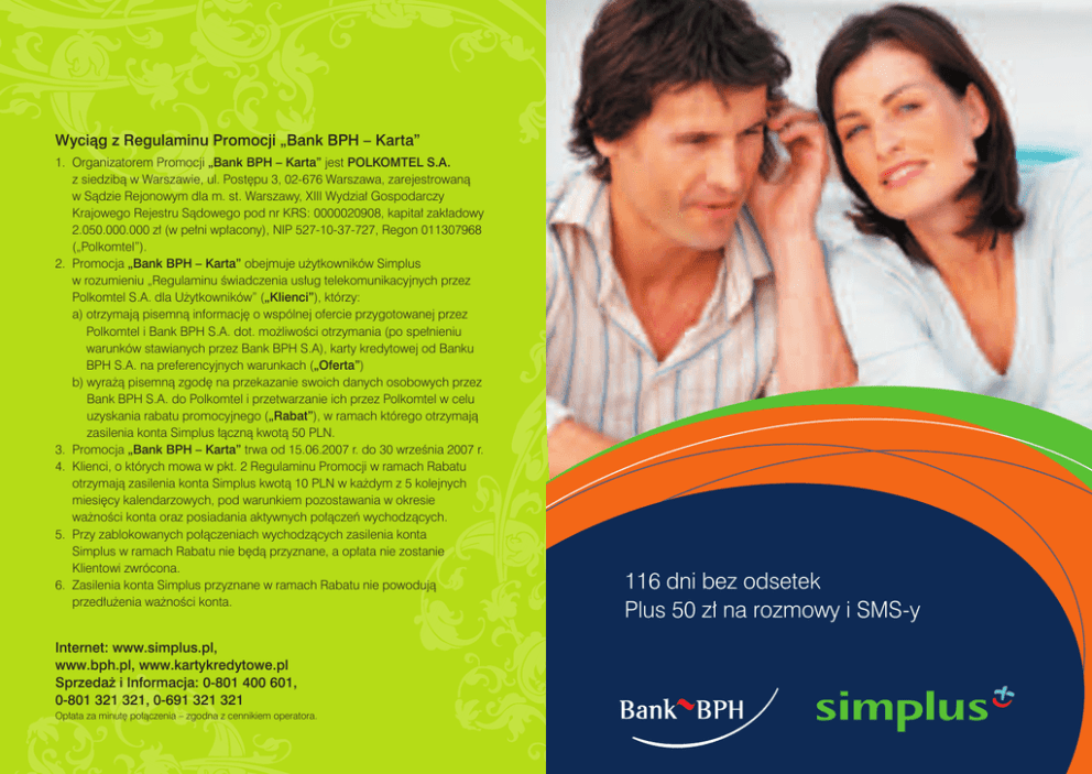 Wyciąg z Regulaminu Promocji „Bank BPH – Karta” 1. Organizatorem Promocji „Bank BPH – Karta” jest POLKOMTEL S.A. z siedzibą w Warszawie, ul. Postępu 3, 02-676 Warszawa, zarejestrowaną w Sądzie Rejonowym dla m. st. Warszawy, XIII Wydział Gospodarczy Krajowego Rejestru Sądowego pod nr KRS: 0000020908, kapitał zakładowy 2.050.000.000 zł (w pełni wpłacony), NIP 527-10-37-727, Regon 011307968 („Polkomtel”). 2. Promocja „Bank BPH – Karta” obejmuje użytkowników Simplus w rozumieniu „Regulaminu świadczenia usług telekomunikacyjnych przez Polkomtel S.A. dla Użytkowników” („Klienci”), którzy: a) otrzymają pisemną informację o wspólnej ofercie przygotowanej przez Polkomtel i Bank BPH S.A. dot. możliwości otrzymania (po spełnieniu warunków stawianych przez Bank BPH S.A), karty kredytowej od Banku BPH S.A. na preferencyjnych warunkach („Oferta”) b) wyrażą pisemną zgodę na przekazanie swoich danych osobowych przez Bank BPH S.A. do Polkomtel i przetwarzanie ich przez Polkomtel w celu uzyskania rabatu promocyjnego („Rabat”), w ramach którego otrzymają zasilenia konta Simplus łączną kwotą 50 PLN. 3. Promocja „Bank BPH – Karta” trwa od 15.06.2007 r. do 30 września 2007 r. 4. Klienci, o których mowa w pkt. 2 Regulaminu Promocji w ramach Rabatu otrzymają zasilenia konta Simplus kwotą 10 PLN w każdym z 5 kolejnych miesięcy kalendarzowych, pod warunkiem pozostawania w okresie ważności konta oraz posiadania aktywnych połączeń wychodzących. 5. Przy zablokowanych połączeniach wychodzących zasilenia konta Simplus w ramach Rabatu nie będą przyznane, a opłata nie zostanie Klientowi zwrócona. 6. Zasilenia konta Simplus przyznane w ramach Rabatu nie powodują przedłużenia ważności konta. Internet: www.simplus.pl, www.bph.pl, www.kartykredytowe.pl Sprzedaż i Informacja: 0-801 400 601, 0-801 321 321, 0-691 321 321 Opłata za minutę połączenia – zgodna z cennikiem operatora. 116 dni bez odsetek Plus 50 zł na rozmowy i SMS-y 116 dni bez odsetek Plus 50 zł zasilenia Gratulujemy! Jesteś jednym z wybranych użytkowników Simplusa, do których kierujemy niezwykle atrakcyjną ofertę. Przygotowaliśmy ją wraz z naszym partnerem – Bankiem BPH. Dzięki karcie Banku BPH możesz już teraz zrobić zakupy i zapłacić za nie dopiero po 116 dniach. Dodatkowo otrzymasz 50 zł na rozmowy i SMS-y. Dlaczego warto mieć kartę kredytową Banku BPH? • wygoda – karty kredytowe Banku BPH zostały uznane przez „Rzeczpospolitą” za najwygodniejsze karty na rynku, • bezpieczeństwo – Bank BPH jako jedyny przejmuje pełną odpowiedzialność za nieuprawnione transakcje, nawet te dokonane przed zastrzeżeniem karty, • oszczędność – płacąc kartą możesz skorzystać z programu „Z kartą taniej”, który daje możliwość otrzymania do 30% rabatu w ponad 1000 punktach handlowo-usługowych, • pełna kontrola – całodobowy dostęp do informacji o karcie przez internet, telefon i usługi SMS. Jako Użytkownik Simplusa tę kartę możesz otrzymać na wyjątkowych warunkach: • kredyt bez odsetek aż do 116 dni (dziś kupujesz, płacisz po blisko 4 miesiącach), • brak opłaty za wydanie karty, • minimum formalności. Dodatkowo, jeśli aktywujesz kartę, otrzymasz zasilenie w kwocie 50 zł na rozmowy i SMS-y do wszystkich sieci krajowych, przez całą dobę (po 10 zł przez 5 kolejnych miesięcy). Zasilenie uruchomimy do 14 dni od momentu otrzymania karty i jej aktywacji, pobierając jednorazową opłatę 10 gr. O doładowaniu poinformujemy Cię SMS-em. Jak skorzystać z oferty? Kilka dni po otrzymaniu tej ulotki zadzwoni do Ciebie nasz konsultant, który odpowie na wszystkie Twoje pytania oraz poinformuje o kolejnych krokach. Jeśli chcesz, już dziś możesz zadzwonić pod numer 0 801 321 321 (koszt jak za połączenie lokalne), z telefonu komórkowego 691 321 321 lub odwiedzić najbliższy Oddział Banku BPH, zabierając ze sobą tę ulotkę. Oferta ważna do 30.09.2007 r. (do 31.10.2007 r. należy aktywować kartę przy użyciu PIN-u).