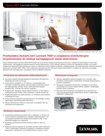 Opcja MFP Lexmark 6500e 1 Opcja MFP Lexmark 6500e zgodna z drukarkami laserowymi T650, T652 i T654. Przekształca drukarki serii Lexmark T650 w urządzenia wielofunkcyjne przystosowane do obsługi wymagających zadań skanowania Opcja wielofunkcyjna Lexmark 6500e MFP zapewnia nowy poziom elastyczności grupom roboczym i działom przetwarzającym duże ilości dokumentów i wymagającym zaawansowanych funkcji skanowania, w tym obsługi nośników formatu A3. Niezależnie od tego, czy musisz zeskanować dużą ilość dokumentów czy masz do wykonania trudne zadania związane z obsługą papieru, ten zaawansowany moduł do drukarek laserowych Lexmark T650, T652 i T654 znakomicie sprawdzi się przy cyfrowym zapisie dokumentów w miejscu ich używania, pozwalając błyskawicznie uporządkować i udostępnić ważne materiały biznesowe. Konstrukcja do zastosowań wielkonakładowych l l l l l l możliwia szybkie, jednoprzebiegowe skanowanie dwustronne z U szybkością 50 stron na minutę. utomatyczny podajnik na 100 arkuszy z ultradźwiękowym A czujnikiem podawania szybko wykrywa błędy podawania (dwóch lub większej liczby arkuszy naraz) i automatycznie wyłącza podajnik ADF, chroniąc tym samym oryginały. odajnik ADF obsługuje szeroki zakres nośników, w tym papier o P niskiej gramaturze, karton, karty kredytowe i nośniki formatu A3. siążki leżą płasko na szybie skanera, co umożliwia wykonywanie K czytelniejszych kopii. l l l l l awiera nagradzany pakiet rozwiązań firmy Lexmark, który Z umożliwia uruchamianie nowatorskich rozwiązań bezpośrednio z poziomu urządzenia. bsługuje rozwiązania wbudowane i działające na serwerze, O rozszerzając tym samym zakres funkcji urządzeń i zwiększając wartość zwrotu inwestycji. olorowy ekran dotykowy o przekątnej 10,2 cala (25,9 cm) K wykorzystuje technologię potwierdzenia dotyku zwiększającą czytelność i dokładność. ampa skanera nagrzewa się błyskawicznie, umożliwiając szybkie L rozpoczęcie skanowania pierwszej strony. brazy dokumentów nierówno ułożonych w podajniku ADF są O automatycznie korygowane. Modularna elastyczność l Wbudowane rozwiązania ozwiązanie sprawdza się doskonale w miejscach, w których nie R można umieścić standardowych urządzeń wielofunkcyjnych, lub w przypadku konieczności umieszczenia skanera niżej, w celu ułatwienia dostępu do urządzenia. odułowa konstrukcja pozwala umieścić skaner z dala od M drukarki. ożna go łatwo podłączyć do drukarek Lexmark T650, T652 and M i T654, rozszerzając możliwości urządzenia o dodatkowe funkcje (kopiowanie, skanowanie oraz obsługa faksów i poczty e-mail). Solidny podajnik ADF Kopiowanie książki Opcja MFP Lexmark 6500e Rozwiązania Lexmark Zmniejsz liczbę niepotrzebnych wydruków i uprość pracę, korzystając z rozwiązań dostępnych w urządzeniu. Dodatkowe rozwiązania można uzyskać u autoryzowanych partnerów i sprzedawców produktów firmy Lexmark lub za pośrednictwem działu Lexmark Professional Services. Formularze i Ulubione Skanowanie do sieci Zmiana języka2 Wyeliminuj niską wydajność i straty związane z drukowaniem gotowych formularzy. Zapisuj często drukowane formularze, materiały marketingowe i inne dokumenty w trybie online. Umożliwi to ich drukowanie na żądanie. Zeskanuj dokument papierowy i prześlij jego obraz do jednego z 30 zdefiniowanych folderów prywatnych lub współdzielonych. Możesz z łatwością przełączać język poleceń wyświetlanych na ekranie dotykowym (do wyboru masz 18 języków). Ochrona informacji Wielowarstwowe zabezpieczenia i wbudowane funkcje pomagają chronić urządzenia, drukowane dokumenty, przesyłane dane i samą sieć. l l l bsługuje szeroki zakres metod uwierzytelniania i mechanizmów O autoryzujących. odatkowy czytnik kart umożliwia uwierzytelnianie użytkowników za D pomocą kart zbliżeniowych lub z paskiem magnetycznym. unkcja zaawansowanego szyfrowania dysków twardych chroni F wrażliwe dane zapisane na dysku skanera. Dane techniczne produktu l l l unkcja czyszczenia dysku usuwa utajone dane automatycznie, F ręcznie lub zgodnie z harmonogramem. bsługa protokołów zabezpieczeń IPSec, SNMPv3 oraz 802.1x. O worzenie dziennika zdarzeń w celu śledzenia i identyfikacji T zagrożeń. Moduł Lexmark 6500e MFP Wyświetlacz Kolorowy ekran dotykowy Lexmark e-Task o przekątnej 10,2 cala (25,9 cm) Typ skanera Jednoprzebiegowy, podajnik ADF z obsługą dokumentów dwustronnych, płaski Źródło światła Matryca LED Typ czujnika obrazu 3 kolorowe czujniki CCD Szybkość skanowania Maks. 50 stron na minutę Rozdzielczość skanowania Maks. 600 x 600 dpi Wyjściowa głębia koloru Kolor: 24-bitowa; odcienie szarości: 8-bitowa (256 poziomów); czerń: 1-bitowa Rozmiar dokumentu: Podajnik ADF Od 50,8 x 76,2 mm (2 x 3 cale) do A3 – 297 x 420 mm (11 x 17 cali) Rozmiar dokumentu: z szyby Maks. A4 (8,5 x 11 cali) Wykrywanie błędów podawania Tak, ultradźwiękowe Pojemność podajnika ADF Maks. 100 arkuszy Procesor 1 GHz Pamięć/dysk twardy W zestawie 512 MB z dyskiem twardym o pojemności większej niż 160 GB, maks. 1,536 GB Standardowe złącza Sieć Ethernet 10/100/1000 BaseTX (RJ-45), port USB 2.0 Hi-Speed (typ B), port USB 2.0 Hi-Speed (typ A) z przodu i z tyłu, 1 wolne gniazdo na inne karty interfejsowei, 2 gniazda kart pamięci (flash, czcionki, firmware) Zgodność z drukarkami Możliwość bezpośredniego podłączenia za pomocą kabla Ethernet do drukarek T650n, T650dn, T650dtn, T652n, T652dn, T652dtn, T654n, T654dn i T654dtn Wymiary (wys. x szer. x dł.), masa 210 x 562 x 595 mm, 17,2 kg Typ faksu Super G3 (V.34, 33,6 kb/s), kompresja JBIG/JPEG, ITU-T.30U Cykl pracy (dziennie) Maks. 5000 zeskanowanych stron dziennie Gwarancja 1 rok, u klienta www.lexmark.pl Przypisy: 1 Ilustracja przedstawia powiększony obraz ekranu dotykowego. 2 Opcja zmiany języka jest dostępna podczas instalacji urządzenia. Lexmark i logo Lexmark z symbolem diamentu są