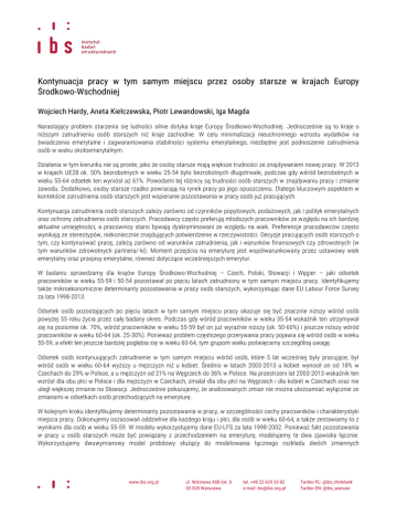 Kontynuacja pracy w tym samym miejscu przez osoby starsze w krajach Europy Środkowo-Wschodniej Wojciech Hardy, Aneta Kiełczewska, Piotr Lewandowski, Iga Magda Narastający problem starzenia się ludności silnie dotyka kraje Europy Środkowo-Wschodniej. Jednocześnie są to kraje o niższym zatrudnieniu osób starszych niż kraje zachodnie. W celu minimalizacji nieuchronnego wzrostu wydatków na świadczenia emerytalne i zagwarantowania stabilności systemu emerytalnego, niezbędne jest podnoszenie zatrudnienia osób w wieku okołoemerytalnym. Działania w tym kierunku nie są proste, jako że osoby starsze mają większe trudności ze znajdywaniem nowej pracy. W 2013 w krajach UE28 ok. 50% bezrobotnych w wieku 25-54 było bezrobotnych długotrwale, podczas gdy wśród bezrobotnych w wieku 55-64 odsetek ten wyniósł aż 61%. Powodami tej różnicy są trudności osób starszych w znajdywaniu pracy i zmianie zawodu. Dodatkowo, osoby starsze rzadko powracają na rynek pracy po jego opuszczeniu. Dlatego kluczowym aspektem w kontekście zatrudnienia osób starszych jest wspieranie pozostawania w pracy osób już pracujących. Kontynuacja zatrudnienia osób starszych zależy zarówno od czynników popytowych, podażowych, jak i polityk emerytalnych oraz ochrony zatrudnienia osób starszych. Pracodawcy często preferują młodszych pracowników ze względu na ich bardziej aktualne umiejętności, a pracownicy starsi bywają dyskryminowani ze względu na wiek. Preferencje pracodawców często wynikają ze stereotypów, niekoniecznie znajdujących potwierdzenie w rzeczywistości. Decyzje pracujących osób starszych o tym, czy kontynuować pracę, zależą zarówno od warunków zatrudnienia, jak i warunków finansowych czy zdrowotnych (w tym warunków zdrowotnych partnera/-ki). Moment przejścia na emeryturę jest współwarunkowany przez ustawowy wiek emerytalny oraz przepisy emerytalne, również dotyczące wcześniejszych emerytur. W badaniu sprawdzamy dla krajów Europy Środkowo-Wschodniej – Czech, Polski, Słowacji i Węgier – jaki odsetek pracowników w wieku 55-59 i 50-54 pozostawał po pięciu latach zatrudniony w tym samym miejscu pracy. Identyfikujemy także mikroekonomiczne determinanty pozostawania w pracy osób starszych, wykorzystując dane EU Labour Force Survey za lata 1998-2013. Odsetek osób pozostających po pięciu latach w tym samym miejscu pracy okazuje się być znacznie niższy wśród osób powyżej 55 roku życia przez cały badany okres. Podczas gdy wśród pracowników w wieku 35-54 wskaźnik ten utrzymywał się na poziomie ok. 70%, wśród pracowników w wieku 55-59 był on już wyraźnie niższy (ok. 50-60%) i jeszcze niższy wśród pracowników w wieku 60-64 (ok. 25-30%). Ponieważ problem częstszego przerywania pracy pojawia się wśród osób w wieku 55-59, a efekt ten jeszcze bardziej pogłębia się w wieku 60-64, tym grupom wieku poświęcamy szczególną uwagę. Odsetek osób kontynuujących zatrudnienie w tym samym miejscu wśród osób, które 5 lat wcześniej były pracujące, był wśród osób w wieku 60-64 wyższy u mężczyzn niż u kobiet. Średnio w latach 2003-2013 u kobiet wynosił on od 18% w Czechach do 29% w Polsce, a u mężczyzn od 21% na Węgrzech do 36% w Polsce. Na przestrzeni lat 2003-2013 wskaźnik ten wzrósł dla obu płci w Polsce i dla mężczyzn w Czechach, zmalał dla obu płci na Węgrzech i dla kobiet w Czechach oraz nie uległ większej zmianie na Słowacji. Jednocześnie pokazujemy, że analizowanych zmian nie można utożsamiać wyłącznie ze zmianami w odsetkach osób przechodzących na emeryturę. W kolejnym kroku identyfikujemy determinanty pozostawania w pracy, w szczególności cechy pracowników i charakterystyki miejsca pracy. Dokonujemy oszacowań oddzielnie dla każdego kraju i płci, dla osób w wieku 60-64, a także zestawiamy to z wynikami dla osób w wieku 55-59. W modelu wykorzystujemy dane EU-LFS za lata 1998-2002. Ponieważ fakt pozostawania w pracy u osób starszych może być powiązany z przechodzeniem na emeryturę, modelujemy te dwa zjawiska łącznie. Wykorzystujemy dwuwymiarowy model probitowy służący do modelowania łącznego rozkładu dwóch zmiennych www.ibs.org.pl ul. Wiśniowa 40B lok. 8 02-520 Warszawa tel. +48 22 629 33 82 e-mail: [email protected] Twitter PL: @ibs_thinktank Twitter EN: @ibs_warsaw zero-jedynkowych. Prawdopodobieństwa pozostawania w pracy oszacowane przez model wykazują zbliżone wzorce do obserwowanych wskaźników, gdzie średnia korelacja tych dwóch wynosi 80% wśród kobiet w wieku 60-64 i 88% wśród mężczyzn. Wyniki wskazują, że najrzadziej pracę kontynuowali pracownicy o niższym wykształceniu, pracujący w rolnictwie lub przemyśle, w zawodach wymagających niższych kwalifikacji oraz żyjący z niepracującym/-ą partnerem/-ką. Jednocześnie najczęściej w pracy pozostawali pracownicy o wykształceniu wyższym, pracujący w zawodach wymagających wysokich kwalifikacji, w sektorze edukacji i opieki zdrowotnej oraz żyjący z pracującym/-ą partnerem/-ką. Zmiany w odsetkach osób pozostających w pracy pomiędzy latami 2003-2005 a 2011-2013 wynikają w większym stopniu ze zmian w oszacowaniach przy zadanych charakterystykach niż ze zmian w charakterystykach pracowników i miejsc pracy. Znaczna część zmian w odsetkach wynikała jednak ze zmian ogólnych warunków, dotyczących wszystkich pracowników niezależnie od ich charakterystyk lub charakterystyk ich pracy. Kraje, w których ta ogólna zmiana miała najbardziej pozytywny wpływ, to jednocześnie kraje, w których w badanym okresie podnoszono ustawowy wiek emerytalny bądź ograniczono dostępność wcześniejszych emerytur. Przyszłe polityki kierowane do osób starszych powinny kłaść nacisk na wsparcie zatrudnienia kobiet oraz pracowników z niższym wykształceniem i o niskich kwalifikacjach. Pomoc w zapewnieniu opieki na dziećmi, osobami chorymi i starszymi sprawi, że osoby star