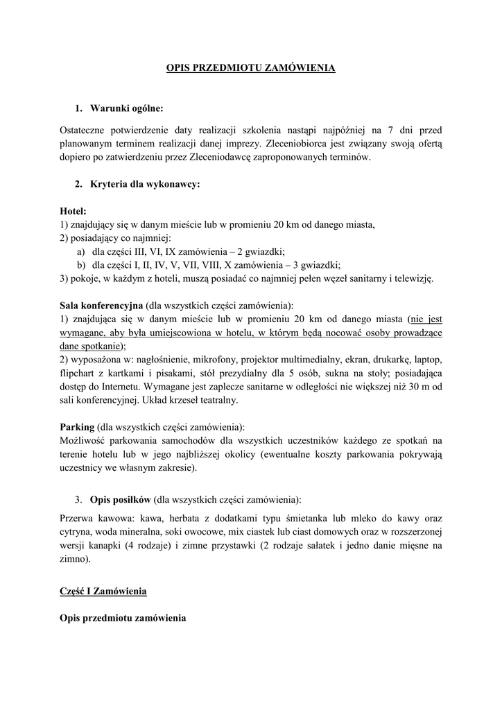 OPIS PRZEDMIOTU ZAMÓWIENIA 1. Warunki ogólne: Ostateczne potwierdzenie daty realizacji szkolenia nastąpi najpóźniej na 7 dni przed planowanym terminem realizacji danej imprezy. Zleceniobiorca jest związany swoją ofertą dopiero po zatwierdzeniu przez Zleceniodawcę zaproponowanych terminów. 2. Kryteria dla wykonawcy: Hotel: 1) znajdujący się w danym mieście lub w promieniu 20 km od danego miasta, 2) posiadający co najmniej: a) dla części III, VI, IX zamówienia – 2 gwiazdki; b) dla części I, II, IV, V, VII, VIII, X zamówienia – 3 gwiazdki; 3) pokoje, w kaŜdym z hoteli, muszą posiadać co najmniej pełen węzeł sanitarny i telewizję. Sala konferencyjna (dla wszystkich części zamówienia): 1) znajdująca się w danym mieście lub w promieniu 20 km od danego miasta (nie jest wymagane, aby była umiejscowiona w hotelu, w którym będą nocować osoby prowadzące dane spotkanie); 2) wyposaŜona w: nagłośnienie, mikrofony, projektor multimedialny, ekran, drukarkę, laptop, flipchart z kartkami i pisakami, stół prezydialny dla 5 osób, sukna na stoły; posiadająca dostęp do Internetu. Wymagane jest zaplecze sanitarne w odległości nie większej niŜ 30 m od sali konferencyjnej. Układ krzeseł teatralny. Parking (dla wszystkich części zamówienia): MoŜliwość parkowania samochodów dla wszystkich uczestników kaŜdego ze spotkań na terenie hotelu lub w jego najbliŜszej okolicy (ewentualne koszty parkowania pokrywają uczestnicy we własnym zakresie). 3. Opis posiłków (dla wszystkich części zamówienia): Przerwa kawowa: kawa, herbata z dodatkami typu śmietanka lub mleko do kawy oraz cytryna, woda mineralna, soki owocowe, mix ciastek lub ciast domowych oraz w rozszerzonej wersji kanapki (4 rodzaje) i zimne przystawki (2 rodzaje sałatek i jedno danie mięsne na zimno). Część I Zamówienia Opis przedmiotu zamówienia Przedmiotem zamówienia jest świadczenie usługi hotelarskiej, gastronomicznej oraz wynajmu sali z wyposaŜeniem w ciągu 1 dnia w lipcu 2010 r. w Olsztynie w Polsce, dla potencjalnych beneficjentów Programu Współpracy Transgranicznej Litwa - Polska- Rosja 2007 – 2013. Szczegółowy opis przedmiotu zamówienia: 1. Wynajem pokoju do pojedynczego wykorzystania ze śniadaniem dla max. 8 osób na jedną dobę 07-08 lipca 2010. 2. Wynajem sali konferencyjnej wraz z obsługą techniczną w dniu 8 lipca (w godz. 09.00-19.00 , ustawienie sali godz. 8.00) dla max. 150 osób. 3. Zapewnienie usług gastronomicznych uczestnikom konferencji, tj. 8 lipca dla max. 150 osób: całodzienna zwykła przerwa kawowa oraz 1 przerwa kawowa rozszerzona o kanapki i zimne przystawki. Część II Zamówienia Opis przedmiotu zamówienia Przedmiotem zamówienia jest świadczenie usługi hotelarskiej, gastronomicznej oraz wynajmu sali z wyposaŜeniem w ciągu 1 dnia w lipcu 2010 r. na Litwie w mieście Marijampole, dla potencjalnych beneficjentów Programu Współpracy Transgranicznej Litwa Polska- Rosja 2007 – 2013. Szczegółowy opis przedmiotu zamówienia: 1. Wynajem pokoju do pojedynczego wykorzystania ze śniadaniem dla max. 5 osób na dwie doby 19/20 lipca 2010. 2. Wynajem sali konferencyjnej wraz z obsługą techniczną w dniu 20 lipca (w godz. 09.00-19.00 , ustawienie sali godz. 8.00) dla max. 60 osób. 3. Zapewnienie uczestnikom usług gastronomicznych tj. 20 lipca dla max. 60 osób: całodzienna zwykła przerwa kawowa oraz 1 rozszerzona przerwa kawowa o kanapki i zimne przystawki. Część III Zamówienia Opis przedmiotu zamówienia Przedmiotem zamówienia jest świadczenie usługi hotelarskiej, gastronomicznej oraz wynajmu sali z wyposaŜeniem w ciągu 1 dnia w lipcu 2010 r. na Litwie w mieście Taurage, dla potencjalnych beneficjentów Programu Współpracy Transgranicznej Litwa - PolskaRosja 2007 – 2013. Szczegółowy opis przedmiotu zamówienia: 1. Wynajem pokoju do pojedynczego wykorzystania ze śniadaniem dla max. 4 osób na dwie doby 20/21 lipca 2010. 2. Wynajem sali konferencyjnej wraz z obsługą techniczną w dniu 21 lipca (w godz. 09.00-19.00 , ustawienie sali godz. 8.00) dla max. 60 osób. 3. Zapewnienie usług gastronomicznych uczestnikom tj. 21 lipca dla max. 60 osób: całodzienna zwykła przerwa kawowa oraz 1 rozszerzona przerwa kawowa o kanapki i zimne przystawki. Część IV Zamówienia Opis przedmiotu zamówienia Przedmiotem zamówienia jest świadczenie usługi hotelarskiej, gastronomicznej oraz wynajmu sali z wyposaŜeniem w ciągu 1 dnia w lipcu 2010 r. na Litwie w mieście Klaipeda, dla potencjalnych beneficjentów Programu Współpracy Transgranicznej Litwa - PolskaRosja 2007 – 2013. Szczegółowy opis przedmiotu zamówienia: 1. Wynajem pokoju do pojedynczego wykorzystania ze śniadaniem dla max. 4 osób na trzy doby 21/23 lipca 2010. 2. Wynajem sali konferencyjnej wraz z obsługą techniczną w dniu 22 lipca (w godz. 09.00-19.00 , ustawienie sali godz. 8.00) dla max. 60 osób. 3. Zapewnienie uczestnikom usług gastronomicznych tj. 22 lipca dla max. 60 osób: całodzienna zwykła przerwa kawowa oraz 1 rozszerzona przerwa kawowa o kanapki i zimne przystawki. Część V Zamówienia Opis przedmiotu zamówienia Przedmiotem zamówienia jest świadczenie usługi hotelarskiej, gastronomicznej oraz wynajmu sali z wyposaŜeniem w ciągu 1 dnia w lipcu 2010 r. w Rosji w mieście Kaliningrad, dla potencjalnych beneficjentów Programu Współpracy Transgranicznej Litwa - PolskaRosja 2007 – 2013. Szczegółowy opis przedmiotu zamówienia: 1. Wynajem pokoju do pojedynczego wykorzystania ze śniadaniem dla max. 4 osób na dwie doby 27/28 lipca 2010. 2. Wynajem sali konferencyjnej wraz z obsługą techniczną w dniu 28 lipca (w godz. 09.00-19.00 , ustawienie sali godz. 8.00) dla max. 150 osób. 3. Zapewnienie uczestnikom usług gastronomicznych tj. 28 lipca dla max. 150 osób: całodzienna zwykła przerwa kawowa oraz 1 rozszerzona przerwa kawowa o kanapki i zimne przystawki. Część VI Zamówienia Opis przedmiotu zamówienia Przedmiot