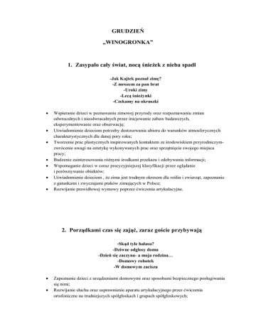 GRUDZIEŃ „WINOGRONKA” 1. Zasypało cały świat, nocą śnieżek z nieba spadł -Jak Kajtek poznał zimę? -Z mrozem za pan brat -Uroki zimy -Lecą śnieżynki -Czekamy na okruszki Wspieranie dzieci w poznawaniu zimowej przyrody oraz rozpoznawaniu zmian odwracalnych i nieodwracalnych przez inicjowanie zabaw badawczych, eksperymentowanie oraz obserwację; Uświadomienie dzieciom potrzeby dostosowania ubioru do warunków atmosferycznych charakterystycznych dla danej pory roku; Tworzenie prac plastycznych inspirowanych kontaktem ze środowiskiem przyrodniczymzwrócenie uwagi na estetykę wykonywanych prac oraz sprzątnięcie swojego miejsca pracy; Budzenie zainteresowania różnymi środkami przekazu i zdobywania informacji; Wspomaganie dzieci w coraz precyzyjniejszej klasyfikacji przez oglądanie i porównywanie obiektów; Uświadomienie dzieciom , że zima jest trudnym okresem dla roślin i zwierząt, zapoznanie z gatunkami i zwyczajami ptaków zimujących w Polsce; Rozwijanie prawidłowej wymowy poprzez ćwiczenia artykulacyjne. 2. Porządkami czas się zająć, zaraz goście przybywają -Skąd tyle hałasu? -Dziwne odgłosy domu -Dzień się zaczyna- a moja rodzina… -Domowy robotek -W domowym zaciszu Zapoznanie dzieci z urządzeniami domowymi oraz sposobami bezpiecznego posługiwania się nimi; Rozwijanie słuchu oraz usprawnienie aparatu artykulacyjnego przez ćwiczenia ortofoniczne na trudniejszych spółgłoskach i grupach spółgłoskowych; Uświadomienie dzieciom potrzeby współuczestnictwa w życiu rodziny- kształtowanie właściwych postaw i zachowań moralnych wobec innych; Zachęcanie dzieci do odgrywania scenek dramowych; Rozwijanie poczucia odpowiedzialności oraz wdrażanie dzieci do rozumienia sensu sprzątania przez wspólne wykonywanie określonych prac; Usprawnienie precyzji w zakresie motoryki małej przez zajęcia plastyczne i konstrukcyjne; Kształtowanie świadomości własnego „ja” oraz orientacji przestrzennej. 3. W całym domu pachnie lasem, bo już święta są za pasem -W oczekiwaniu na święta -Kto widział Mikołaja? -Prezent ci dam -Bombek ile? Tyle! -Święta tuż tuż… Zapoznanie dzieci ze świąteczną tradycją w Polsce i na świecie; Formułowaniu wypowiedzi poprawnych pod względem gramatycznym, logicznym i składniowym; Wspieranie dzieci we wzbogacaniu słownictwa; Rozwijanie wyobraźni i koordynacji wzrokowo- ruchowej przez wykonywanie papierowych składek; Zachęcanie do radosnego muzykowania i śpiewania piosenek z uwzględnieniem rytmu, tempa muzycznego, wysokości dźwięku; Budzenie poczucia estetyki podczas tworzenia sztuki użytkowej Rozwijanie pamięci przez uczenie się tekstów na pamięć. WIERSZE I PIOSENKI „Mikołaj pędzi” 1. Już na płatkach śniegu przyfrunęły święta Teraz wszystkie dzieci marzą tylko o prezentach Sanie Mikołaja dzwonią dzwoneczkami Święty Mikołaju, bądź już wreszcie tutaj z nami Ref.: A Mikołaj pędzi, a Mikołaj gna Od domu do domu ciężką pracę ma Jego piękną brodę pokrył srebrny lód Gdyby tak biedaczek już odpocząć mógł. 2. Święty Mikołaju my ci pomożemy I wszystkie prezenty szybko dzieciom rozniesiemy Potem pod choinką siądziesz razem z nami Też swój prezent znajdziesz w pięknym koszu z paczuszkami „List do Mikołaja” Chciałem wam przeczytać list do Mikołaja Ten, który wysłałem już w połowie maja. Żeby doszedł na czas. Z czego się śmiejecie? Adresu szukałem długo w Internecie. „Drogi Mikołaju! Ja mieszkam w Warszawie I pisze do Ciebie w bardzo ważnej sprawie! Byłem bardzo grzeczny dzisiaj po południu… Mógłbyś mnie odwiedzić? Może wpadniesz w grudniu?