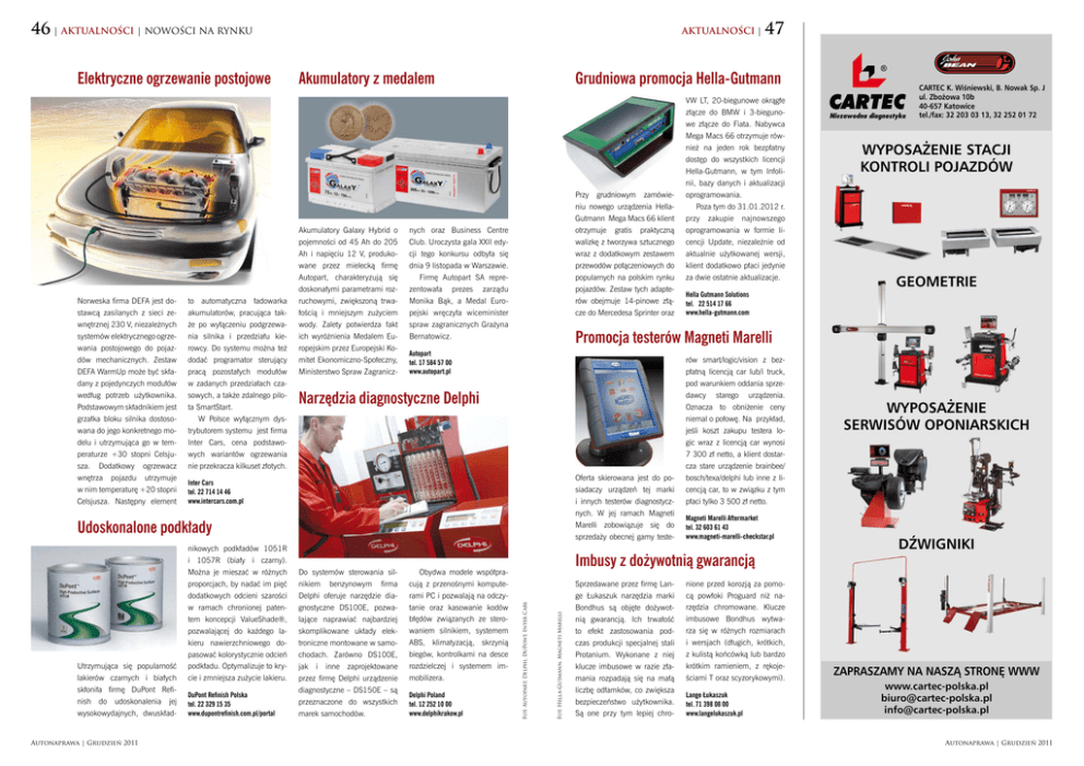 46 | AKTUALNOŚCI | NOWOŚCI NA RYNKU Elektryczne ogrzewanie postojowe AKTUALNOŚCI | Akumulatory z medalem 47 Grudniowa promocja Hella-Gutmann VW LT, 20-biegunowe okrągłe złącze do BMW i 3-bieguno we złącze do Fiata. Nabywca Mega Macs 66 otrzymuje rów nież na jeden rok bezpłatny dostęp do wszystkich licencji Hella-Gutmann, w tym Infoli CARTEC K. Wiśniewski, B. Nowak Sp. J ul. Zbożowa 10b 40-657 Katowice tel./fax: 32 203 03 13, 32 252 01 72 WYPOSAŻENIE STACJI KONTROLI POJAZDÓW nii, bazy danych i aktualizacji Przy grudniowym zamówie niu nowego urządzenia Hella- oprogramowania. Poza tym do 31.01.2012 r. Gutmann Mega Macs 66 klient przy zakupie najnowszego Akumulatory Galaxy Hybrid o nych oraz Business Centre otrzymuje praktyczną oprogramowania w formie li pojemności od 45 Ah do 205 Club. Uroczysta gala XXII edy- walizkę z tworzywa sztucznego cencji Update, niezależnie od Ah i napięciu 12 V, produko cji tego konkursu odbyła się wraz z dodatkowym zestawem aktualnie użytkowanej wersji, wane przez mielecką firmę dnia 9 listopada w Warszawie. przewodów połączeniowych do klient dodatkowo płaci jedynie Autopart, charakteryzują się Firmę Autopart SA repre popularnych na polskim rynku za dwie ostatnie aktualizacje. doskonałymi parametrami roz zentowała prezes zarządu gratis pojazdów. Zestaw tych adapte Norweska firma DEFA jest do to automatyczna ładowarka ruchowymi, zwiększoną trwa Monika Bąk, a Medal Euro rów obejmuje 14-pinowe złą stawcą zasilanych z sieci ze akumulatorów, pracująca tak łością i mniejszym zużyciem pejski wręczyła wiceminister cze do Mercedesa Sprinter oraz wnętrznej 230 V, niezależnych że po wyłączeniu podgrzewa wody. Zalety potwierdza fakt spraw zagranicznych Grażyna systemów elektrycznego ogrze nia silnika i przedziału kie ich wyróżnienia Medalem Eu Bernatowicz. wania postojowego do pojaz- rowcy. Do systemu można też ropejskim przez Europejski Ko dów mechanicznych. Zestaw dodać programator sterujący mitet Ekonomiczno-Społeczny, DEFA WarmUp może być skła pracą pozostałych modułów Ministerstwo Spraw Zagranicz- dany z pojedynczych modułów w zadanych przedziałach cza według potrzeb użytkownika. sowych, a także zdalnego pilo Podstawowym składnikiem jest ta SmartStart. Hella Gutmann Solutions tel. 22 514 17 66 www.hella-gutmann.com Promocja testerów Magneti Marelli Autopart tel. 17 584 57 00 www.autopart.pl rów smart/logic/vision z bez płatną licencją car lub/i truck, pod warunkiem oddania sprze Narzędzia diagnostyczne Delphi dawcy starego urządzenia. Oznacza to obniżenie ceny grzałka bloku silnika dostoso W Polsce wyłącznym dys niemal o połowę. Na przykład, wana do jego konkretnego mo- trybutorem systemu jest firma jeśli koszt zakupu testera lo delu i utrzymująca go w tem Inter Cars, cena podstawo gic wraz z licencją car wynosi peraturze +30 stopni Celsju wych wariantów ogrzewania 7 300 zł netto, a klient dostar sza. nie przekracza kilkuset złotych. cza stare urządzenie brainbee/ Dodatkowy wnętrza pojazdu ogrzewacz utrzymuje w nim temperaturę +20 stopni Celsjusza. Następny element Inter Cars tel. 22 714 14 46 www.intercars.com.pl Oferta skierowana jest do po bosch/texa/delphi lub inne z li siadaczy urządzeń tej marki cencją car, to w związku z tym i innych testerów diagnostycz płaci tylko 3 500 zł netto. nych. W jej ramach Magneti Udoskonalone podkłady Marelli zobowiązuje się do sprzedaży obecnej gamy teste nikowych podkładów 1051R Magneti Marelli Aftermarket tel. 32 603 61 43 www.magneti-marelli-checkstar.pl Imbusy z dożywotnią gwarancją i 1057R (biały i czarny). Obydwa modele współpra proporcjach, by nadać im pięć nikiem firma cują z przenośnymi kompute Sprzedawane przez firmę Lan nione przed korozją za pomo dodatkowych odcieni szarości Delphi oferuje narzędzie dia rami PC i pozwalają na odczy ge Łukaszuk narzędzia marki cą powłoki Proguard niż na w ramach chronionej paten gnostyczne DS100E, pozwa tanie oraz kasowanie kodów Bondhus są objęte dożywot rzędzia chromowane. Klucze tem koncepcji ValueShade®, lające naprawiać najbardziej błędów związanych ze stero nią gwarancją. Ich trwałość imbusowe Bondhus wytwa pozwalającej do każdego la skomplikowane układy elek waniem silnikiem, systemem to efekt zastosowania pod rza się w różnych rozmiarach kieru nawierzchniowego do troniczne montowane w samo ABS, klimatyzacją, skrzynią czas produkcji specjalnej stali i wersjach (długich, krótkich, pasować kolorystycznie odcień chodach. Zarówno DS100E, biegów, kontrolkami na desce Protanium. Wykonane z niej z kulistą końcówką lub bardzo Utrzymująca się popularność podkładu. Optymalizuje to kry jak rozdzielczej i systemem im klucze imbusowe w razie zła krótkim ramieniem, z rękoje lakierów czarnych i białych cie i zmniejsza zużycie lakieru. przez firmę Delphi urządzenie mania rozpadają się na małą ściami T oraz scyzorykowymi). skłoniła firmę DuPont Refi nish do udoskonalenia jej wysokowydajnych, dwuskład Autonaprawa | Grudzień 2011 DuPont Refinish Polska tel. 22 329 15 35 www.dupontrefinish.com.pl/portal i inne zaprojektowane diagnostyczne – DS150E – są przeznaczone do wszystkich marek samochodów. mobilizera. Delphi Poland tel. 12 252 10 00 www.delphikrakow.pl Fot. Hella-Gutmann, Magneti Marelli Do systemów sterowania sil Fot. Autopart, Delphi, DuPont, Inter Cars Można je mieszać w różnych benzynowym GEOMETRIE liczbę odłamków, co zwiększa bezpieczeństwo użytkownika. Są one przy tym lepiej chro Lange Łukaszuk tel. 71 398 08 00 www.langelukaszuk.pl WYPOSAŻENIE SERWISÓW OPONIARSKICH DŹWIGNIKI ZAPRASZAMY NA NASZĄ STRONĘ WWW www.cartec-polska.pl [email protected] [email protected] Autonaprawa | Grudzień 2011