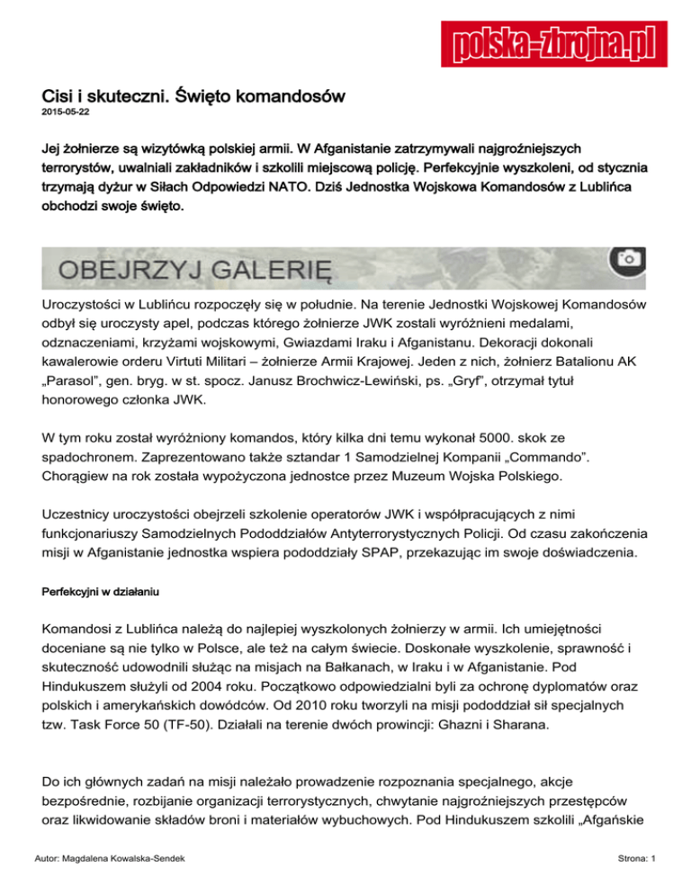 Cisi i skuteczni. Święto komandosów 2015-05-22 Jej żołnierze są wizytówką polskiej armii. W Afganistanie zatrzymywali najgroźniejszych terrorystów, uwalniali zakładników i szkolili miejscową policję. Perfekcyjnie wyszkoleni, od stycznia trzymają dyżur w Siłach Odpowiedzi NATO. Dziś Jednostka Wojskowa Komandosów z Lublińca obchodzi swoje święto. Uroczystości w Lublińcu rozpoczęły się w południe. Na terenie Jednostki Wojskowej Komandosów odbył się uroczysty apel, podczas którego żołnierze JWK zostali wyróżnieni medalami, odznaczeniami, krzyżami wojskowymi, Gwiazdami Iraku i Afganistanu. Dekoracji dokonali kawalerowie orderu Virtuti Militari – żołnierze Armii Krajowej. Jeden z nich, żołnierz Batalionu AK „Parasol”, gen. bryg. w st. spocz. Janusz Brochwicz-Lewiński, ps. „Gryf”, otrzymał tytuł honorowego członka JWK. W tym roku został wyróżniony komandos, który kilka dni temu wykonał 5000. skok ze spadochronem. Zaprezentowano także sztandar 1 Samodzielnej Kompanii „Commando”. Chorągiew na rok została wypożyczona jednostce przez Muzeum Wojska Polskiego. Uczestnicy uroczystości obejrzeli szkolenie operatorów JWK i współpracujących z nimi funkcjonariuszy Samodzielnych Pododdziałów Antyterrorystycznych Policji. Od czasu zakończenia misji w Afganistanie jednostka wspiera pododdziały SPAP, przekazując im swoje doświadczenia. Perfekcyjni w działaniu Komandosi z Lublińca należą do najlepiej wyszkolonych żołnierzy w armii. Ich umiejętności doceniane są nie tylko w Polsce, ale też na całym świecie. Doskonałe wyszkolenie, sprawność i skuteczność udowodnili służąc na misjach na Bałkanach, w Iraku i w Afganistanie. Pod Hindukuszem służyli od 2004 roku. Początkowo odpowiedzialni byli za ochronę dyplomatów oraz polskich i amerykańskich dowódców. Od 2010 roku tworzyli na misji pododdział sił specjalnych tzw. Task Force 50 (TF-50). Działali na terenie dwóch prowincji: Ghazni i Sharana. Do ich głównych zadań na misji należało prowadzenie rozpoznania specjalnego, akcje bezpośrednie, rozbijanie organizacji terrorystycznych, chwytanie najgroźniejszych przestępców oraz likwidowanie składów broni i materiałów wybuchowych. Pod Hindukuszem szkolili „Afgańskie Autor: Magdalena Kowalska-Sendek Strona: 1 Tygrysy”, czyli oddziały antyterrorystyczne policji PRC (Provincial Response Company). Operacje, które przeprowadzali operatorzy JWK w Afganistanie, dziś są uznawane za modelowe działania sił specjalnych. Przykłady ich skuteczności w Afganistanie można mnożyć. Do najbardziej znanych operacji zalicza się: odbicie zakładników przetrzymywanych w budynkach administracji rządowej w Sharanie oraz zatrzymanie m.in. przywódcy talibów mułły Dawooda, który znajdował się na szczycie listy najbardziej poszukiwanych przywódców afgańskich rebeliantów tzw. JPEL (Joint Priority Effects List). Żołnierze JWK byli wielokrotnie wyróżniani za swoją służbę. Dla przykładu: w marcu 2011 roku generał David Petraeus, dowódca ISAF w Afganistanie, w imieniu prezydenta USA Baracka Obamy wręczył „Białemu” (dowódca TF-50) Meritorious Service Medal. Dowódca ISAF uznał, że działalność komandosów przyczyniła się do sukcesu całej operacji ISAF. „Biały” jest pierwszym Polakiem i drugim nieamerykańskim żołnierzem na świecie, który otrzymał takie wyróżnienie za działalność bojową. Nowe wyzwania – Ostatni rok poświęciliśmy na przegląd i zweryfikowanie naszych zdolności w zakresie bezpośredniej obrony państwa, a także na wdrożenie zdobytych w Afganistanie doświadczeń – mówi płk Wiesław Kukuła, dowódca JWK. – Dokonaliśmy kilku zmian strukturalnych oraz rozpoczęliśmy starania o zakup nowego wyposażenia. Nadal szkolimy także siły specjalne wybranych państw NATO – dodaje dowódca. W JWK służy obecnie kilkuset żołnierzy. Większość z nich tworzy trzy zespoły bojowe. Na początku 2015 roku jednostka powiększyła skład: w etacie JWK znajduje się teraz Ośrodek Szkolenia Wojsk Specjalnych. W przyszłym roku w Lublińcu w zespołach bojowych służbę rozpoczną psy służbowe. Czworonogi (psy ofensywne, wykrywające materiały wybuchowe oraz rozpoznawcze) będą uczestniczyć w większości szkoleń operatorów. Od pięciu miesięcy jeden zespół bojowy JWK trzyma dyżur w ramach Sił Odpowiedzi NATO. Inne pododdziały przygotowują się do udziału w Grupie Bojowej Unii Europejskiej, która aktywowana będzie w 2016 roku. Komandosi delegowani będą także do kolejnego dyżuru w ramach Sił Odpowiedzi NATO. W ramach tej struktury swój chrzest bojowy przejdzie zespół przeznaczony do poszukiwania broni biologicznej, chemicznej i nuklearnej, tzw. MERT (ang. Mobile Exploitation and Reconnaissance Team). Autor: Magdalena Kowalska-Sendek Strona: 2 Podstawowym wyposażeniem żołnierzy JWK są: karabinek HK 416, pistolety Glock 17 i USP, karabiny maszynowe, różnego rodzaju granatniki, moździerze. JWK dysponuje także samochodami opancerzonymi HMMWV w wersji dla sił specjalnych. Jednostka stara się także o zakup łodzi szturmowych klasy SOC-R (Special Operations Craft-Riverine). Dzięki nim operatorzy będą mogli lepiej działać na rzekach oraz w ich otoczeniu. Mocne korzenie Jednostka Wojskowa Komandosów z Lublińca istnieje od 1993 roku (początkowo jako 1 Pułk Specjalny), ale jej historia sięga roku 1957. Powstała wówczas kompania rozpoznawcza, a później samodzielny 26 Batalion Rozpoznawczy. JWK kontynuuje działanie wielu słynnych formacji, między innymi 1 Samodzielnej Kompanii „Commando”, Batalionów Armii Krajowej „Zośka” i „Parasol” oraz Polskiego Samodzielnego Batalionu Specjalnego. W ubiegłym roku jednostka przejęła także tradycje batalionu AK „Miotła”. Rozwój lublinieckiej jednostki nabrał tempa w 2007 roku, kiedy wojska specjalne stały się odrębnym rodzajem sił zbrojnych. Ówc