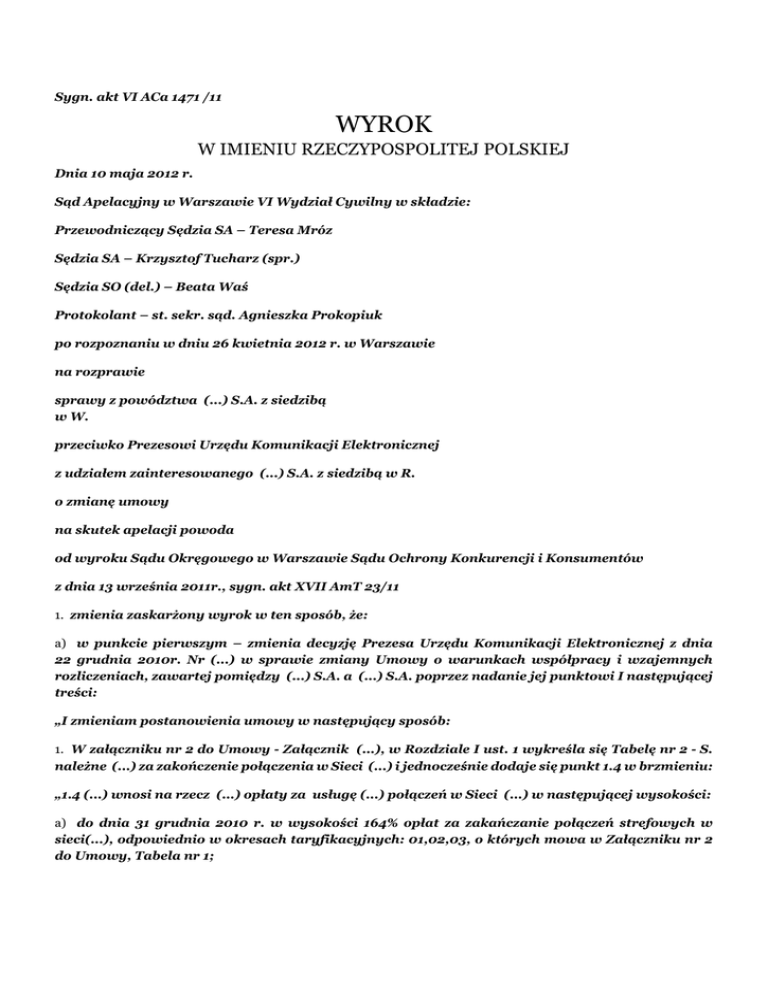 Sygn. akt VI ACa 1471 /11 WYROK W IMIENIU RZECZYPOSPOLITEJ POLSKIEJ Dnia 10 maja 2012 r. Sąd Apelacyjny w Warszawie VI Wydział Cywilny w składzie: Przewodniczący Sędzia SA – Teresa Mróz Sędzia SA – Krzysztof Tucharz (spr.) Sędzia SO (del.) – Beata Waś Protokolant – st. sekr. sąd. Agnieszka Prokopiuk po rozpoznaniu w dniu 26 kwietnia 2012 r. w Warszawie na rozprawie sprawy z powództwa (...) S.A. z siedzibą w W. przeciwko Prezesowi Urzędu Komunikacji Elektronicznej z udziałem zainteresowanego (...) S.A. z siedzibą w R. o zmianę umowy na skutek apelacji powoda od wyroku Sądu Okręgowego w Warszawie Sądu Ochrony Konkurencji i Konsumentów z dnia 13 września 2011r., sygn. akt XVII AmT 23/11 1. zmienia zaskarżony wyrok w ten sposób, że: a) w punkcie pierwszym – zmienia decyzję Prezesa Urzędu Komunikacji Elektronicznej z dnia 22 grudnia 2010r. Nr (...) w sprawie zmiany Umowy o warunkach współpracy i wzajemnych rozliczeniach, zawartej pomiędzy (...) S.A. a (...) S.A. poprzez nadanie jej punktowi I następującej treści: „I zmieniam postanowienia umowy w następujący sposób: 1. W załączniku nr 2 do Umowy - Załącznik (...), w Rozdziale I ust. 1 wykreśla się Tabelę nr 2 - S. należne (...) za zakończenie połączenia w Sieci (...) i jednocześnie dodaje się punkt 1.4 w brzmieniu: „1.4 (...) wnosi na rzecz (...) opłaty za usługę (...) połączeń w Sieci (...) w następującej wysokości: a) do dnia 31 grudnia 2010 r. w wysokości 164% opłat za zakańczanie połączeń strefowych w sieci(...), odpowiednio w okresach taryfikacyjnych: 01,02,03, o których mowa w Załączniku nr 2 do Umowy, Tabela nr 1; b) od dnia 1 stycznia 2011r. w wysokości 155% opłat za zakańczanie połączeń strefowych w sieci (...), odpowiednio w okresach taryfikacyjnych: 01,02,03, o których mowa w Załączniku nr 2 do Umowy, Tabela nr 1; c) od dnia 1 lipca 2011r. w wysokości 146% opłat za zakańczanie połączeń strefowych w sieci (...), odpowiednio w okresach taryfikacyjnych: 01,02,03, o których mowa w Załączniku nr 2 do Umowy, Tabela nr 1; d) od dnia 1 stycznia 2012r. w wysokości 137% opłat za zakańczanie połączeń strefowych w sieci (...), odpowiednio w okresach taryfikacyjnych: 01,02,03, o których mowa w Załączniku nr 2 do Umowy, Tabela nr 1; e) od dnia 1 lipca 2012r. w wysokości 127% opłat za zakańczanie połączeń strefowych w sieci (...), odpowiednio w okresach taryfikacyjnych: 01,02,03, o których mowa w Załączniku nr 2 do Umowy, Tabela nr 1; f) od dnia 1 stycznia 2013r. w wysokości 118% opłat za zakańczanie połączeń strefowych w sieci (...), odpowiednio w okresach taryfikacyjnych: 01,02,03, o których mowa w Załączniku nr 2 do Umowy, Tabela nr 1; g) od dnia 1 lipca 2013r. w wysokości 109% opłat za zakańczanie połączeń strefowych w sieci (...), odpowiednio w okresach taryfikacyjnych: 01,02,03, o których mowa w Załączniku nr 2 do Umowy, Tabela nr 1; h) od dnia 1 stycznia 2014r. w wysokości 100% opłat za zakańczanie połączeń strefowych w sieci (...), odpowiednio w okresach taryfikacyjnych: 01,02,03, o których mowa w Załączniku nr 2 do Umowy, Tabela nr 1”; 2. W załączniku nr 2 do Umowy - Załącznik (...), w Rozdziale I ust.1 dodaje się po punkcie 1.4 punkt 1.5 w brzmieniu: „1.5 W przypadku zmiany wysokości obowiązujących opłat za zakańczanie połączeń strefowych w sieci (...) w okresach taryfikacyjnych: 01,02,03, o których mowa w Tabeli nr 1, zobowiązuje się strony do przekalkulowania obowiązujących stawek za zakańczanie połączeń w sieci (...) i (...), nie później niż w dniu wprowadzenia w życie nowych opłat za zakańczanie połączeń strefowych w sieci (...) na podstawie odpowiednich decyzji Prezesa Urzędu Komunikacji Elektronicznej /Właściwego Organu” ; zaś w pozostałej części oddala odwołanie” ; b) w punkcie drugim – znosi wzajemnie między powodem a pozwanym koszty procesu; 2. oddala apelację w pozostałym zakresie; 3. znosi wzajemnie między powodem a pozwanym koszty postępowania apelacyjnego. UZASADNIENIE Wyrokiem z dnia 13 września 2011 r. Sąd Okręgowy w Warszawie – Sąd Ochrony Konkurencji i Konsumentów oddalił odwołanie (...) SA z siedzibą w W. od decyzji Prezesa Urzędu Komunikacji Elektronicznej z dnia 22 grudnia 2010 r. nr (...) w sprawie zmiany Umowy o warunkach współpracy i wzajemnych rozliczeniach, zawartej w dniu 12 lutego 2001 r. pomiędzy (...) S.A. z siedzibą w R. a (...) S.A. Sąd ustalił, że w okresie poprzedzającym wszczęcie postępowania przed Prezesem UKE nie było sporu między wskazanymi wyżej operatorami co do wysokości stawek za zakończenie połączeń głosowych w telefonicznej sieci stacjonarnej (...) (tzw. stawka (...)). W dniu 17 lutego 2010 r. (...) S.A. wysłała do (...) propozycję zmiany stawek za zakończenie tego rodzaju połączeń w wysokości odpowiadającej stawkom z harmonogramu Prezesa UKE z dnia 16 grudnia 2008 r. (k. 16 akt adm.). W nawiązaniu do tego stanowiska (...) wyraził zgodę na stosowanie opracowanego przez Prezesa UKE harmonogramu stopniowej likwidacji asymetrii stawek (...) w publicznych stacjonarnych sieciach telefonicznych, do końca 2013 r. z tym zastrzeżeniem aby przyjąć do rozliczeń jeden okres taryfikacyjny – 01 zamiast, odpowiednio trzech okresów tj. 0-1, 0-2 i 0-3. Wobec braku porozumienia, odnośnie powyższego zagadnienia, (...) wystąpiła pismem z dnia 23 czerwca 2010 r. do Prezesa UKE z wnioskiem o wydanie decyzji zmieniającej łączącą strony umowę poprzez implementację wynikającego ze stanowiska Prezesa UKE z dnia 16 grudnia 2008 r. harmonogramu dochodzenia do symetrii stawek rozliczeniowych za zakończenie połączeń w sieci stacjonarnej (...). Decyzją z dnia 22 grudnia 2010 r. Prezes UKE, po rozpatrzeniu przedmiotowego wniosku i przeprowadzeniu postępowania konsultacyjnego odnośnie projektu decyzji ustalił następujący sposób rozliczeń między (...) a (...) S
