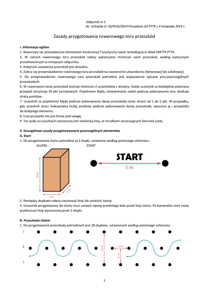 Załącznik nr 3 do Uchwały nr 33/XVIII/2014 Prezydium ZG PTTK z 4 listopada 2014 r. Zasady przygotowania rowerowego toru przeszkód I. Informacje ogólne 1. Rowerowy tor przeszkód jest elementem konkurencji Turystyczny rower wchodzącej w skład OMTTK PTTK. 2. W ramach rowerowego toru przeszkód należy wykorzystać minimum sześć przeszkód, według wytycznych przedstawionych w niniejszym załączniku. 3. Kolejność ustawienia przeszkód jest dowolna. 4. Zaleca się przeprowadzenie rowerowego toru przeszkód na nawierzchni utwardzonej (betonowej lub asfaltowej). 5. Do przeprowadzenia rowerowego toru przeszkód potrzebne jest wyposażenie opisane przy poszczególnych przeszkodach. 6. W rowerowym torze przeszkód startuje minimum 2 uczestników z drużyny. Każdy uczestnik za bezbłędnie pokonany przejazd otrzymuje 20 pkt turniejowych. Popełnione błędy, niewykonanie zadań podczas pokonywania toru skutkuje stratą punktów. 7. Uczestnik za popełnione błędy podczas pokonywania danej przeszkody może stracić od 1 do 5 pkt. W przypadku, gdy uczestnik straci maksymalną liczbę punktów podczas pokonywania danej przeszkody, opuszcza ją i przejeżdża do kolejnego elementu. 8. Czas przejazdu nie jest brany pod uwagę. 9. Tor jazdy na rysunkach zaznaczony jest niebieską linią, ze strzałkami oznaczającymi kierunek jazdy. II. Szczegółowe zasady przygotowywania poszczególnych elementów A. Start 1. Do przygotowania startu potrzebne są 2 słupki, ustawione według poniższego schematu: SŁUPEK START 2. Pomiędzy słupkami należy narysować linię lub umieścić taśmę. 3. Uczestnik przygotowany do startu musi ustawić oponę przedniego koła przed linią startu. Po komendzie start może przekroczyć linię wyznaczaną przez 2 słupki. B. Przeszkoda slalom 1. Do przygotowania przeszkody potrzebnych jest 28 słupków, ustawionych według poniższego schematu: A B A 1 2. Zamiast zewnętrznego szeregu słupków można wykorzystać taśmę lub wyrysować linię po najechaniu, której uczestnik otrzymuje punkty karne, podobnie jak za naruszenie słupka. 3. Konkurencja polega na przejechaniu pomiędzy każdym z 10 słupków ustawionych w szeregu w linii B bez najechania, przewrócenia, ominięcia słupków tworzących element zarówno linii A jak i B. 4. Punktacja: 1) za przewrócenie słupka – strata 1 punktu, 2) za ominięcie słupka – strata 1 punktu, 3) za każdą podpórkę nogą – strata 1 punktu, 4) za wyjechanie poza slalom – strata 1 punktu, 5) maksymalnie za slalom można stracić 5 punktów. C. Przeszkoda ósemka 1. Do przygotowania tej przeszkody potrzebnych jest 50 słupków, ustawionych według poniższego schematu: 2. Ósemkę można wymalować. W takim przypadku stratę punktu liczy się za każde najechanie na linię wyznaczającą przeszkodę. 3. Konkurencja polega na przejechaniu rowerem toru, oznaczonego przez wnętrze i zewnętrzne okręgi wyznaczające przeszkodę ósemki, bez przewrócenia słupków (lub najechania na linię). 4. Punktacja: 1) za przewrócenie słupka (najechanie na linię) – strata 1 punktu, 2) za każdą podpórkę nogą – strata 1 punktu, 3) za wyjechanie poza ósemkę obydwoma kołami – strata 1 punktu, 4) maksymalnie za ósemkę można stracić 5 punktów. D. Przeszkoda jazda na wprost 1. Do przygotowania tej przeszkody potrzebna jest deska o długości od 4 do 8 metrów, szerokości około 20 cm. 2. Konkurencja polega na wjechaniu na deskę i przejechaniu wzdłuż całej jej długości. Pokonanie przeszkody liczy się od momentu wjazdu pierwszego koła do opuszczenia przeszkody przez tylne koło. 3. Punktacja: 1) za zjechanie z deski jednym kołem – strata 1 punktu, 2) za zjechanie z deski dwoma kołami – strata 2 punktów, 2 3) maksymalnie za jazdę na wprost można stracić 2 punkty. E. Przeszkoda przenoszenie przedmiotu 1. Do przygotowania tej przeszkody potrzebne są dwa krzesła i jeden słupek, ustawione według poniższego schematu: 2. Konkurencja polega na przewiezieniu przedmiotu z jednego krzesła i umieszczeniu go na drugim krześle. 3. Punktacja: 1) upuszczenie słupka w trakcie przenoszenia – strata 1 punktu, 2) przewrócenie słupka w trakcie ustawiania na drugim krześle – strata 1 punktu, 3) podpórka nogą podczas chwytania bądź stawiania słupka – strata 1 punktu, 4) maksymalnie za przenoszenie przedmiotu można stracić 2 punkty. F. Przeszkoda rzut piłką do celu 1. Do przygotowania tej przeszkody potrzebne są krzesło, piłka tenisowa oraz kosz, ustawione według poniższego schematu. Kosz i krzesło ustawione są bezpośrednio na powierzchni, po której porusza się rowerzysta. Kosz powinien być ustawiony w odległości 3 merów od toru jazdy. 2. Konkurencja polega na podniesieniu przedmiotu z krzesła i umieszczeniu go w koszu. 3. Punktacja: 1) upuszczenie piłki – strata 1 punku, 2) nietrafienie piłką do kosza – strata 1 punktu, 3) każda podpórka nogą podczas wykonywania zadania – strata 1 punktu, 4) maksymalnie za rzut piłką do celu można stracić 3 punkty. 3 G. Przeszkoda garaż 1. Do przygotowania przeszkody potrzebne są trzy tyczki, z tego dwie na stojakach, ustawione według poniższego schematu. 2. Konkurencja polega na przejechaniu przez bramkę bez strącenia poziomej tyczki oraz potrącenia tyczek stojących. 2. Punktacja: 1) strącenie tyczki – strata 1 punktu, 2) strącenie tyczki, przewrócenie tyczki lub tyczek na stojakach – strata 2 punktów, 3) maksymalnie za garaż można stracić 2 punkty. H. Przeszkoda bramka 1. Do przygotowania przeszkody potrzebna jest bramka wykonana według schematu, dwie tyczki do zawieszenia oraz dwa słupki. 2. Konkurencja polega na przejechaniu przez bramkę w ten sposób, aby koło roweru przeszło pomiędzy słupkami stojącymi na ziemi, a rowerzysta zmieścił się pomiędzy wiszącymi tyczkami, bez ich poruszenia. 3. Punktacja: 1) poruszenie kołem słupka stającego na ziemi – strata 1 punktu 2) ominięcie słupków 