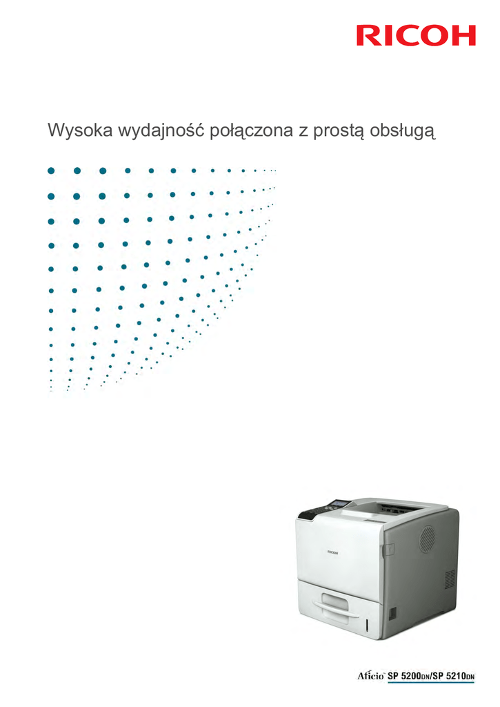 Wysoka wydajność połączona z prostą obsługą Prędkość, wydajność i niskie TCO Przyjazne dla użytkownika, ekologiczne i wydajne - nasze drukarki zapewniają to wszystko czego potrzebuje zapracowane biuro. Możesz cieszyć się zadziwiającą prędkością drukowania, automatycznym dupleksem, doskonałym prowadzeniem papieru i najnowszymi funkcjami bezpieczeństwa. Dla większych grup roboczych masz możliwość rozbudowania drukarki dodając 5 kaset na papier. Korzyści: Duża prędkość, aby zmaksymalizować wydajność Łatwość obsługi Wbudowana ochrona danych Szybka instalacja Niski koszt posiadania (TCO) ZWIĘKSZ WYDAJNOŚĆ Szybki procesor CPU zapewnia naszym drukarkom szybkie działanie. Pierwszą stronę otrzymasz po 7,5 sekundy a prędkość wydruku to 45/50 stron na minutę. Prosta obsługa papieru oszczędza czas i sprawia, że współpraca z urządzeniem staje się prostsza. Imponująca pojemność (650 arkuszy) papieru, może zostać rozszerzona do maksymalnie 2850 arkuszy, co pozwala na wzrost wydajności. STWÓRZ PRZESTRZEŃ I UŁATW SOBIE PRACĘ Nasz drukarki można rozbudować z drukarki nabiurkowej do wysokonakładowego modelu stojącego na podłodze, bez zajmowania dodatkowej powierzchni biurowej. Konfiguracja i obsługa urządzenia jest bardzo prosta. Urządzenia automatycznie wykrywają rozmiar papieru, obsługując papier o gramaturze od 52g/m² do 220g/m². 4 liniowy wyświetlacz LCD w przejrzysty sposób wyświetla wszystkie komunikaty, również te o stanie tonera. OCHRONA POUFNYCH DANYCH Pełen zestaw standardowych oraz opcjonalnych narzędzi zabezpiecza i chroni dane. Enhanced Lock Print zapobiega wydrukowaniu kopii bez wcześniejszego wprowadzenia kodu PIN. Możesz także ograniczyć korzystanie z urządzenia przez wskazanie zatwierdzonych grup lub osób. Oprócz tych standardowych funkcji, urządzenie oferuje pakiet autoryzacyjny z użyciem kart, dzięki czemu dane będą jeszcze bardziej chronione. Dodatkowo, na dokumentach można umieścić znaki wodne, aby chronić je przed nieautoryzowanym kopiowaniem. NAJLEPSZE POŁĄCZENIA Obie drukarki zapewniają łatwe podłączenie do sieci za pomocą prostej, oszczędzającej czas instalacji sterownika. Pełna wersja @Remote dostarcza w realnym czasie zdalną obsługę do monitorowania wydajności i zarządzania diagnostyką, w celu zwiększenia wydajności. Oryginalny moduł IPDSTM usprawnia procesy druku łącząc łatwość zarządzania dokumentami i redukcję kosztów. ZREDUKUJ SWOJE KOSZTY Nasze drukarki mają na celu zminimalizowanie całkowitego kosztu posiadania (TCO). Są łatwe w obsłudze, a ich wysoki cykl duty sprawia, że gdy tylko potrzebujesz zawsze są gotowe do pracy. Drukowanie dwustronne jest automatyczne i oszczędza papier. Dzięki kontroli ilości wydruków, zapobiegasz nadmiernej eksploatacji, co przekłada się na redukcję kosztów. CHROŃ ŚRODOWISKO Zrównoważony rozwój jest mocną stroną naszego zaangażowania, dotyczy każdej części naszej firmy, od produkcji poprzez dystrybucję, stronę biznesową aż do recyklingu. Maksymalizacja wydajności jest zobowiązaniem, a nasze drukarki są zgodne z polityką Energy Star i BAM. Toner „All-in-one” i niskie zużycie energii także pomaga w oszczędzaniu energii i redukcji kosztów. OGÓLNE Technologia: OBSŁUGIWANY PAPIER Skanowanie wiązką laserową i drukowanie Pojemność wejściowa papieru: Standardowo: 1 x 550-arkuszowa kaseta na elektrofotograficzne, technologia toneru "All-In- papier One" 100-arkuszowa taca ręczna Prędkość drukowania ciągłego: 45/50 wydruków na minutę Czas nagrzewania: 20/29 sekund lub mniej Pojemność wyjściowa papieru: 500 arkuszy Pierwszy wydruk: 7,5 sekund lub mniej Rozmiar papieru: A6 - A4 Wymiary (szer. x gł. x wys.): 411 x 435 x 400 mm Gramatura papieru: Kaseta standardowa: 52 - 220 g/m² Waga: Mniej niż 23 kg Źródło zasilania: 220 - 240 V, 50 - 60 Hz Pobór mocy: Maksymalnie: 1 400 W lub mniej Cykl duty: Maksymalnie: 2 850 arkuszy Taca ręczna: 52 - 220 g/m² Dupleks: 60 - 163 g/m² Nośniki: Kaseta standardowa/opcjonalna: Papier zwykły, Tryb oszczędzania energii: 5 W lub mniej papier ekologiczny, papier średnio-gruby, papier 200 000 stron miesięcznie gruby, papier gruby 2, papier gruby 3, papier cienki, papier z nagłówkiem, etykiety, papier z nadrukiem, papier specjalny 1, papier specjalny KONTROLER 1, papier specjalny 1, papier kolorowy Procesor: 533 MHz Język drukarki/rozdzielczość: PCL5e/6, Adobe PostScript 3, PDF, IPDS Taca ręczna: Papier zwykły, średnio-gruby, papier gruby 1, papier gruby 2, papier gruby 3, papier cienki, papier z nagłówkiem, arkusze (opcja) etykiet, papier specjalny 1, papier specjalny 2, Do 1 200 x 600 dpi (1bit) Pamięć: papier specjalny 3, papier z nadrukiem, papier Standardowo: 256/768 MB kolorowy, papier ekologiczny, folia OHP Maksymalnie: 768 MB Sterowniki: (przezroczysta), koperty PCL5e/6 PostScript3: Windows XP/Vista/7 Server 2003/2008 Mac OS 8.6 lub nowszy Czcionki: MATERIAŁY EKSPLOATACYJNE Mac OSX Toner: IPDS (oryginalny) Aficio™SP 5200DN/SP 5210DN dostarczony jest z zestawem startowym. Czarny: 25 000 arkuszy PCL: 45 czcionek + 13 czcionek międzynarodowych PostScript3: 136 czcionek IPDS: 108 czcionek (opcja) OPCJE Opcje wewnętrzne: Pamięć 256 MB (SP 5200DN), pamięć 512 MB (SP 5200DN), dysk twardy (SP 5200DN), karta VM (SP 5200DN), Netware, zespół IPDS, karta PODŁĄCZENIA Protokół sieciowy: Obsługiwane środowiska: Gigabit Ethernet, IEEE802.11a/g TCP/IP (IPv4, IPv6), IPX/SPX, Apple Talk, Opcje zewnętrzne: Zespół podawania papieru (TK1120), Zespół Bonjour podawania papieru (TK1130), Niska szafka, Windows XP/ Vista/Server 2003/2008 (32 bity, Średnia szafka, Wysoka szafka 64 bity)/7, Macintosh OS (wersja 8.6 lub nowsza), Novell Netware (wersja 6.5 lub nowszy), Unix (używając filtru Ricoh Unix) Interfejs: USB 2.0 (Type A i B) W celu sprawdzenia dostępności modeli, opcji oraz oprogramowania prosimy skontak