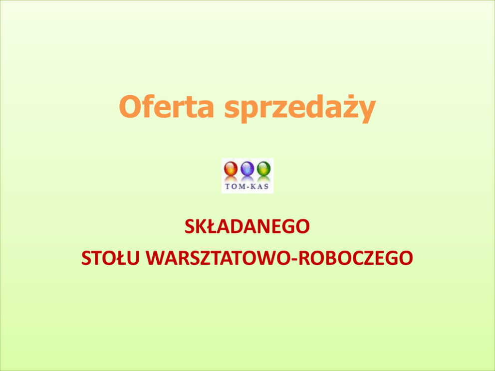 Oferta sprzedaży SKŁADANEGO STOŁU WARSZTATOWO-ROBOCZEGO Specyfikacja: 1) Wymiary: - długośd 165 cm - szerokośd 60 cm - wysokośd 85 cm 2) Stelaż metalowy do samodzielnego montażu, powlekany farbą proszkową w kolorach: czarny, szary, brązowy. 3) Stabilny i wytrzymały blat drewniany o grubości 30 mm. 4) Maksymalne obciążenie 200 kg. Stół świetnie nadaje się do warsztatów, magazynów oraz zastosowao amatorskich, np. dla majsterkowiczów. Stół złożony wraz z opakowaniem. Dostępne są dwie opcje opakowania jedno i dwuczęściowe. Stół w opakowaniu, z instrukcją montażu i kompletem śrub. Stół posiada możliwośd mocowania śrubami do podłoża. Istnieje możliwośd indywidualnego doboru naklejki reklamowej, np. pod konkretne akcje promocyjne, reklamowe, sprzedażowe. Cena stołu brutto, łącznie z opakowaniem to 122,99 zł CDS „TOM-KAS” Tomasz Ostrowski Ul. Sosnowa 5 19-500 Gołdap Tel./fax 87 6154133 Tel. kom. 698654705 E-mail: [email protected]