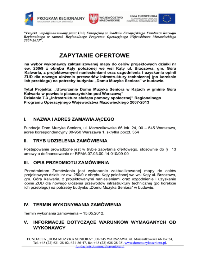 "Projekt współfinansowany przez Unię Europejską ze środków Europejskiego Funduszu Rozwoju Regionalnego w ramach Regionalnego Programu Operacyjnego Województwa Mazowieckiego 2007-2013". ZAPYTANIE OFERTOWE na wybór wykonawcy zaktualizowanej mapy do celów projektowych działki nr ew. 250/9 z obrębu Kąty położonej we wsi Kąty ul. Brzozowa, gm. Góra Kalwaria, z projektowanymi naniesieniami oraz uzgodnienia i uzyskania opinii ZUD dla nowego ułożenia przewodów infrastruktury technicznej (po korekcie ich przebiegu) na potrzeby budynku „Domu Muzyka Seniora" w budowie. Tytuł Projektu: „Utworzenie Domu Muzyka Seniora w Kątach w gminie Góra Kalwaria w powiecie piaseczyńskim pod Warszawą” Działanie 7.3 „Infrastruktura służąca pomocy społecznej” Regionalnego Programu Operacyjnego Województwa Mazowieckiego 2007-2013 I. NAZWA I ADRES ZAMAWIAJĄCEGO Fundacja Dom Muzyka Seniora, ul. Marszałkowska 66 lok. 24, 00 – 545 Warszawa, adres korespondencyjny 00-950 Warszawa 1, skrytka poczt. 354 II. TRYB UDZIELENIA ZAMÓWIENIA Postępowanie prowadzone jest w trybie zapytania ofertowego, stosownie do § 13 umowy o dofinansowanie nr RPMA.07.03.00-14-010/09-00 III. OPIS PRZEDMIOTU ZAMÓWIENIA Przedmiotem Zamówienia jest wykonanie zaktualizowanej mapy do celów projektowych działki nr ew. 250/9 z obrębu Kąty położonej we wsi Kąty ul. Brzozowa, gm. Góra Kalwaria, z projektowanymi naniesieniami oraz uzgodnienie i uzyskanie opinii ZUD dla nowego ułożenia przewodów infrastruktury technicznej (po korekcie ich przebiegu) na potrzeby budynku „Domu Muzyka Seniora" w budowie. IV. TERMIN WYKONYWANIA ZAMÓWIENIA Termin wykonania zamówienia – 15.05.2012. V. INFORMACJE DOTYCZĄCE WARUNKÓW WYMAGANYCH OD WYKONAWCY FUNDACJA „DOM MUZYKA SENIORA” , 00-545 WARSZAWA, ul. Marszałkowska 66 lok.24, Tel. +48 (22) 621-28-02, 621-86-47, fax +48 (22) 628-28-35, www.dommuzykaseniora.pl, [email protected] "Projekt współfinansowany przez Unię Europejską ze środków Europejskiego Funduszu Rozwoju Regionalnego w ramach Regionalnego Programu Operacyjnego Województwa Mazowieckiego 2007-2013". 1. O zamówienie mogą ubiegać się podmioty, które spełniają określone warunki, tj.: a. Posiadają niezbędną wiedzę i doświadczenie oraz dysponują potencjałem technicznym i osobami zdolnymi do wykonania świadczenia b. Przedstawią ofertę zgodną z wymaganiami niniejszego Zapytania; c. Złożą tylko jedną ofertę dotyczącą przedmiotu zamówienia; 2. Zamawiający nie dopuszcza możliwości składania ofert częściowych i wariantowych. VI. TERMIN ZWIĄZANIA OFERTĄ: 1. Wykonawca pozostaje związany ofertą 30 dni; 2. Bieg terminu, o którym mowa w ust. 1 rozpoczyna się wraz z upływem terminu składania ofert. VII. OPIS SPOSOBU PRZYGOTOWANIA OFERTY: 1. Wykonawca ma prawo złożyć tylko jedną ofertę, zawierającą jednoznacznie opisaną propozycję. Złożenie większej ilości ofert lub złożenie oferty wariantowej spowoduje odrzucenie wszystkich ofert złożonych przez Przedsiębiorcę. 2. Ofertę należy sporządzić w formie pisemnej, w języku polskim pod rygorem nieważności, na maszynie lub komputerze. 3. Oferta musi być podpisana zgodnie z zasadami reprezentacji wskazanymi we właściwym rejestrze lub ewidencji działalności gospodarczej. 4. Przedsiębiorca może wprowadzić zmiany lub wycofać złożoną przez siebie ofertę, pod warunkiem, że Zamawiający otrzyma pisemne powiadomienie o wprowadzeniu zmian lub wycofaniu oferty, przed upływem terminu składania ofert. Powiadomienie o wprowadzeniu zmian lub wycofaniu ofert musi być oznaczone jak w punkcie 7 oraz dodatkowo opisane „zmiana” lub „wycofanie”. 5. Przedsiębiorca nie może wycofać oferty ani wprowadzić zmian w treści oferty po upływie terminu składania ofert. FUNDACJA „DOM MUZYKA SENIORA” , 00-545 WARSZAWA, ul. Marszałkowska 66 lok.24, Tel. +48 (22) 621-28-02, 621-86-47, fax +48 (22) 628-28-35, www.dommuzykaseniora.pl, [email protected] "Projekt współfinansowany przez Unię Europejską ze środków Europejskiego Funduszu Rozwoju Regionalnego w ramach Regionalnego Programu Operacyjnego Województwa Mazowieckiego 2007-2013". 6. Przedsiębiorcy ponoszą wszelkie koszty związane z przygotowaniem i złożeniem oferty. 7. Oferty powinny być przesyłane listownie na adres Zamawiającego: Fundacja Dom Muzyka Seniora 00-950 Warszawa 1 skrytka poczt. 354 z dopiskiem: „Usługi geodezyjne dla Domu Muzyka Seniora, położonego w Kątach dz. Ew, 250/9 w gminie Góra Kalwaria pod Warszawą” - „nie otwierać przed dniem otwarcia ofert tj. do 20.02.2012, oraz opatrzone nazwą i dokładnym adresem Oferenta. VIII.MIEJSCE ORAZ TERMIN SKŁADANIA OFERT: 1. Termin składania ofert w siedzibie Zamawiającego upływa dnia 20.02.2012 o godz. 10.00 . 2. Wszystkie oferty otrzymane po wymienionym wyżej terminie zostaną odrzucone, przy czym decydujące znaczenie dla oceny zachowania powyższego terminu ma data oraz godzina wpływu oferty do Zamawiającego, a nie data wysłania. IX. KRYTERIA OCENY I WYBÓR OFERT: 1. Formalnej i merytorycznej oceny dokona powołana przez Zarząd Fundacji Komisja. 2. a. Do oceny merytorycznej zostaną zakwalifikowane jedynie te oferty, które spełnią wszystkie kryteria oceny formalnej: Forma i termin złożenia oferty; b. Podpisanie oferty przez uprawnioną osobę (zaparafowana każda strona, a ostatnia z podpisem i pieczątką firmową); 3. Ocenie merytorycznej będzie podlegała: a. Cena…………………………………………………………..max.40 pkt b. Doświadczenie i potencjał techniczny do wykonania zamówienia - max. 60 pkt RAZEM…………………………………………………………max. 100 punktów FUNDACJA „DOM MUZYKA SENIORA” , 00-545 WARSZAWA, ul. Marszałkowska 66 lok.24, Tel. +48 (22) 621-28-02, 621-86-47, fax +48 (22) 628-28-35, www.dommuzykaseniora.pl, [email protected] "Projekt współfinansowany przez Unię Europejską ze