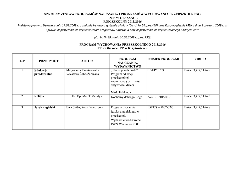 programy nauczania pp krzyzowice, pp olszanka, psp olszanka, pg