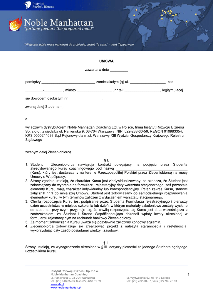 UMOWA zawarta w dniu _________ pomiędzy ___________________________ zamieszkałym (ą) ul. __________________, kod _________-_________ , miasto __________________, nr tel: __________________, legitymującej się dowodem osobistym nr _________________, zwaną dalej Studentem, a wyłącznym dystrybutorem Noble Manhattan Coaching Ltd. w Polsce, firmą Instytut Rozwoju Biznesu Sp. z o.o., z siedzibą ul. Panieńska 9, 03-704 Warszawa, NIP: 522-238-30-56, REGON 010983354, KRS 0000244698 Sąd Rejonowy dla m.st. Warszawy XIII Wydział Gospodarczy Krajowego Rejestru Sądowego zwanym dalej Zleceniobiorcą. § I. 1. Student i Zleceniobiorca nawiązują kontrakt polegający na podjęciu przez Studenta akredytowanego kursu coachingowego pod nazwą ____________________________________ (Kurs), który jest dostarczany na terenie Rzeczpospolitej Polskiej przez Zleceniobiorcę na mocy Umowy o Współpracy. 2. Strony zgodnie ustalają, że charakter Kursu jest zindywidualizowany, co oznacza, że Student jest zobowiązany do wybrania na formularzu rejestracyjny daty warsztatu stacjonarnego, zaś pozostałe elementy Kursu mają charakter indywidualny lub korespondencyjny. Pełen zakres Kursu, stanowi załącznik nr 1 do niniejszej Umowy. Student jest zobowiązany do samodzielnego rozplanowania elementów kursu, w tym terminów zaliczeń z wyłączeniem warsztatu stacjonarnego. 3. Chwilą rozpoczęcia Kursu jest podpisanie przez Studenta Formularza rejestracyjnego i pierwszy dzień uczestnictwa w miejscu szkolenia lub dzień, w którym materiały szkoleniowe zostały wysłane do studenta, przy czym przyjmuje się, że chwilą rozpoczęcia się Kursu jest data wcześniejsza z zastrzeżeniem, że Student i Strona Współfinansująca dokonali wpłaty kwoty określonej w formularzu rejestracyjnym na rachunek bankowy Zleceniobiorcy. 3. Za moment zakończenia Kursu uważa się pozytywnie zaliczony końcowy egzamin. 4. Zleceniobiorca zobowiązuje się zrealizować projekt z należytą starannością i rzetelnością, wykorzystując cały zasób posiadanej wiedzy i zasobów. § II. Strony ustalają, że wynagrodzenie określone w § III dotyczy płatności za jednego Studenta będącego uczestnikiem Kursu. Instytut Rozwoju Biznesu Sp. z o.o. Noble Manhattan Coaching ul. Panieńska 9, 03-704 Warszawa tel.: (22) 618 85 83, faks (22) 618 51 59 www.irb.pl www.noblemanhattan.pl ul. Wyzwolenia 63, 05-140 Serock tel.: (22) 782-78-87, faks (22) 782 73 91 1 § III. Strony ustalają, że wynagrodzenie Zleceniobiorcy za udział Studenta w Kursie wynosi łącznie PLN ……………. (słownie PLN: ……………………), płatne z góry w dniu podpisania Umowy, przelewem na rachunek bankowy nr 63 1910 1123 1910 7369 2121 0001 prowadzony przez Deutsche Bank PBC SA O/Warszawa. . § IV. W czasie obowiązywania niniejszej Umowy, jak również po jej wygaśnięciu Strony zobowiązują się do zachowania w całkowitej tajemnicy wszelkich informacji finansowych, handlowych, organizacyjnych i technologicznych drugiej Strony. § V. W przypadku zwłoki Studenta z uiszczeniem opłat określonych w § III niniejszej Umowy, całkowita płatność za Kurs staje się wymagalna w trybie natychmiastowym. § VI. W sprawach nie uregulowanych niniejszą umową mają zastosowanie przepisy Kodeksu Cywilnego, a roszczenia będą realizowane w sądzie właściwym do adresu Zleceniobiorcy. § VII. 1. W sprawach nieuregulowanych w niniejszej Umowie zastosowanie znajdują w pierwszej kolejności postanowienia zawarte w załączniku nr 3 Warunki umowy. 2. Integralną częścią niniejszej Umowy są następujące załączniki: a) Nr 1 - Zakres kursu, b) Nr 2 - Warunki umowy, c) Nr 3 - Formularz rejestracyjny, § VIII. Wszelkie zmiany lub uzupełnienia umowy będą dokonywane w formie pisemnej. § IX. Umowę sporządzono w 2 (dwóch) jednobrzmiących egzemplarzach, po jednym dla każdej ze stron. ___________________________ Student (data i podpis) Instytut Rozwoju Biznesu Sp. z o.o. Noble Manhattan Coaching ul. Panieńska 9, 03-704 Warszawa tel.: (22) 618 85 83, faks (22) 618 51 59 www.irb.pl www.noblemanhattan.pl ________________________ Zleceniobiorca (data i podpis) ul. Wyzwolenia 63, 05-140 Serock tel.: (22) 782-78-87, faks (22) 782 73 91 2