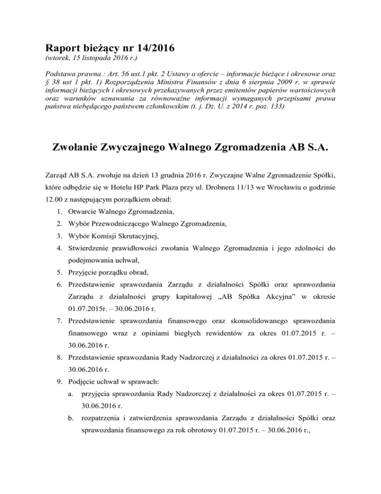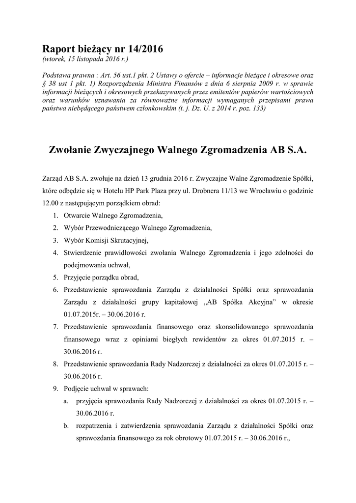Raport bieżący nr 14/2016 (wtorek, 15 listopada 2016 r.) Podstawa prawna : Art. 56 ust.1 pkt. 2 Ustawy o ofercie – informacje bieżące i okresowe oraz § 38 ust 1 pkt. 1) Rozporządzenia Ministra Finansów z dnia 6 sierpnia 2009 r. w sprawie informacji bieżących i okresowych przekazywanych przez emitentów papierów wartościowych oraz warunków uznawania za równoważne informacji wymaganych przepisami prawa państwa niebędącego państwem członkowskim (t. j. Dz. U. z 2014 r. poz. 133) Zwołanie Zwyczajnego Walnego Zgromadzenia AB S.A. Zarząd AB S.A. zwołuje na dzień 13 grudnia 2016 r. Zwyczajne Walne Zgromadzenie Spółki, które odbędzie się w Hotelu HP Park Plaza przy ul. Drobnera 11/13 we Wrocławiu o godzinie 12.00 z następującym porządkiem obrad: 1. Otwarcie Walnego Zgromadzenia, 2. Wybór Przewodniczącego Walnego Zgromadzenia, 3. Wybór Komisji Skrutacyjnej, 4. Stwierdzenie prawidłowości zwołania Walnego Zgromadzenia i jego zdolności do podejmowania uchwał, 5. Przyjęcie porządku obrad, 6. Przedstawienie sprawozdania Zarządu z działalności Spółki oraz sprawozdania Zarządu z działalności grupy kapitałowej „AB Spółka Akcyjna” w okresie 01.07.2015r. – 30.06.2016 r. 7. Przedstawienie sprawozdania finansowego oraz skonsolidowanego sprawozdania finansowego wraz z opiniami biegłych rewidentów za okres 01.07.2015 r. – 30.06.2016 r. 8. Przedstawienie sprawozdania Rady Nadzorczej z działalności za okres 01.07.2015 r. – 30.06.2016 r. 9. Podjęcie uchwał w sprawach: a. przyjęcia sprawozdania Rady Nadzorczej z działalności za okres 01.07.2015 r. – 30.06.2016 r. b. rozpatrzenia i zatwierdzenia sprawozdania Zarządu z działalności Spółki oraz sprawozdania finansowego za rok obrotowy 01.07.2015 r. – 30.06.2016 r., c. rozpatrzenia i zatwierdzenia sprawozdania Zarządu z działalności grupy kapitałowej „AB Spółka Akcyjna” oraz skonsolidowanego sprawozdania finansowego za rok obrotowy 01.07.2015 r. – 30.06.2016 r., d. przeznaczenia zysku za rok obrotowy 01.07.2015 r. – 30.06.2016 r. e. udzielenia członkom Zarządu oraz członkom Rady Nadzorczej Spółki absolutorium z wykonania obowiązków w roku obrotowym 01.07.2015 r. – 30.06.2016 r., 10. Wolne wnioski, 11. Zamknięcie obrad Zwyczajnego Walnego Zgromadzenia Do udziału w Walnym Zgromadzeniu uprawnione będą wyłącznie osoby będące Akcjonariuszami Spółki w dniu 27 listopada 2016 r. (dzień rejestracji uczestnictwa w walnym zgromadzeniu), jeżeli: a. będąc uprawnionymi z akcji imiennych będą wpisani do księgi akcyjnej w dniu 27 listopada 2016r., tj. w dniu rejestracji uczestnictwa w Zwyczajnym Walnym Zgromadzeniu. b. będąc uprawnionymi ze zdematerializowanych akcji na okaziciela zostaną umieszczeni na liście uprawnionych ze zdematerializowanych akcji na okaziciela ustalonej przez Spółkę na podstawie wykazu sporządzonego przez podmiot prowadzący depozyt papierów wartościowych. Wykaz ten sporządzany jest przez podmiot prowadzący depozyt papierów wartościowych na podstawie wykazów przekazanych przez podmioty prowadzące rachunki papierów wartościowych. Podmioty prowadzące rachunki papierów wartościowych sporządzają wykaz na podstawie wystawionych zaświadczeń o prawie uczestnictwa w ZWZ. Zaświadczenia o prawie uczestnictwa w Walnym Zgromadzeniu wydawane są wyłącznie na żądanie Akcjonariusza. Akcjonariusz może złożyć żądanie nie wcześniej niż w dniu ukazania się ogłoszenia o zwołaniu Zwyczajnego Walnego Zgromadzenia oraz nie później niż w pierwszym dniu powszednim po dniu rejestracji, tj. w dniu 28 listopada 2016 r. W razie nie złożenia przez Akcjonariusza żądania wystawienia imiennego zaświadczenia o prawie do uczestniczenia w Walnym Zgromadzeniu, Akcjonariusz nie zostanie umieszczony w wykazie oraz na liście uprawnionych ustalonej przez Spółkę. Zgodnie z art. 407 § 1 Kodeksu spółek handlowych lista Akcjonariuszy uprawnionych do uczestnictwa w Walnym Zgromadzeniu będzie wyłożona do wglądu w siedzibie Spółki w Magnicach przy ul. Europejskiej 4 na trzy dni powszednie przed terminem Walnego Zgromadzenia. Na żądanie Akcjonariusza lista akcjonariuszy uprawnionych do uczestnictwa w ZWZ jest przesyłana na wskazany w żądaniu adres mailowy Akcjonariusza. Akcjonariuszowi lub Akcjonariuszom reprezentującym co najmniej jedną dwudziestą kapitału zakładowego przysługuje prawo do: 1. żądania umieszczenia określonych spraw w porządku obrad Walnego Zgromadzenia. Żądanie powinno zostać zgłoszone Zarządowi nie później niż na dwadzieścia jeden dni przed wyznaczonym terminem Zgromadzenia. Żądanie powinno zawierać uzasadnienie lub projekt uchwały dotyczącej proponowanego punktu porządku obrad. Żądanie może zostać złożone w postaci elektronicznej. 2. zgłaszania Spółce przed terminem Walnego Zgromadzenia na piśmie lub przy wykorzystaniu środków komunikacji elektronicznej projektów uchwał dotyczących spraw wprowadzonych do porządku obrad Walnego Zgromadzenia lub spraw, które mają zostać wprowadzone do porządku obrad. Każdy z Akcjonariuszy może również zgłaszać podczas Walnego Zgromadzenia projekty uchwał dotyczące spraw wprowadzonych do porządku obrad. Akcjonariusze mają prawo uczestniczenia w ZWZ osobiście lub przez pełnomocnika. Pełnomocnictwo do uczestnictwa w Walnym Zgromadzeniu i wykonywania prawa głosu powinno być udzielone na piśmie lub w postaci elektronicznej. Udzielenie pełnomocnictwa w postaci elektronicznej nie wymaga opatrzenia bezpiecznym podpisem elektronicznym weryfikowanym przy pomocy ważnego kwalifikowanego certyfikatu. Udzielenie pełnomocnictwa w formie elektronicznej oraz zawiadomienie o udzieleniu takiego pełnomocnictwa powinno nastąpić na adres mailowy Spółki: [email protected]. Udzielając pełnomocnictwa Akcjonariusz może skorzystać z formularza zamieszczonego na stronie internetowej spółki: www.ab.pl. Ryzyko związane z użycie