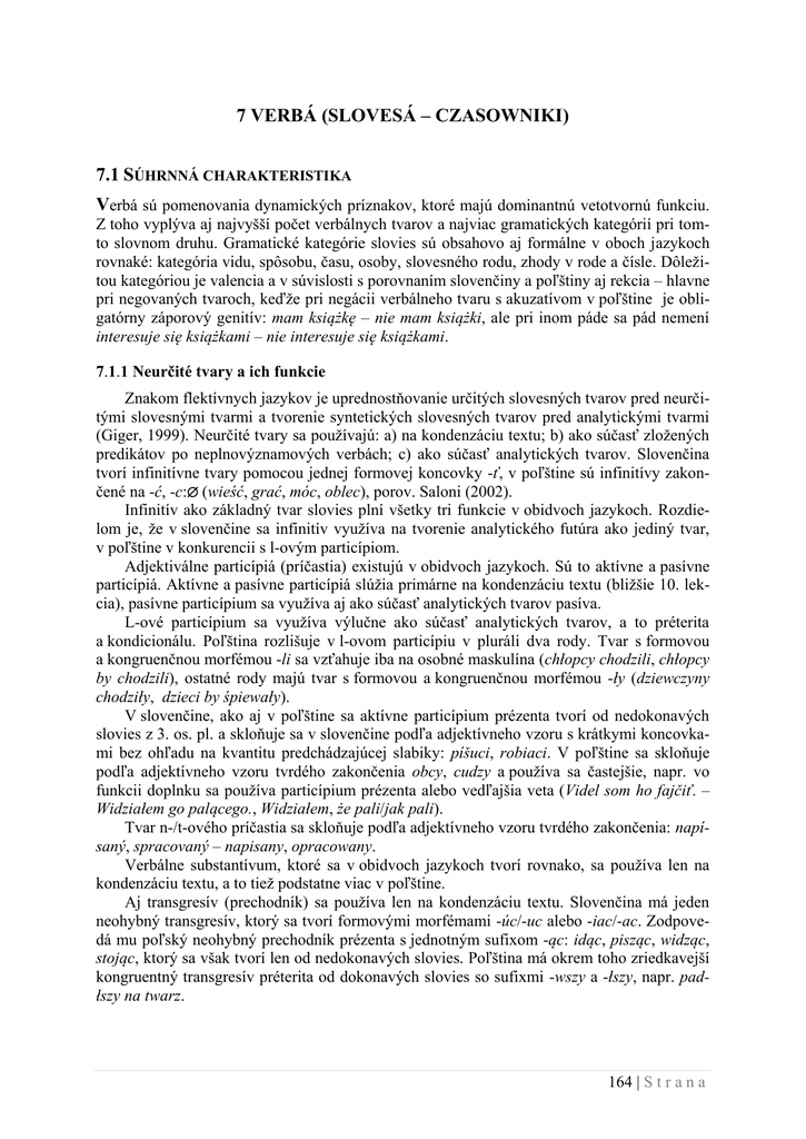 7 VERBÁ (SLOVESÁ – CZASOWNIKI) 7.1 SÚHRNNÁ CHARAKTERISTIKA Verbá sú pomenovania dynamických príznakov, ktoré majú dominantnú vetotvornú funkciu. Z toho vyplýva aj najvyšší počet verbálnych tvarov a najviac gramatických kategórií pri tomto slovnom druhu. Gramatické kategórie slovies sú obsahovo aj formálne v oboch jazykoch rovnaké: kategória vidu, spôsobu, času, osoby, slovesného rodu, zhody v rode a čísle. Dôležitou kategóriou je valencia a v súvislosti s porovnaním slovenčiny a poľštiny aj rekcia – hlavne pri negovaných tvaroch, keďže pri negácii verbálneho tvaru s akuzatívom v poľštine je obligatórny záporový genitív: mam książkę – nie mam książki, ale pri inom páde sa pád nemení interesuje się książkami – nie interesuje się książkami. 7.1.1 Neurčité tvary a ich funkcie Znakom flektívnych jazykov je uprednostňovanie určitých slovesných tvarov pred neurčitými slovesnými tvarmi a tvorenie syntetických slovesných tvarov pred analytickými tvarmi (Giger, 1999). Neurčité tvary sa používajú: a) na kondenzáciu textu; b) ako súčasť zložených predikátov po neplnovýznamových verbách; c) ako súčasť analytických tvarov. Slovenčina tvorí infinitívne tvary pomocou jednej formovej koncovky -ť, v poľštine sú infinitívy zakončené na -ć, -c: (wieść, grać, móc, oblec), porov. Saloni (2002). Infinitív ako základný tvar slovies plní všetky tri funkcie v obidvoch jazykoch. Rozdielom je, že v slovenčine sa infinitív využíva na tvorenie analytického futúra ako jediný tvar, v poľštine v konkurencii s l-ovým particípiom. Adjektiválne particípiá (príčastia) existujú v obidvoch jazykoch. Sú to aktívne a pasívne particípiá. Aktívne a pasívne particípiá slúžia primárne na kondenzáciu textu (bližšie 10. lekcia), pasívne particípium sa využíva aj ako súčasť analytických tvarov pasíva. L-ové particípium sa využíva výlučne ako súčasť analytických tvarov, a to préterita a kondicionálu. Poľština rozlišuje v l-ovom particípiu v pluráli dva rody. Tvar s formovou a kongruenčnou morfémou -li sa vzťahuje iba na osobné maskulína (chłopcy chodzili, chłopcy by chodzili), ostatné rody majú tvar s formovou a kongruenčnou morfémou -ły (dziewczyny chodziły, dzieci by śpiewały). V slovenčine, ako aj v poľštine sa aktívne particípium prézenta tvorí od nedokonavých slovies z 3. os. pl. a skloňuje sa v slovenčine podľa adjektívneho vzoru s krátkymi koncovkami bez ohľadu na kvantitu predchádzajúcej slabiky: píšuci, robiaci. V poľštine sa skloňuje podľa adjektívneho vzoru tvrdého zakončenia obcy, cudzy a používa sa častejšie, napr. vo funkcii doplnku sa používa particípium prézenta alebo vedľajšia veta (Videl som ho fajčiť. – Widziałem go palącego., Widziałem, że pali/jak pali). Tvar n-/t-ového príčastia sa skloňuje podľa adjektívneho vzoru tvrdého zakončenia: napísaný, spracovaný – napisany, opracowany. Verbálne substantívum, ktoré sa v obidvoch jazykoch tvorí rovnako, sa používa len na kondenzáciu textu, a to tiež podstatne viac v poľštine. Aj transgresív (prechodník) sa používa len na kondenzáciu textu. Slovenčina má jeden neohybný transgresív, ktorý sa tvorí formovými morfémami -úc/-uc alebo -iac/-ac. Zodpovedá mu poľský neohybný prechodník prézenta s jednotným sufixom -ąc: idąc, pisząc, widząc, stojąc, ktorý sa však tvorí len od nedokonavých slovies. Poľština má okrem toho zriedkavejší kongruentný transgresív préterita od dokonavých slovies so sufixmi -wszy a -łszy, napr. padłszy na twarz. 164 | S t r a n a M. Sokolová – M. Vojteková – W. Mirosławska – M. Kyseľová: Slovenčina a poľština. Synchrónne porovnanie s cvičeniami 7.1.2 Určité tvary a ich funkcie Určité tvary, pri ktorých sa dá určiť osoba a iné aktualizačné kategórie, slúžia ako predikáty. Sú syntetické (indikatív prézenta, syntetické futúrum perfektív, imperatív) a analytické (préteritum, analytické futúrum imperfektív, všetky tvary kondicionálu a pasíva). V slovenčine sa 1. os. sg. indikatívu prézenta a syntetického futúra tvorí relačnou morfémou -m: nesiem, volám, kupujem, robím; prinesiem, zavolám, kúpim, urobím. V poľštine 1. os. sg. tvorí morféma -ę (robię, idę, piszę) alebo -m (czytam, rozumiem). Všetky tvary indikatívu prézenta a syntetického futúra majú v poľštine v 3. os. pl. jednotne koncovku -ą (robią, idą, piszą, mają, dadzą, rozumieją). V slovenčine sú v 3. os. pl. variantné koncovky: vo väčšine slovies je to koncovka -ú, po dlhej slabike -u (oni nesú, oni píšu), pri slovesách s tematickou submorfou í/i je to koncovka -ia, po konsonante j -a (robia, stoja, boja sa). V slovenčine sú tvary préterita a kondicionálu analytické, tvoria sa pomocou l-ového particípia a samostatných gramatických morfém, ktoré sú enklitické a stoja po slove s prízvukom: urobil som/ja som urobil, urobila si/ty si urobila, urobili sme/my sme urobili. V poľštine je syntetický tvar préterita, hoci s rovnakými morfematickým zložením ako v slovenčine: zrobiłem, zrobiłam, zrobiłeś, zrobiłaś, zrobiliśmy, zrobiłyśmy, zrobiliście, zrobiłyście, len v poľštine je možné pridávať napríklad gramatické koncovky 2. os. k zámenám: Coś ty zrobił? Gdzieście byli? Tyś go zaprosiła, nie ja. V poľštine sa v kondicionáli gramatické morfémy píšu spolu s l-ovým particípiom slovesa, pripúšťa sa avšak písať ich aj osobitne: robiłbym/ja bym robił, robiłbyś/ty byś robił. Variantný je v poľštine aj tvar futúra nedokonavých foriem: będzie robił/będzie robić, będę mówił/mówić, będziesz śpiewał/śpiewać, porov. nie będzie tego rozumiała; na wiatr będziecie mówili. Syntetické imperatívne tvary sa v týchto jazykoch väčšinou zhoduj