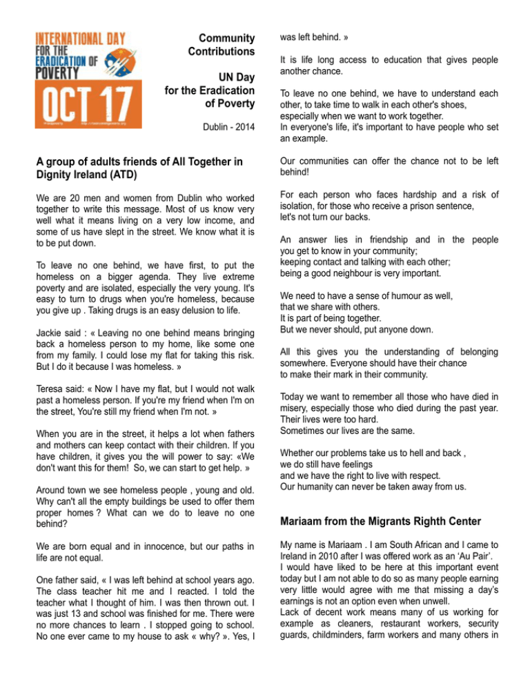 Community Contributions UN Day for the Eradication of Poverty Dublin - 2014 was left behind. » It is life long access to education that gives people another chance. To leave no one behind, we have to understand each other, to take time to walk in each other's shoes, especially when we want to work together. In everyone's life, it's important to have people who set an example. A group of adults friends of All Together in Dignity Ireland (ATD) Our communities can offer the chance not to be left behind! We are 20 men and women from Dublin who worked together to write this message. Most of us know very well what it means living on a very low income, and some of us have slept in the street. We know what it is to be put down. For each person who faces hardship and a risk of isolation, for those who receive a prison sentence, let's not turn our backs. To leave no one behind, we have first, to put the homeless on a bigger agenda. They live extreme poverty and are isolated, especially the very young. It's easy to turn to drugs when you're homeless, because you give up . Taking drugs is an easy delusion to life. Jackie said : « Leaving no one behind means bringing back a homeless person to my home, like some one from my family. I could lose my flat for taking this risk. But I do it because I was homeless. » Teresa said: « Now I have my flat, but I would not walk past a homeless person. If you're my friend when I'm on the street, You're still my friend when I'm not. » When you are in the street, it helps a lot when fathers and mothers can keep contact with their children. If you have children, it gives you the will power to say: «We don't want this for them! So, we can start to get help. » Around town we see homeless people , young and old. Why can't all the empty buildings be used to offer them proper homes ? What can we do to leave no one behind? We are born equal and in innocence, but our paths in life are not equal. One father said, « I was left behind at school years ago. The class teacher hit me and I reacted. I told the teacher what I thought of him. I was then thrown out. I was just 13 and school was finished for me. There were no more chances to learn . I stopped going to school. No one ever came to my house to ask « why? ». Yes, I An answer lies in friendship and in the people you get to know in your community; keeping contact and talking with each other; being a good neighbour is very important. We need to have a sense of humour as well, that we share with others. It is part of being together. But we never should, put anyone down. All this gives you the understanding of belonging somewhere. Everyone should have their chance to make their mark in their community. Today we want to remember all those who have died in misery, especially those who died during the past year. Their lives were too hard. Sometimes our lives are the same. Whether our problems take us to hell and back , we do still have feelings and we have the right to live with respect. Our humanity can never be taken away from us. Mariaam from the Migrants Righth Center My name is Mariaam . I am South African and I came to Ireland in 2010 after I was offered work as an ‘Au Pair’. I would have liked to be here at this important event today but I am not able to do so as many people earning very little would agree with me that missing a day’s earnings is not an option even when unwell. Lack of decent work means many of us working for example as cleaners, restaurant workers, security guards, childminders, farm workers and many others in unregulated sectors find ourselves working most of our their lives and live a very modest life. We only spend when it is really necessary but despite this, many of us remain poor and struggling to make ends meet. As an Au Pair • I worked full time hours as a childminder and housekeeper. • I worked 68-70hrs a week (starting at 7am till 9pm), 6 days a week. • I did, cleaning, hoovering, mopping, laundry, preparing meals and school runs. • I did deep cleaning of the full three storey house all day every Saturday without having eaten a thing. • I was being paid €400 monthly • I was lonely and had no knowledge of where to go to get information about my rights as a worker. • My work was not secure as working and living in someone’s home means they have the power to treat you the way they like, while you live in fear of having nowhere to go if they decided to kick you out for challenging them or their ill treatment of you. I managed to leave my exploitative employer half a year later and today I am in college studying , which is something that I have always wished to do all my life. However that also means I have to work part time to be able to feed myself, to pay my rent, pay bills and afford transport to college. I work outside my study hours, 18 hours a week .As a migrant here without a long term residence status; I am not entitled to any access to cheaper accommodation or access to affordable primary healthcare even if my overall income is about €700 a month. Living in poverty most of my life has had an impact on my outlook of life, I always worry about day to day costs and makes me live in fear of the unknown if I were to lose my current income. This is a story of many other people and low wage workers like me or those who earn below the minimum wage doing work that is not valued by many yet so valuable in the society. The kind of life these people have is not quality life but just enough for us to breathe from day to day. And that is very sad it is still happening today. However living in poverty like this does not break us, I know for certain that this gives us an opportunity to come together and demand a better and fairer society where we all have a place, we are all valued, and we are all respected and have a decent living wage. It’s not enough to survive; we should all have a right to thrive. Thank you for allowing me to contribute today. Liam from North West 