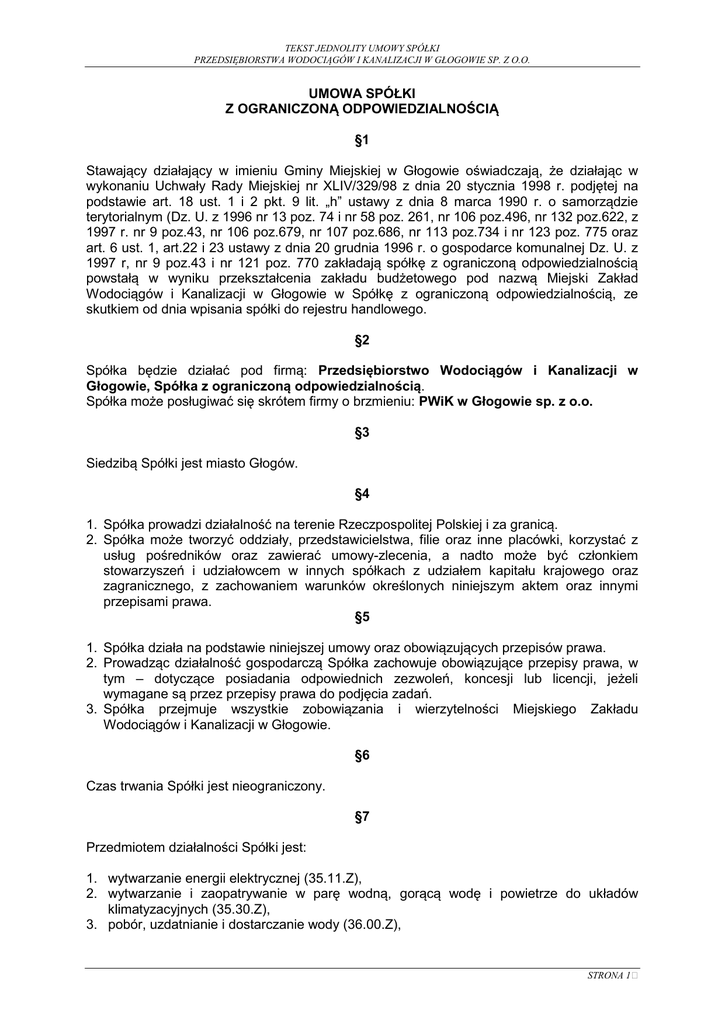 TEKST JEDNOLITY UMOWY SPÓŁKI PRZEDSIĘBIORSTWA WODOCIĄGÓW I KANALIZACJI W GŁOGOWIE SP. Z O.O. UMOWA SPÓŁKI Z OGRANICZONĄ ODPOWIEDZIALNOŚCIĄ §1 Stawający działający w imieniu Gminy Miejskiej w Głogowie oświadczają, że działając w wykonaniu Uchwały Rady Miejskiej nr XLIV/329/98 z dnia 20 stycznia 1998 r. podjętej na podstawie art. 18 ust. 1 i 2 pkt. 9 lit. „h” ustawy z dnia 8 marca 1990 r. o samorządzie terytorialnym (Dz. U. z 1996 nr 13 poz. 74 i nr 58 poz. 261, nr 106 poz.496, nr 132 poz.622, z 1997 r. nr 9 poz.43, nr 106 poz.679, nr 107 poz.686, nr 113 poz.734 i nr 123 poz. 775 oraz art. 6 ust. 1, art.22 i 23 ustawy z dnia 20 grudnia 1996 r. o gospodarce komunalnej Dz. U. z 1997 r, nr 9 poz.43 i nr 121 poz. 770 zakładają spółkę z ograniczoną odpowiedzialnością powstałą w wyniku przekształcenia zakładu budżetowego pod nazwą Miejski Zakład Wodociągów i Kanalizacji w Głogowie w Spółkę z ograniczoną odpowiedzialnością, ze skutkiem od dnia wpisania spółki do rejestru handlowego. §2 Spółka będzie działać pod firmą: Przedsiębiorstwo Wodociągów i Kanalizacji w Głogowie, Spółka z ograniczoną odpowiedzialnością. Spółka może posługiwać się skrótem firmy o brzmieniu: PWiK w Głogowie sp. z o.o. §3 Siedzibą Spółki jest miasto Głogów. §4 1. Spółka prowadzi działalność na terenie Rzeczpospolitej Polskiej i za granicą. 2. Spółka może tworzyć oddziały, przedstawicielstwa, filie oraz inne placówki, korzystać z usług pośredników oraz zawierać umowy-zlecenia, a nadto może być członkiem stowarzyszeń i udziałowcem w innych spółkach z udziałem kapitału krajowego oraz zagranicznego, z zachowaniem warunków określonych niniejszym aktem oraz innymi przepisami prawa. §5 1. Spółka działa na podstawie niniejszej umowy oraz obowiązujących przepisów prawa. 2. Prowadząc działalność gospodarczą Spółka zachowuje obowiązujące przepisy prawa, w tym – dotyczące posiadania odpowiednich zezwoleń, koncesji lub licencji, jeżeli wymagane są przez przepisy prawa do podjęcia zadań. 3. Spółka przejmuje wszystkie zobowiązania i wierzytelności Miejskiego Zakładu Wodociągów i Kanalizacji w Głogowie. §6 Czas trwania Spółki jest nieograniczony. §7 Przedmiotem działalności Spółki jest: 1. wytwarzanie energii elektrycznej (35.11.Z), 2. wytwarzanie i zaopatrywanie w parę wodną, gorącą wodę i powietrze do układów klimatyzacyjnych (35.30.Z), 3. pobór, uzdatnianie i dostarczanie wody (36.00.Z), STRONA 1 TEKST JEDNOLITY UMOWY SPÓŁKI PRZEDSIĘBIORSTWA WODOCIĄGÓW I KANALIZACJI W GŁOGOWIE SP. Z O.O. odprowadzanie i oczyszczanie ścieków (37.00.Z), zbieranie odpadów innych niż niebezpieczne (38.11.Z), obróbka i usuwanie odpadów innych niż niebezpieczne (38.21.Z), działalność związana z rekultywacją i pozostała działalność usługowa związana z gospodarką odpadami (39.00.Z), 8. roboty związane z budową rurociągów przesyłowych i sieci rozdzielczych (42.21.Z), 9. roboty związane z budową obiektów inżynierii wodnej (42.91.Z), 10. roboty związane z budową pozostałych obiektów inżynierii lądowej i wodnej, gdzie indziej niesklasyfikowane (42.99.Z), 11. wykonywanie instalacji wodno-kanalizacyjnych, cieplnych, gazowych i klimatyzacyjnych (43.22.Z), 12. wykonywanie pozostałych instalacji budowlanych (43.29.Z), 13. pozostałe specjalistyczne roboty budowlane, gdzie indziej niesklasyfikowane (43.99.Z), 14. sprzedaż hurtowa niewyspecjalizowana (46.90.Z), 15. pozostała sprzedaż detaliczna prowadzona poza siecią sklepową, straganami i targowiskami (47.99.Z), 16. przetwarzanie danych; zarządzanie stronami internetowymi (hosting) i podobna działalność (63.11.Z), 17. kupno i sprzedaż nieruchomości na własny rachunek (68.10.Z), 18. wynajem i zarządzanie nieruchomościami własnymi lub dzierżawionymi (68.20.Z), 19. działalność rachunkowo-księgowa; doradztwo podatkowe (69.20.Z), 20. pozostałe doradztwo w zakresie prowadzenia działalności gospodarczej i zarządzania (70.22.Z), 21. działalność w zakresie inżynierii i związane z nią doradztwo techniczne (71.12.Z), 22. pozostałe badania i analizy techniczne (71.20.B), 23. pośrednictwo w sprzedaży czasu i miejsca na cele reklamowe w pozostałych mediach (73.12.D), 24. wynajem i dzierżawa maszyn i urządzeń budowlanych (77.32.Z), 25. wynajem i dzierżawa maszyn i urządzeń biurowych, włączając komputery (77.33.Z), 26. dzierżawa własności intelektualnej i podobnych produktów, z wyłączeniem prac chronionych prawem autorskim (77.40.Z), 27. działalność związana z organizacją targów, wystaw i kongresów (82.30.Z), 28. pozostała działalność wspomagająca prowadzenie działalności gospodarczej, gdzie indziej niesklasyfikowana (82.99.Z) 4. 5. 6. 7. §8 1. 2. 3. 4. Fundusz zasadniczy jednostki i wynik nie podzielony zakładu wg bilansu zamknięcia Miejskiego Zakładu Wodociągów i Kanalizacji w Głogowie, stanowią kapitał własny Spółki. Składniki mienia zakładu budżetowego przekształconego w spółkę stają się majątkiem spółki. Kapitał zakładowy Spółki wynosi 92.057.900 zł (dziewięćdziesiąt dwa miliony pięćdziesiąt siedem tysięcy dziewięćset złotych) i dzieli się na 920.579 (dziewięćset dwadzieścia tysięcy pięćset siedemdziesiąt dziewięć) równych udziałów o wartości nominalnej 100 (sto) złotych każdy. Wszystkie udziały po przekształceniu obejmuje Gmina Miejska Głogów i pokrywa je aportem w postaci składników mienia zakładu budżetowego zgodnie z art. 23 ustawy o gospodarce komunalnej z dnia 20 grudnia 1996 roku (Dz. U. Nr 9 poz. 43 z 1997). Wspólnikami Spółki są: a) Gmina Miejska Głogów, posiadająca 466 868 (słownie: czterysta sześćdziesiąt sześć tysięcy osiemset sześćdziesiąt osiem) udziałów po 100 (słownie: sto) złotych każdy, o łącznej wartości 46 686 800 (słownie: czterdzieści sześć milionów STRONA 2 T