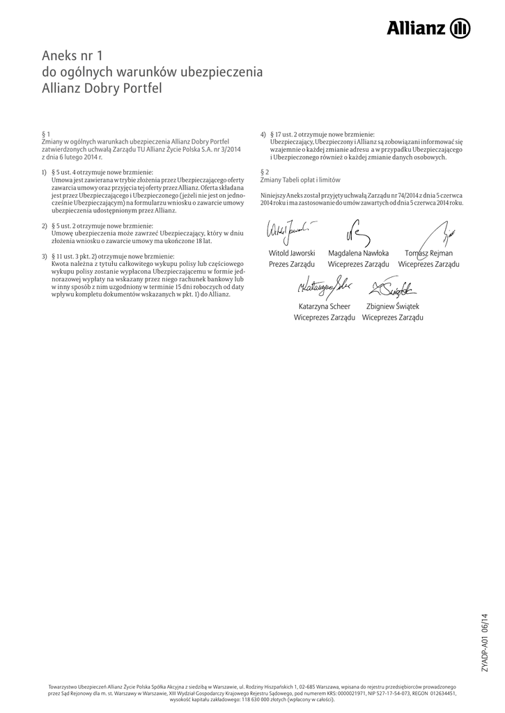 Aneks nr 1 do ogólnych warunków ubezpieczenia Allianz Dobry Portfel §1 Zmiany w ogólnych warunkach ubezpieczenia Allianz Dobry Portfel zatwierdzonych uchwałą Zarządu TU Allianz Życie Polska S.A. nr 3/2014 z dnia 6 lutego 2014 r. 4) § 17 ust. 2 otrzymuje nowe brzmienie: Ubezpieczający, Ubezpieczony i Allianz są zobowiązani informować się wzajemnie o każdej zmianie adresu a w przypadku Ubezpieczającego i Ubezpieczonego również o każdej zmianie danych osobowych. 1) § 5 ust. 4 otrzymuje nowe brzmienie: Umowa jest zawierana w trybie złożenia przez Ubezpieczającego oferty zawarcia umowy oraz przyjęcia tej oferty przez Allianz. Oferta składana jest przez Ubezpieczającego i Ubezpieczonego (jeżeli nie jest on jednocześnie Ubezpieczającym) na formularzu wniosku o zawarcie umowy ubezpieczenia udostępnionym przez Allianz. §2 Zmiany Tabeli opłat i limitów Niniejszy Aneks został przyjęty uchwałą Zarządu nr 74/2014 z dnia 5 czerwca 2014 roku i ma zastosowanie do umów zawartych od dnia 5 czerwca 2014 roku. 2) § 5 ust. 2 otrzymuje nowe brzmienie: Umowę ubezpieczenia może zawrzeć Ubezpieczający, który w dniu złożenia wniosku o zawarcie umowy ma ukończone 18 lat. 3) § 11 ust. 3 pkt. 2) otrzymuje nowe brzmienie: Kwota należna z tytułu całkowitego wykupu polisy lub częściowego wykupu polisy zostanie wypłacona Ubezpieczającemu w formie jednorazowej wypłaty na wskazany przez niego rachunek bankowy lub w inny sposób z nim uzgodniony w terminie 15 dni roboczych od daty wpływu kompletu dokumentów wskazanych w pkt. 1) do Allianz. Witold Jaworski Prezes Zarządu Magdalena Nawłoka Wiceprezes Zarządu Tomasz Rejman Wiceprezes Zarządu ZYADP-A01 06/14 Zbigniew Świątek Katarzyna Scheer Wiceprezes Zarządu Wiceprezes Zarządu Towarzystwo Ubezpieczeń Allianz Życie Polska Spółka Akcyjna z siedzibą w Warszawie, ul.– Rodziny 1 – Hiszpańskich 1, 02-685 Warszawa, wpisana do rejestru przedsiębiorców prowadzonego przez Sąd Rejonowy dla m. st. Warszawy w Warszawie, XIII Wydział Gospodarczy Krajowego Rejestru Sądowego, pod numerem KRS: 0000021971, NIP 527-17-54-073, REGON 012634451, wysokość kapitału zakładowego: 118 630 000 złotych (wpłacony w całości).
