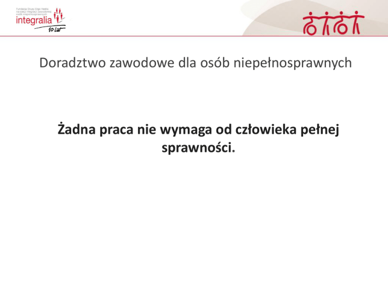 Doradztwo zawodowe dla osób niepełnosprawnych Żadna praca nie wymaga od człowieka pełnej sprawności. Orzekanie o niepełnosprawności Podstawą uznania osoby, która nie ukończyła 16 roku życia za niepełnosprawną (bez określania stopnia) jest ustalenie, że: - ma naruszoną sprawność fizyczną lub psychiczną; - przewidywany okres trwania upośledzenia stanu zdrowia przekracza 12 m-cy - wymaga zapewnienia jej całkowitej opieki lub pomocy w zaspokajaniu podstawowych potrzeb życiowych w sposób przewyższający wsparcie potrzebne osobie w danym wieku z powodu wady wrodzonej, długotrwałej choroby lub uszkodzenia organizmu. Uwaga: Wszystkie wymienione przesłanki muszą wystąpić łącznie. Stopnie niepełnosprawności* Do celów pozarentowych Do celów rentowych Powiatowe zespoły ds. orzekania o niepełnosprawności ZUS Stopień lekki Częściowa niezdolność do pracy Stopień umiarkowany Całkowita niezdolność do pracy Stopień znaczny Całkowita niezdolność do pracy i samodzielnej egzystencji * dla osób powyżej 16-tego roku życia *Zaliczenie do znacznego lub umiarkowanego stopnia niepełnosprawności osoby zainteresowanej, nie wyklucza możliwości zatrudnienia tej osoby u pracodawcy niezapewniającego warunków pracy chronionej w przypadkach: 1. przystosowania przez pracodawcę stanowiska pracy do potrzeb osoby niepełnosprawnej, 2. zatrudnienia w formie telepracy. *art. 4 ust. 5 Ustawy z dnia 27 sierpnia 1997 r. o rehabilitacji zawodowej i społecznej oraz zatrudnianiu osób niepełnosprawnych. (t.j. Dz.U. z 2011 r. nr 127, poz. 721 ze zm.) O braku przeciwwskazań zdrowotnych do wykonywania pracy na danym stanowisku decyduje lekarz medycyny pracy! Przyczyny niepełnosprawności 01 -U – upośledzenie umysłowe; 02 -P – choroby psychiczne; 03 -L – zaburzenia głosu, mowy i choroby słuchu; 04 -O – choroby narządu wzroku; 05 -R – upośledzenie narządu ruchu; 06 -E – epilepsja; 07 -S – choroby układu oddechowego i krążenia; 08 -T – choroby układu pokarmowego; 09 -M – choroby układu moczowo - płciowego; 10 -N – choroby neurologiczne; 11 -I – inne, w tym schorzenia: endokrynologiczne, metaboliczne, zaburzenia enzymatyczne, choroby zakaźne i odzwierzęce, zeszpecenia, choroby układu krwiotwórczego; 12 -C – całościowe zaburzenia rozwojowe Edukacja czy praca? Aktywność ekonomiczna osób z niepełnosprawnością w wieku 15 lat i więcej w roku 2014 dane BAEL 70 osoby sprawne 60,8 60 osoby niepełnosprawne 55,5 50 40 30 20 17,4 14,8 14,8 8,8 10 0 współczynnik aktywności zawodowej wskaźnik zatrudnienia stopa bezrobocia Struktura wykształcenia osób sprawnych i niepełnosprawnych prawnie w roku 2014 dane BAEL 35,0 Osoby sprawne 32,1 32,0 Osoby niepełnosprawne prawnie 30,0 25,0 23,3 23,7 23,2 20,2 19,1 20,0 15,0 10,7 10,0 8,2 7,5 5,0 0,0 Wyższe policealne i średnie zawodowe średnie ogólnokształcące zasadnicze zawodowe gimnazjalne, podstawowe, niepełne podstawowe i bez wykształcenia Aktywność ekonomiczna osób niepełnosprawnych w wieku produkcyjnym według wykształcenia I kw. 2015 dane BAEL 57,9 współczynnik aktywności zawodowej wskaźnik zatrudnienia stopa bezrobocia 51,9 34,6 32,6 28,9 26,5 26,2 22,3 19,6 16,3 17,9 15,3 9,6 Wyższe Policealne i średnie zawodowe Średnie ogólnokształcące Zasadnicze zawodowe 13,6 11,1 Gimnazjum, podstawowe i niepełne podstawowe Diagnoza pozytywna czy negatywna? Diagnoza pozytywna czy negatywna? W doradztwie ważną rolę odgrywa: • diagnoza lekarska, przebieg rehabilitacji medycznej, rokowanie, przeciwwskazania do pracy zawodowej, • ocena ogólnej wydolności fizycznej i możliwości psychofizycznych, (co i w jakim zakresie). • własna ocena możliwości podjęcia pracy, • motywacje, • kwalifikacje i predyspozycje zawodowe, • zainteresowania, • cechy osobowości itp. O przeciwwskazaniach : W. Kreft i in., Zeszyty Informacyjno – Metodyczne Doradcy Zawodowego „Podręcznik oceny zawodu z punktu widzenia różnego rodzaju niepełnosprawności”, KUP, Warszawa 2000 G. Sołtysińska „ABC doradcy zawodowego. Poradnictwo zawodowe dla osób niepełnosprawnych. Materiały dla szkolnego doradcy zawodowego”, KOWEZiU, Warszawa 2010 http://www.kwalifikacje.praca.gov.pl/ Jak poruszać się po rynku pracy z orzeczeniem o niepełnosprawności: Otwarty czy chroniony rynek pracy? Czy umieszczać informacje w cv? Kiedy powiedzieć o niepełnosprawności? Jak mówić o niepełnosprawności? więcej: http://www.mamwyzwanie.pl/category/wpisy-ekspertow/ Wsparcie w zakresie edukacji i zatrudnienia Korzyści finansowe dla pracodawcy: miesięczne dofinansowanie do wynagrodzenia pracownika niepełnosprawnego Stopień niepełnosprawności znaczny umiarkowany lekki Schorzenie Kwota dofinansowania od 04.2014 r. ze schorzeniem specjalnym 2 400 zł bez schorzenia specjalnego 1 800 zł ze schorzeniem specjalnym 1 725 zł bez schorzenia specjalnego 1 125 zł ze schorzeniem specjalnym 1 050 zł bez schorzenia specjalnego 450 zł Schorzenia specjalne: choroba psychiczna, upośledzenie umysłowe, całościowe zaburzenia rozwojowe, epilepsja lub osoby niewidome. Wsparcie w zakresie edukacji i zatrudnienia Korzyści finansowe c.d. zwrot kosztów przystosowanie stanowiska pracy zwrot kosztów wyposażenia stanowiska pracy osoby niepełnosprawnej zwrot kosztów szkolenia pracownika niepełnosprawnego zwrot kosztów zatrudnienia pracownika pomagającego pracownikowi niepełnosprawnemu w pracy zwolnienie z wpłat na PFRON Korzyści pozafinansowe dla pracodawcy: wysoka motywacja do pracy zaangażowanie sumienność lojalność pracowitość wzrost wydajności i redukcja kosztów pozytywny wizerunek w społeczeństwie połączenie biznesu z odpowiedzialnością społeczną Wsparcie w zakresie edukacji i zatrudnienia: Przyznanie środków na podjęcie działalności gospodarczej, rolniczej albo wniesienie wkładu do spółdzielni socjalnej: • Powiatowy Urząd Pracy w Gdańsku • Gdyńskie Centrum 