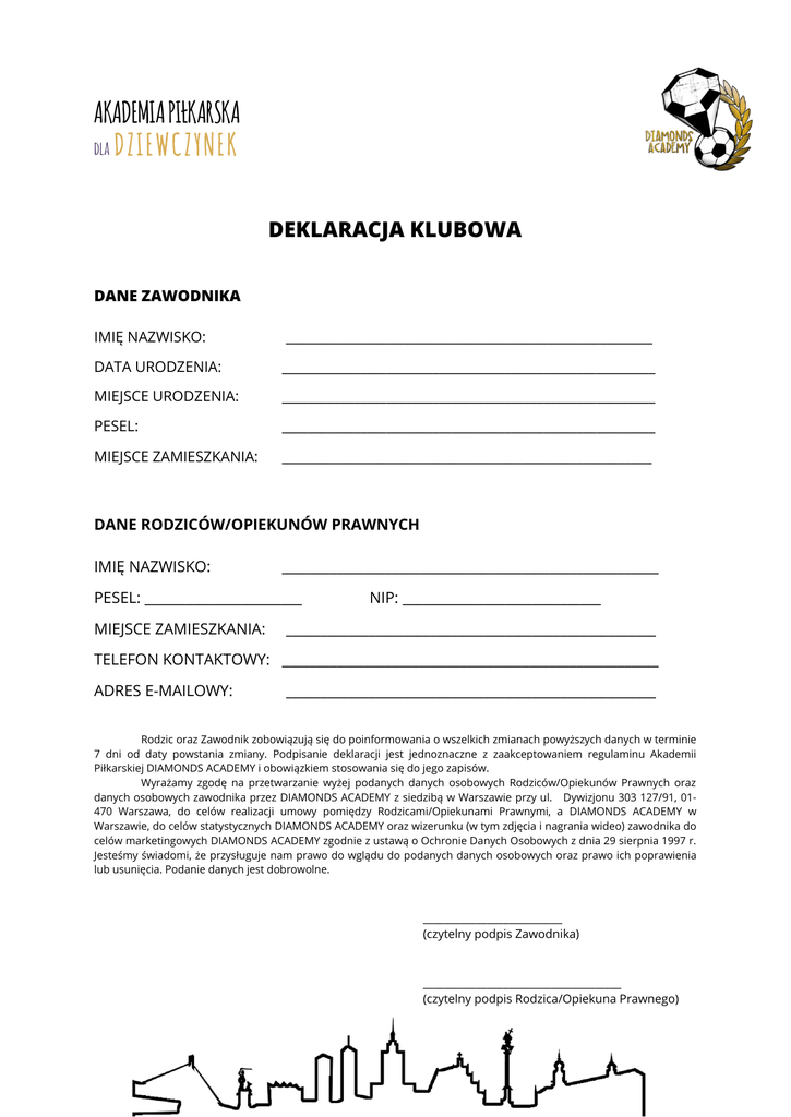 AKADEMIA PIŁKARSKA dla DZIEWCZYNEK DEKLARACJA KLUBOWA DANE ZAWODNIKA IMIĘ NAZWISKO: ________________________________________________________ DATA URODZENIA: _________________________________________________________ MIEJSCE URODZENIA: _________________________________________________________ PESEL: _________________________________________________________ MIEJSCE ZAMIESZKANIA: ______________________________________________________ DANE RODZICÓW/OPIEKUNÓW PRAWNYCH IMIĘ NAZWISKO: _______________________________________________________ PESEL: _______________________ MIEJSCE ZAMIESZKANIA: NIP: _____________________________ ______________________________________________________ TELEFON KONTAKTOWY: _______________________________________________________ ADRES E-MAILOWY: ______________________________________________________ Rodzic oraz Zawodnik zobowiązują się do poinformowania o wszelkich zmianach powyższych danych w terminie 7 dni od daty powstania zmiany. Podpisanie deklaracji jest jednoznaczne z zaakceptowaniem regulaminu Akademii Piłkarskiej DIAMONDS ACADEMY i obowiązkiem stosowania się do jego zapisów. Wyrażamy zgodę na przetwarzanie wyżej podanych danych osobowych Rodziców/Opiekunów Prawnych oraz danych osobowych zawodnika przez DIAMONDS ACADEMY z siedzibą w Warszawie przy ul. Dywizjonu 303 127/91, 01470 Warszawa, do celów realizacji umowy pomiędzy Rodzicami/Opiekunami Prawnymi, a DIAMONDS ACADEMY w Warszawie, do celów statystycznych DIAMONDS ACADEMY oraz wizerunku (w tym zdjęcia i nagrania wideo) zawodnika do celów marketingowych DIAMONDS ACADEMY zgodnie z ustawą o Ochronie Danych Osobowych z dnia 29 sierpnia 1997 r. Jesteśmy świadomi, że przysługuje nam prawo do wglądu do podanych danych osobowych oraz prawo ich poprawienia lub usunięcia. Podanie danych jest dobrowolne. __________________________ (czytelny podpis Zawodnika) _____________________________________ (czytelny podpis Rodzica/Opiekuna Prawnego)