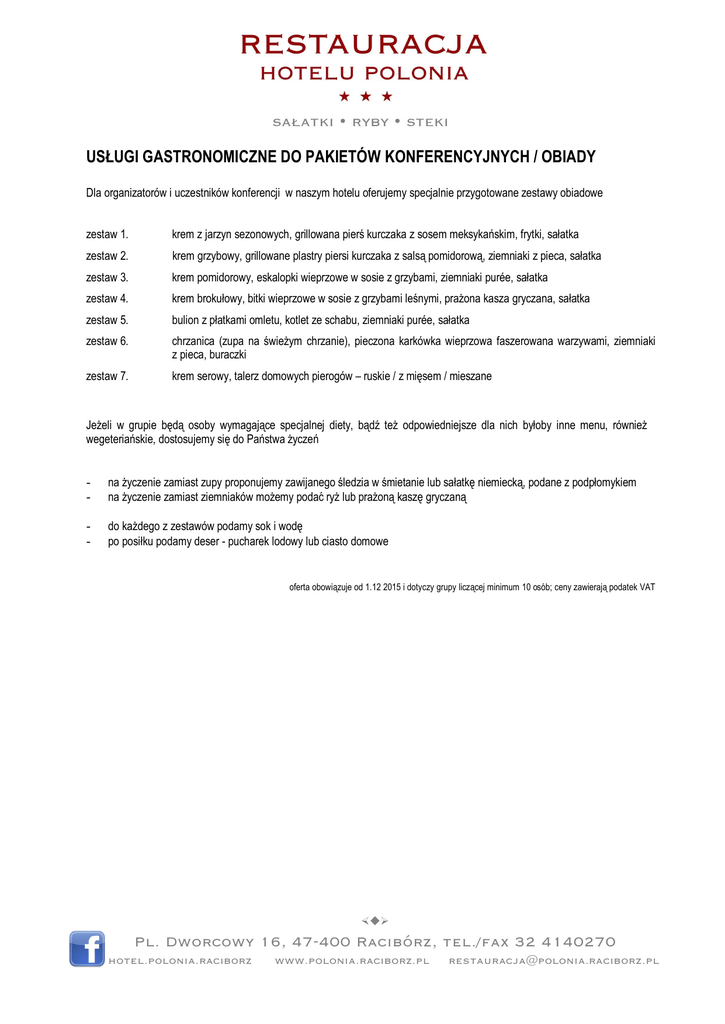USŁUGI GASTRONOMICZNE DO PAKIETÓW KONFERENCYJNYCH / OBIADY Dla organizatorów i uczestników konferencji w naszym hotelu oferujemy specjalnie przygotowane zestawy obiadowe zestaw 1. krem z jarzyn sezonowych, grillowana pierś kurczaka z sosem meksykańskim, frytki, sałatka zestaw 2. krem grzybowy, grillowane plastry piersi kurczaka z salsą pomidorową, ziemniaki z pieca, sałatka zestaw 3. krem pomidorowy, eskalopki wieprzowe w sosie z grzybami, ziemniaki purée, sałatka zestaw 4. krem brokułowy, bitki wieprzowe w sosie z grzybami leśnymi, prażona kasza gryczana, sałatka zestaw 5. bulion z płatkami omletu, kotlet ze schabu, ziemniaki purée, sałatka zestaw 6. chrzanica (zupa na świeżym chrzanie), pieczona karkówka wieprzowa faszerowana warzywami, ziemniaki z pieca, buraczki zestaw 7. krem serowy, talerz domowych pierogów – ruskie / z mięsem / mieszane Jeżeli w grupie będą osoby wymagające specjalnej diety, bądź też odpowiedniejsze dla nich byłoby inne menu, również wegeteriańskie, dostosujemy się do Państwa życzeń - na życzenie zamiast zupy proponujemy zawijanego śledzia w śmietanie lub sałatkę niemiecką, podane z podpłomykiem na życzenie zamiast ziemniaków możemy podać ryż lub prażoną kaszę gryczaną - do każdego z zestawów podamy sok i wodę po posiłku podamy deser - pucharek lodowy lub ciasto domowe oferta obowiązuje od 1.12 2015 i dotyczy grupy liczącej minimum 10 osób; ceny zawierają podatek VAT ×uØ Pl. Dworcowy 16, 47-400 Racibórz, tel./fax 32 4140270 hotel.polonia.raciborz www.polonia.raciborz.pl [email protected]