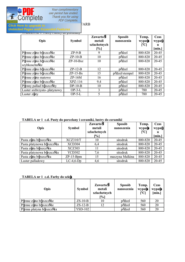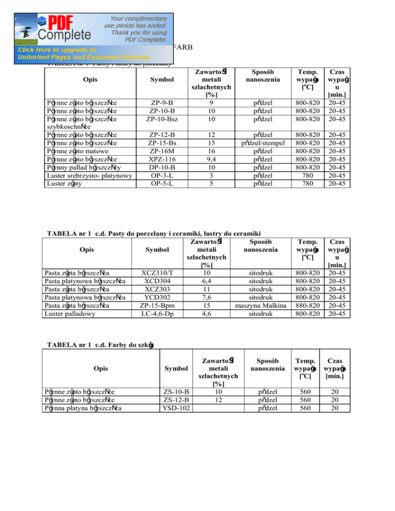 SPECYFIKACJA FARB TABELA nr 1 Farby i lustry do porcelany Sposób nanoszenia Temp. wypału [oC] ZP-9-B ZP-10-B ZP-10-Bsz Zawartość metali szlachetnych [%] 9 10 10 pędzel pędzel pędzel 800-820 800-820 800-820 Czas wypał u [min.] 20-45 20-45 20-45 ZP-12-B ZP-15-Bs ZP-16M XPZ-116 DP-10-B OP-3-L OP-5-L 12 15 16 9,4 10 3 5 pędzel pędzel/stempel pędzel pędzel pędzel pędzel pędzel 800-820 800-820 800-820 800-820 800-820 780 780 20-45 20-45 20-45 20-45 20-45 20-45 20-45 Temp. wypału [oC] Czas wypał u [min.] 20-45 20-45 20-45 20-45 20-45 20-45 Opis Symbol Płynne złoto błyszczące Płynne złoto błyszczące Płynne złoto błyszczące szybkoschnące Płynne złoto błyszczące Płynne złoto błyszczące Płynne złoto matowe Płynne złoto błyszczące Płynny pallad błyszczący Luster srebrzysto- platynowy Luster złoty TABELA nr 1 c.d. Pasty do porcelany i ceramiki, lustry do ceramiki Zawartość Sposób Opis Symbol metali nanoszenia szlachetnych [%] Pasta złota błyszcząca XCZ310/T 10 sitodruk Pasta platynowa błyszcząca XCD304 6,4 sitodruk Pasta złota błyszcząca XCZ303 11 sitodruk Pasta platynowa błyszcząca YCD302 7,6 sitodruk Pasta złota błyszcząca ZP-15-Bpm 15 maszyna Malkina Luster palladowy LC-4,6-Dp 4,6 sitodruk 800-820 800-820 800-820 800-820 880-820 800-820 TABELA nr 1 c.d. Farby do szkła Opis Płynne złoto błyszczące Płynne złoto błyszczące Płynna platyna błyszcząca Symbol ZS-10-B ZS-12-B YSD-102 Zawartość metali szlachetnych [%] 10 12 Sposób nanoszenia pędzel pędzel pędzel Temp. Czas wypału wypału [oC] [min.] 560 560 560 20 20 20