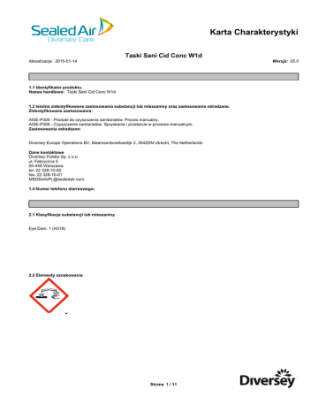 Karta Charakterystyki Taski Sani Cid Conc W1d Wersja: 05.0 Aktualizacja: 2015-01-14 1.1 Identyfikator produktu. Nazwa handlowa: Taski Sani Cid Conc W1d 1.2 Istotne zidentyfikowane zastosowania substancji lub mieszaniny oraz zastosowania odradzane. Zidentyfikowane zastosowania: AISE-P305 - Produkt do czyszczenia sanitariatów. Proces manualny. AISE-P306 - Czyszczenie sanitariatów. Spryskanie i przetarcie w procesie manualnym. Zastosowania odradzane: Diversey Europe Operations BV, Maarssenbroeksedijk 2, 3542DN Utrecht, The Netherlands Dane kontaktowe Diversey Polska Sp. z o.o ul. Fabryczna 5 00-446 Warszawa tel. 22 328-10-00 fax. 22 328-10-01 [email protected] 1.4 Numer telefonu alarmowego: 2.1 Klasyfikacja substancji lub mieszaniny Eye Dam. 1 (H318) 2.2 Elementy oznakowania Strona 1 / 11 KARTA CHARAKTERYSTYKI Taski Sani Cid Conc W1d XIII. 3.2 Mieszaniny Numer WE kwas cytrynowy monohydrat Numer CAS Numer REACH 201-069-1 5949-29-1 01-2119457026-42 Polymer* 69011-36-5 [4] powierzchniowo czynne (alkohol (C13) etoksylowany (8-9EO)) * Polimer. Wdychanie Kontakt z oczami: pierwszej pomocy: Wdychanie: Kontakt z oczami: substancji, patrz sekcja 11. alkoholu. Strona 2 / 11 Klasyfikacja zgodna z (WE) 1272/2008 Eye Irrit. 2 (H319) Klasyfikacja Acute Tox. 4 (H302) Eye Dam. 1 (H318) Xn;R22 Xi;R41 Xi;R36 Uwagi Procent wagowy 20-30 10-20 KARTA CHARAKTERYSTYKI Taski Sani Cid Conc W1d 6.4 Odniesienia do innych sekcji pojemniku. Zalecane procedury monitorowania: krótkoterminowe skutki miejscowe kwas cytrynowy monohydrat - krótkoterminowe skutki ogólnoustrojowe - etoksylowany (8-9EO)) danych danych krótkoterminowe skutki miejscowe krótkoterminowe skutki ogólnoustrojowe (mg / kg mc) - kwas cytrynowy monohydrat danych etoksylowany (8-9EO)) danych krótkoterminowe skutki miejscowe krótkoterminowe skutki ogólnoustrojowe (mg / kg mc) - danych etoksylowany (8-9EO)) - skutki ogólnoustrojowe - danych danych skutki miejscowe skutki ogólnoustrojowe (mg / kg mc) - danych danych kwas cytrynowy monohydrat skutki miejscowe danych danych skutki miejscowe skutki ogólnoustrojowe (mg / kg mc) - danych danych danych krótkoterminowe skutki miejscowe danych danych skutki miejscowe - skutki ogólnoustrojowe - danych danych 3) kwas cytrynowy monohydrat - krótkoterminowe skutki ogólnoustrojowe - etoksylowany (8-9EO)) danych danych 3) Strona 3 / 11 KARTA CHARAKTERYSTYKI Taski Sani Cid Conc W1d krótkoterminowe skutki miejscowe kwas cytrynowy monohydrat - krótkoterminowe skutki ogólnoustrojowe - etoksylowany (8-9EO)) danych danych Wody powierzchniowe, (mg / l) kwas cytrynowy monohydrat 0.44 etoksylowany (8-9EO)) - skutki ogólnoustrojowe - danych danych Okresowe (mg / l) Oczyszczalnia 0.044 - 1000 danych danych danych danych W powietrzu (mg/m3) kwas cytrynowy monohydrat Osady morskie (mg / kg) 3.46 Gleba (mg / kg) (mg / kg) 34.6 33.1 - etoksylowany (8-9EO)) danych danych danych danych produktu: Okulary ochronne lub gogle (EN166). Ochrona oczu / twarzy: konieczna. Ochrona dróg oddechowych: roztworem roboczym produktu: 2 Ochrona oczu / twarzy: konieczna. Ochrona dróg oddechowych: Metoda / uwaga Barwa: Przejrzysty, Czerwony Zapach: Lekko perfumowany Próg zapachu Nie dotyczy pH: =< 2 Nie Strona 4 / 11 skutki miejscowe KARTA CHARAKTERYSTYKI Taski Sani Cid Conc W1d Dane dla substancji, temperatura wrzenia: Metoda (°C) kwas cytrynowy monohydrat 175 > 200 Metody nie podano Metody nie podano atmosferyczne (hPa) 1013 Metoda / uwaga Nie dotyczy. Podtrzymuje palenie: Nie dotyczy. Metoda / uwaga Metoda Temperatura (°C) Metody nie podano 20-25 (Pa) kwas cytrynowy monohydrat danych Zaniedbywalnie Metoda / uwaga 1.10 g/cm³ (20 °C) Metoda (g/l) 880 Rozpuszczalny. kwas cytrynowy monohydrat Metody nie podano Metody nie podano Temperatura (°C) 20 20 Metoda / uwaga 9.2. Inne informacje UN Manual of Tests and Criteria, section 37 Korozja metali: Nie powoduje korozji SEKCJA 11: Informacje toksykologiczne Strona 5 / 11 KARTA CHARAKTERYSTYKI Taski Sani Cid Conc W1d Dane mieszaniny: >2000 Punkt Gatunek: Metoda Mysz Szczur OECD 401 (EU B.1) OECD 423 (EU B.1 tris) Gatunek: Metoda Szczur Królik Metody nie podano Metody nie podano Gatunek: Metoda (mg / kg) kwas cytrynowy monohydrat LD 50 LD 50 5400 > 300 - 2000 Czas ekspozycji (h) - (8-9EO)) Punkt (mg / kg) kwas cytrynowy monohydrat LD 50 LD 50 > 2000 > 2000 Czas ekspozycji (h) - (8-9EO)) Punkt (mg / l) kwas cytrynowy monohydrat Brak Czas ekspozycji (h) - danych Brak (8-9EO)) danych Wynik kwas cytrynowy monohydrat Gatunek Królik Metoda OECD 404 (EU B.4) Czas ekspozycji Królik OECD 404 (EU B.4) Gatunek Królik Metoda OECD 405 (EU B.5) Królik Metody nie podano Gatunek Metoda Czas ekspozycji Gatunek Metoda Czas ekspozycji (h) - (8-9EO)) Wynik kwas cytrynowy monohydrat (8-9EO)) Czas ekspozycji uszkodzenie. Wynik kwas cytrynowy monohydrat danych. (8-9EO)) danych. Wynik kwas cytrynowy monohydrat Nie uczulajacy. Nie uczulajacy. Metody nie podano Metody nie podano (8-9EO)) Wynik Gatunek kwas cytrynowy monohydrat Metoda Czas ekspozycji - danych (8-9EO)) danych Wynik (in vitro) Metoda (in vitro) Metody nie kwas cytrynowy monohydrat Strona 6 / 11 Wynik (in vivo) Metoda (in vivo) Metody nie KARTA CHARAKTERYSTYKI Taski Sani Cid Conc W1d (alkohol (C13) etoksylowany (8-9EO)) genotoksycznego, negatywne wyniki podano genotoksycznego, negatywne wyniki podano Metody nie podano genotoksycznego, negatywne wyniki Metody nie podano Zmiana kwas cytrynowy monohydrat Punkt Specyficzny efekt Gatunek Metoda (mg / kg mc / d) Brak kwas cytrynowy monohydrat danych > 50 NOAEL Czas ekspozycji inne skutki Nie stwierdzono szkodliwego Szczur Nie wiadomo powierzchniowo czynne (alkohol (C13) etoksylowany (8-9EO)) Punkt Gatunek Metoda Szczur Metody nie podano Gatunek Metoda Czas ekspozycji (dni) - Gatunek Metoda Czas ekspozycji (dni) - (mg/kg bw/d) kwas cytrynowy monohydrat NOAEL 4000 Czas ekspozycji (dni) 5 Brak etoksylowany (8-9EO)) danych Punkt (mg/kg bw/d) kwas cytrynowy monohydrat Brak danych Brak etoksylowany (8-9EO)
