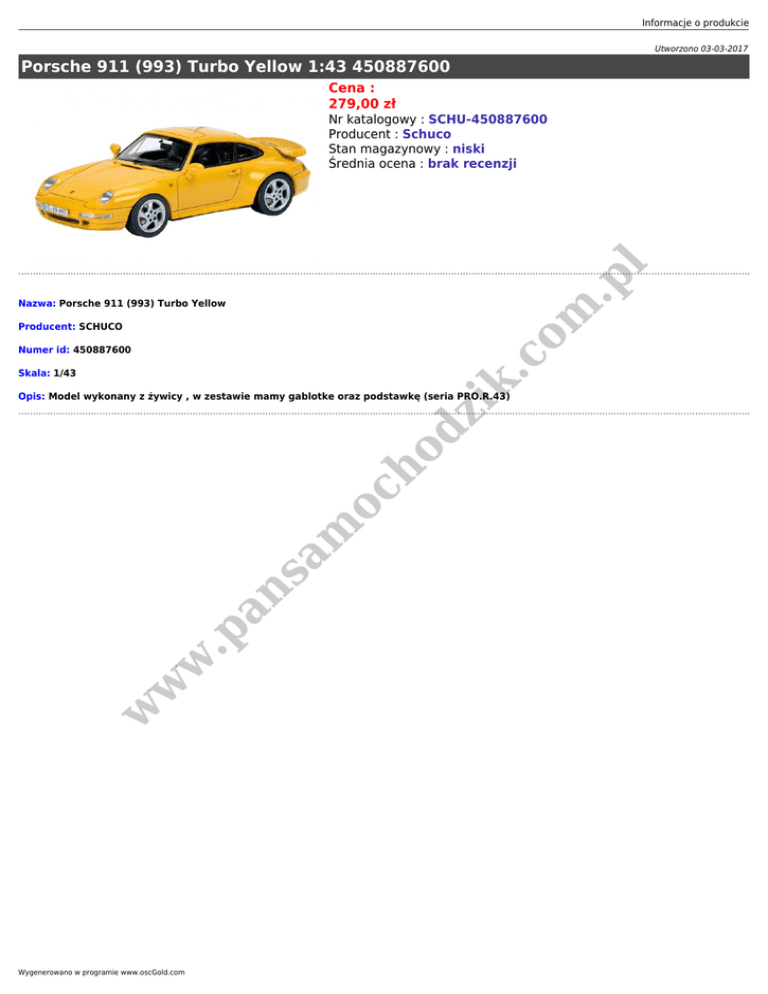 Informacje o produkcie Utworzono 03-03-2017 Porsche 911 (993) Turbo Yellow 1:43 450887600 Cena : 279,00 zł .p l Nr katalogowy : SCHU-450887600 Producent : Schuco Stan magazynowy : niski Średnia ocena : brak recenzji om Nazwa: Porsche 911 (993) Turbo Yellow Producent: SCHUCO .c Numer id: 450887600 dz ik Skala: 1/43 w w w .p an sa m oc ho Opis: Model wykonany z żywicy , w zestawie mamy gablotke oraz podstawkę (seria PRO.R.43) Wygenerowano w programie www.oscGold.com