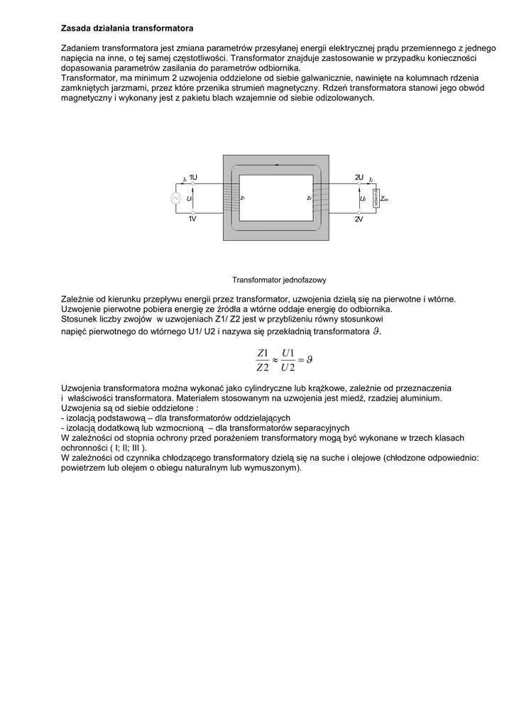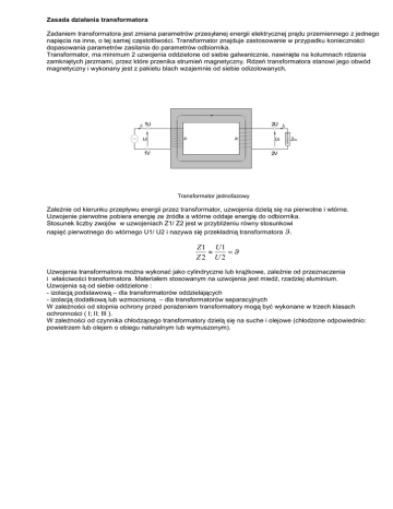 Zasada działania transformatora Zadaniem transformatora jest zmiana parametrów przesyłanej energii elektrycznej prądu przemiennego z jednego napięcia na inne, o tej samej częstotliwości. Transformator znajduje zastosowanie w przypadku konieczności dopasowania parametrów zasilania do parametrów odbiornika. Transformator, ma minimum 2 uzwojenia oddzielone od siebie galwanicznie, nawinięte na kolumnach rdzenia zamkniętych jarzmami, przez które przenika strumień magnetyczny. Rdzeń transformatora stanowi jego obwód magnetyczny i wykonany jest z pakietu blach wzajemnie od siebie odizolowanych. U1 z1 z2 1V U2 odbiornik 2U I2 I1 1U Zobc 2V Transformator jednofazowy Zależnie od kierunku przepływu energii przez transformator, uzwojenia dzielą się na pierwotne i wtórne. Uzwojenie pierwotne pobiera energię ze źródła a wtórne oddaje energię do odbiornika. Stosunek liczby zwojów w uzwojeniach Z1/ Z2 jest w przybliżeniu równy stosunkowi napięć pierwotnego do wtórnego U1/ U2 i nazywa się przekładnią transformatora J. Z1 U 1 » =J Z2 U2 Uzwojenia transformatora można wykonać jako cylindryczne lub krążkowe, zależnie od przeznaczenia i właściwości transformatora. Materiałem stosowanym na uzwojenia jest miedź, rzadziej aluminium. Uzwojenia są od siebie oddzielone : - izolacją podstawową – dla transformatorów oddzielających - izolacją dodatkową lub wzmocnioną – dla transformatorów separacyjnych W zależności od stopnia ochrony przed porażeniem transformatory mogą być wykonane w trzech klasach ochronności ( I; II; III ). W zależności od czynnika chłodzącego transformatory dzielą się na suche i olejowe (chłodzone odpowiednio: powietrzem lub olejem o obiegu naturalnym lub wymuszonym).