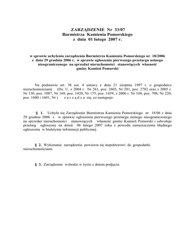 ZARZĄDZENIE Nr 33/07 Burmistrza Kamienia Pomorskiego z dnia 01 lutego 2007 r. w sprawie uchylenia zarządzenia Burmistrza Kamienia Pomorskiego nr 18/2006 z dnia 29 grudnia 2006 r. w sprawie ogłoszenia pierwszego przetargu ustnego nieograniczonego na sprzedaż nieruchomości stanowiących własność gminy Kamień Pomorski Na podstawie art. 38 ust. 4 ustawy z dnia 21 sierpnia 1997 r. o gospodarce nieruchomościami (Dz. U. z 2004 r. Nr 261, poz. 2603, Nr 281, poz. 2782 oraz z 2005 r. Nr 130, poz. 1087, Nr 169, poz. 1420, Nr 175, poz. 1459, z 2006 r. Nr 104, poz. 708, Nr 220, poz. 1600 i 1601, Nr ) z a r z ą d z a się, co następuje: § 1. Uchyla się Zarządzenie Burmistrza Kamienia Pomorskiego nr 18/06 z dnia 29 grudnia 2006 r. w sprawie ogłoszenia pierwszego przetargu ustnego nieograniczonego na sprzedaż nieruchomości stanowiących własność gminy Kamień Pomorski i odwołuje przetarg ogłoszony na dzień 06 lutego 2007 roku z powodu zamieszczenia błędnego ogłoszenia w biuletynie informacji publicznej. § 2. Wykonanie zarządzenia powierza się inspektorowi ds. gospodarki nieruchomościami. § 3. Zarządzenie wchodzi w życie z dniem podjęcia.